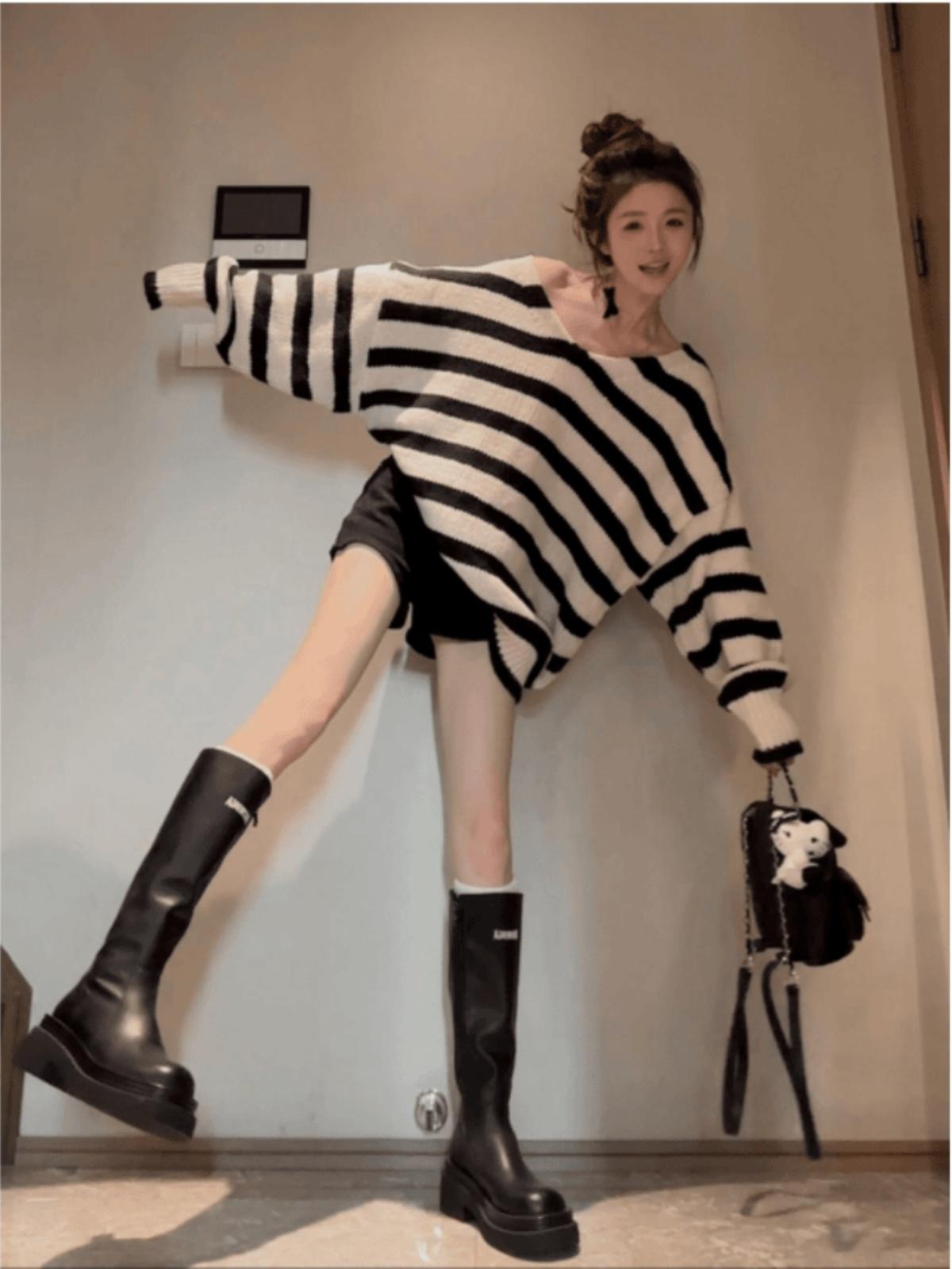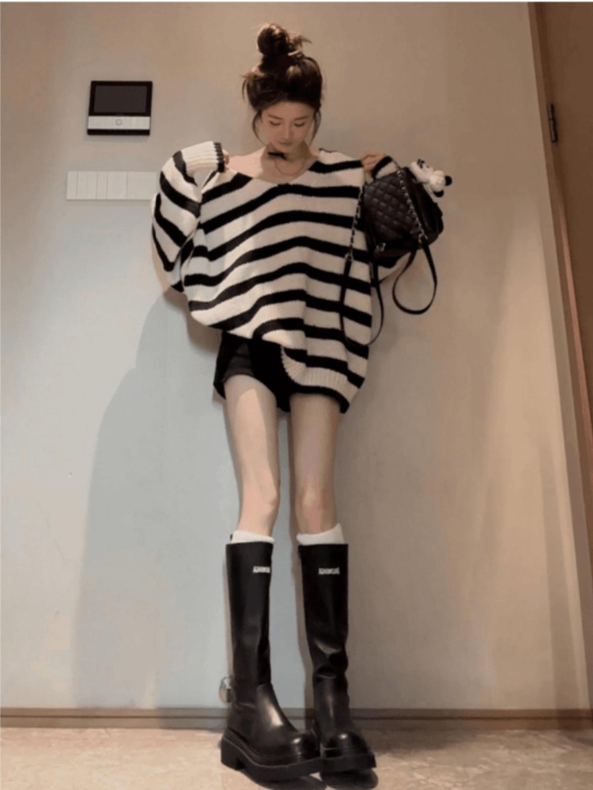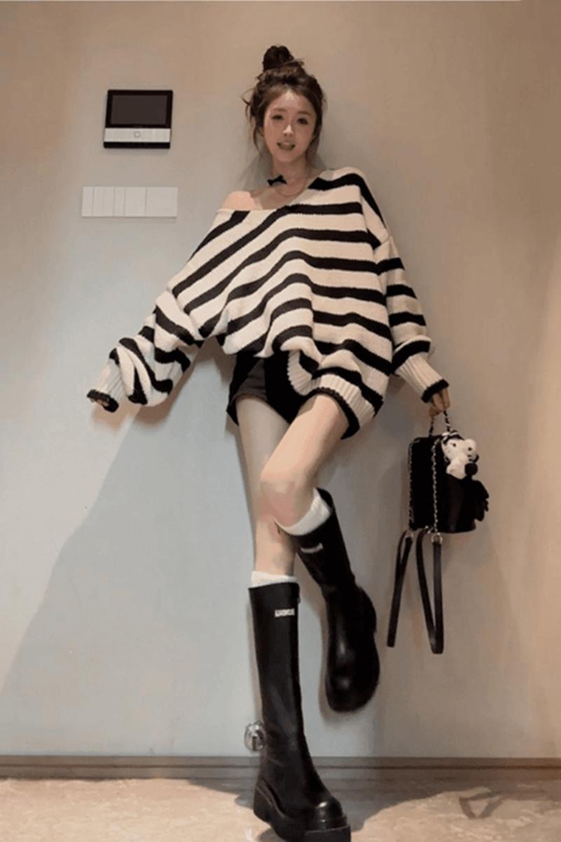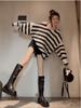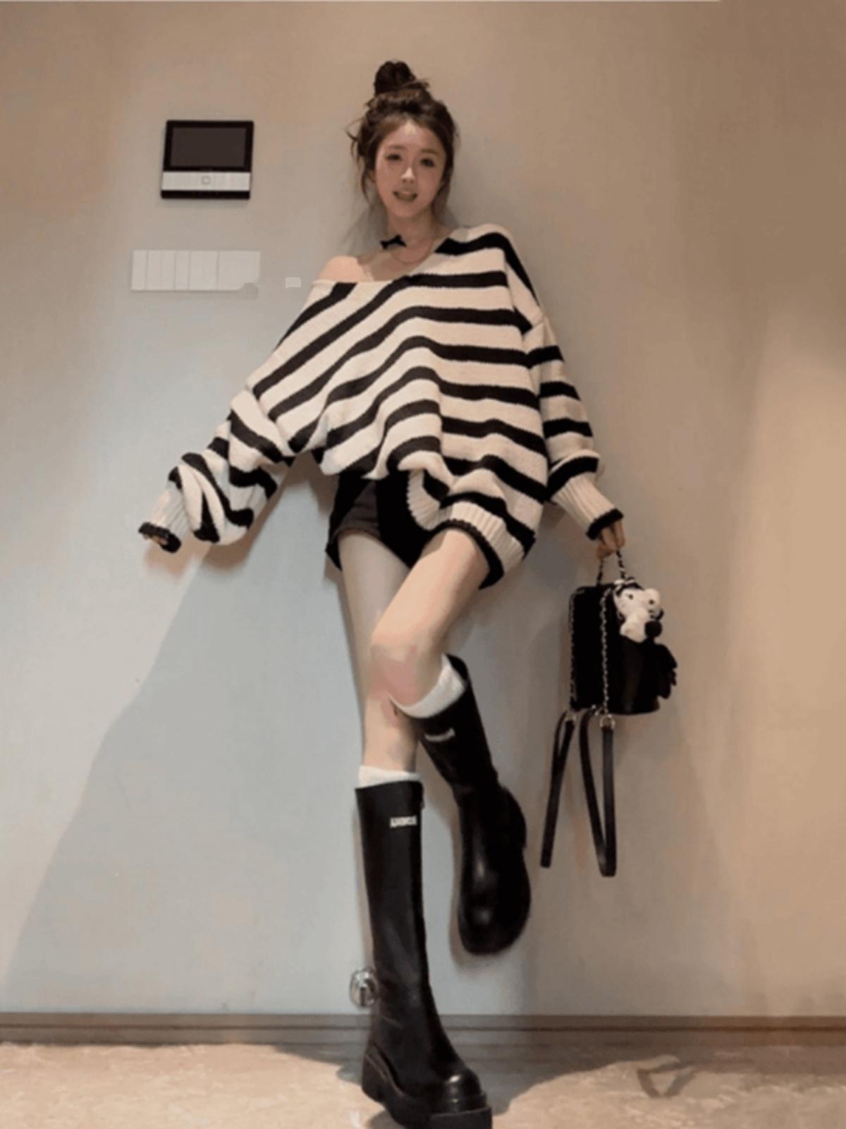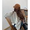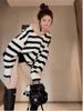 Suéter de punto de cuello en V nicho de sentido del diseño para mujer, otoño nuevo holgado adelgazante estilo perezoso casual top a rayas
