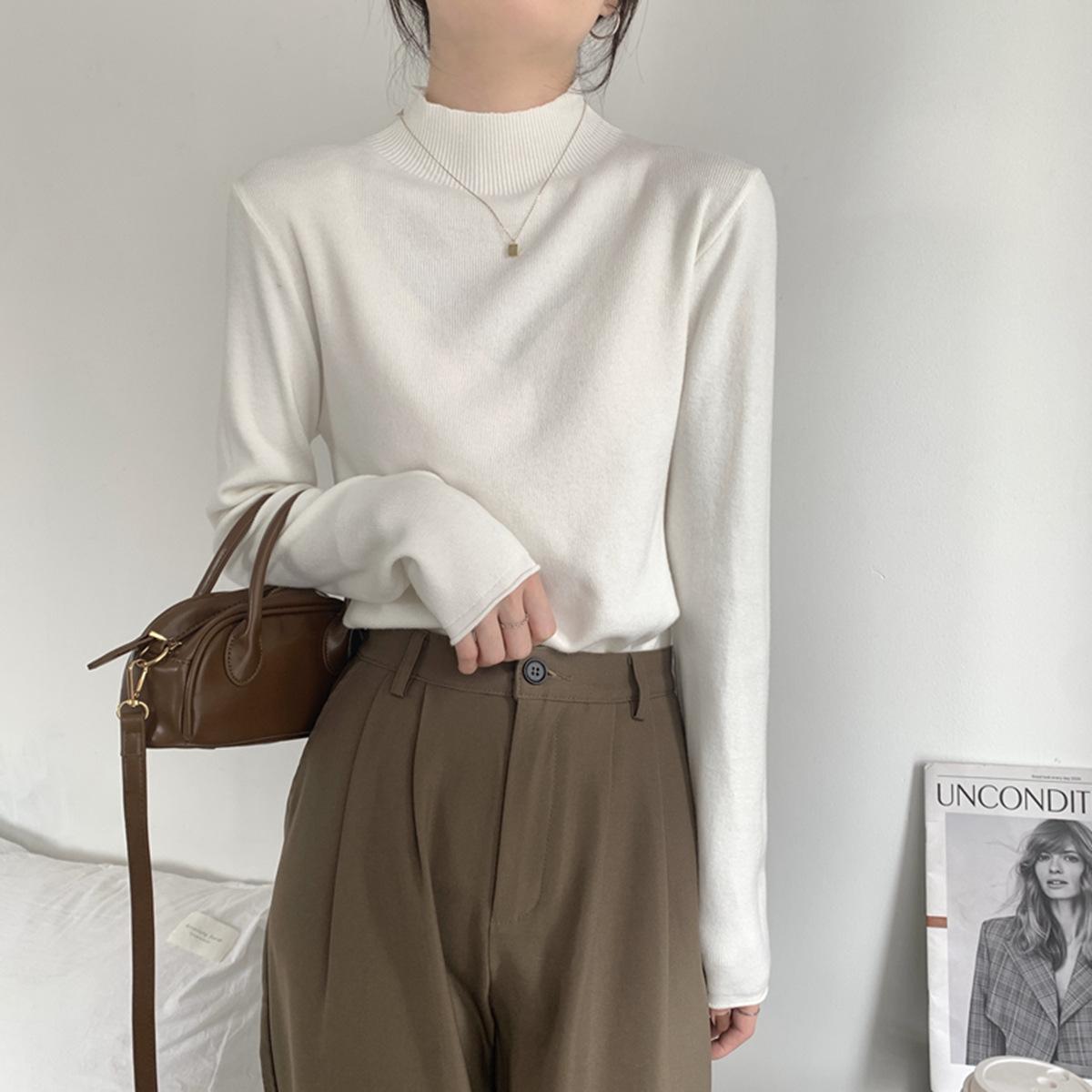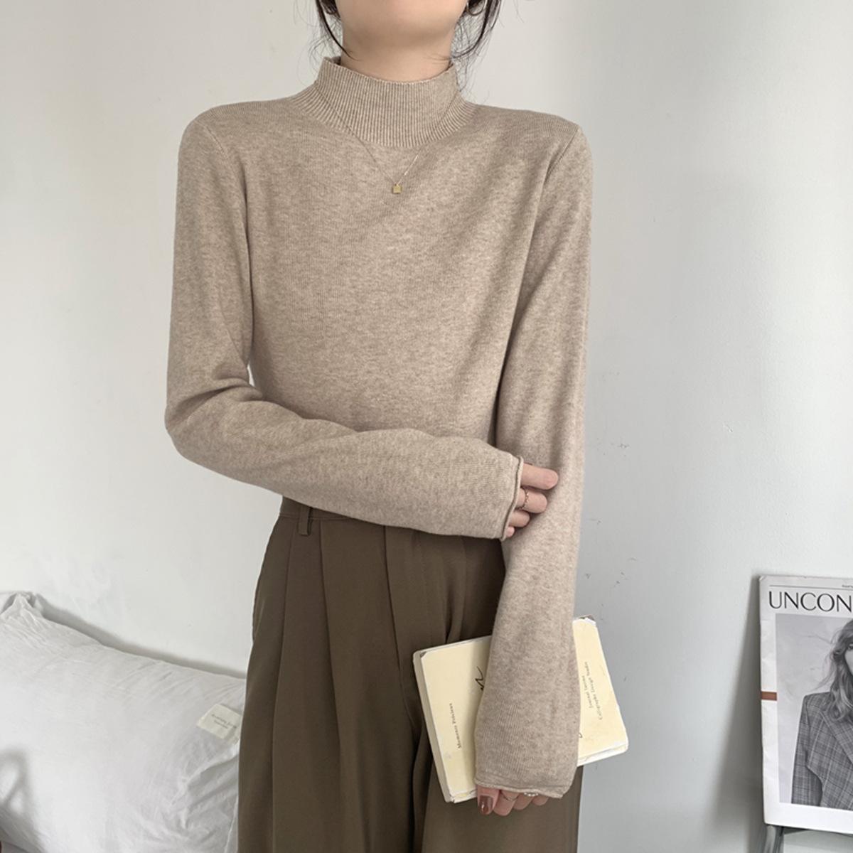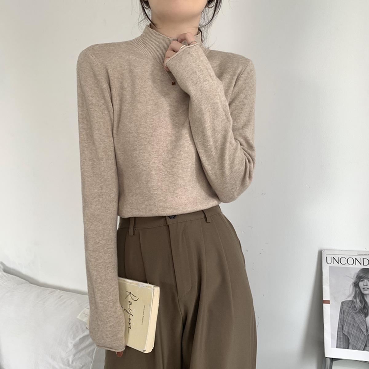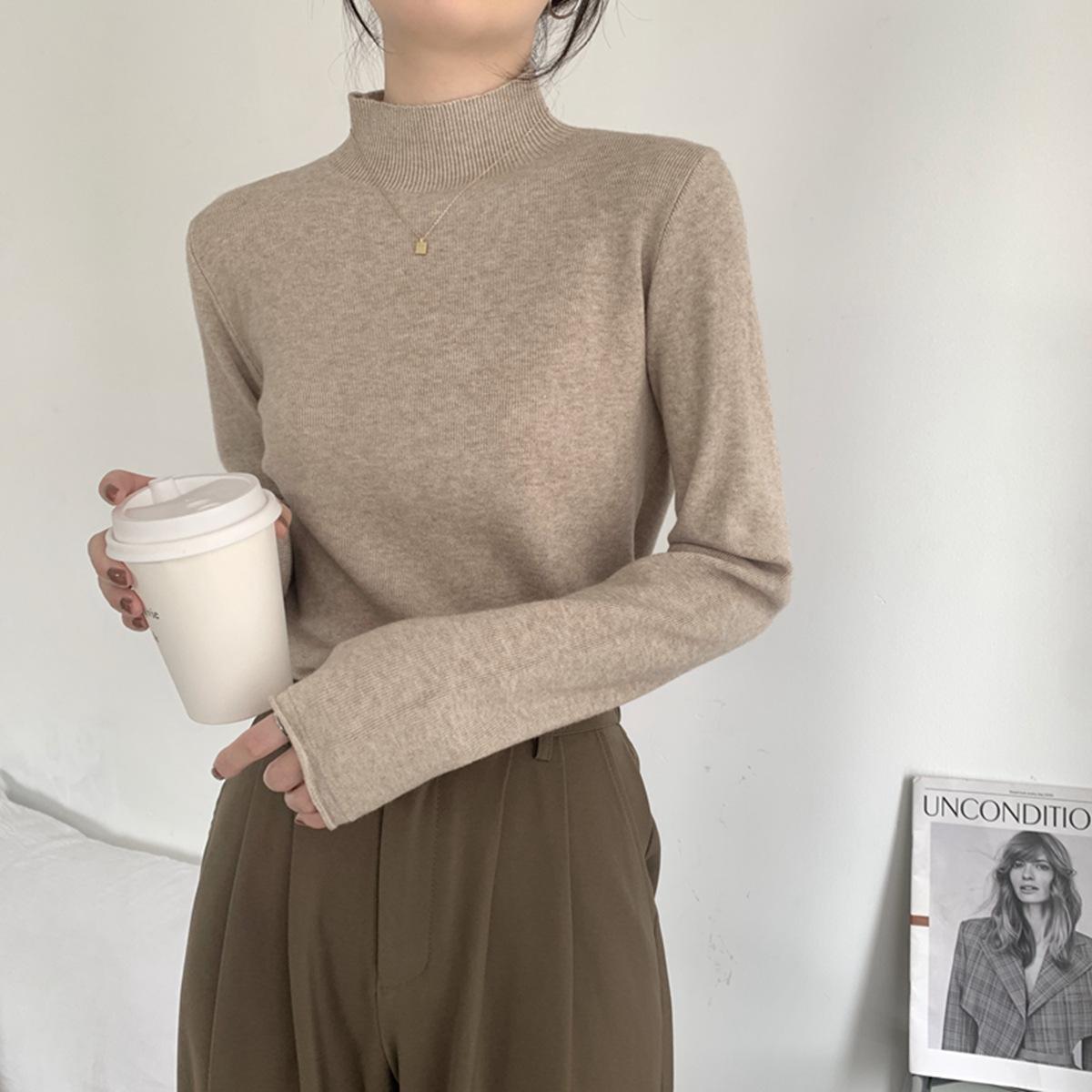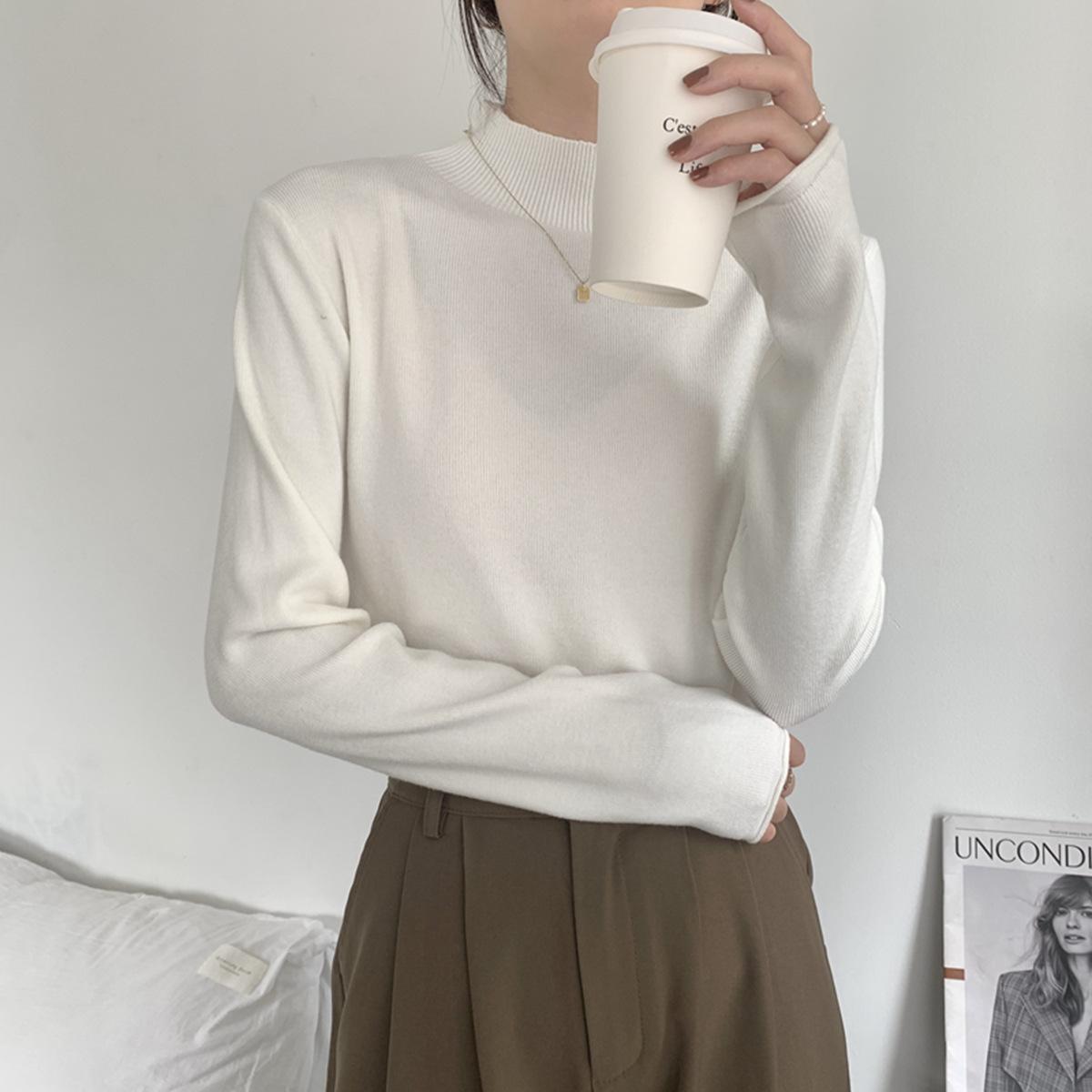 Top interior versátil de cuello alto medio estilo coreano para mujer Primavera 2025 Simple Casual de manga larga Camiseta básica de punto de bajo alto