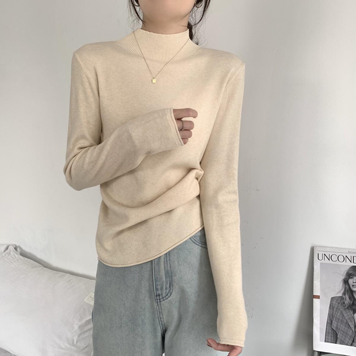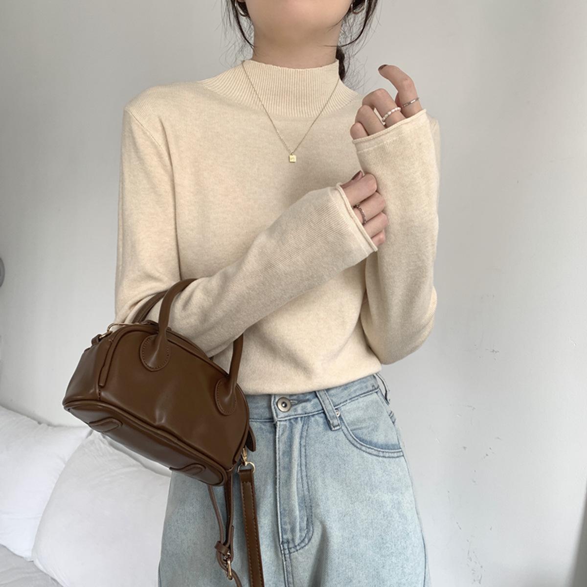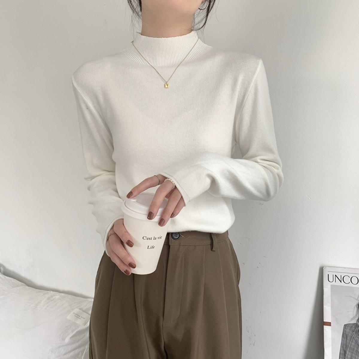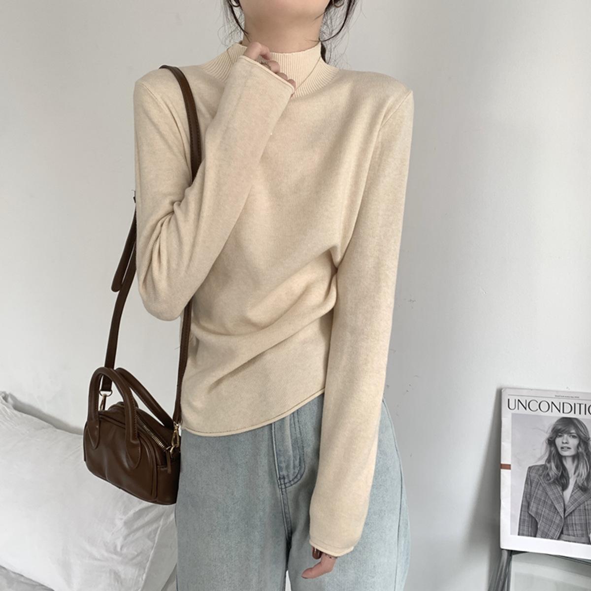 Top interior versátil de cuello alto medio estilo coreano para mujer Primavera 2025 Simple Casual de manga larga Camiseta básica de punto de bajo alto