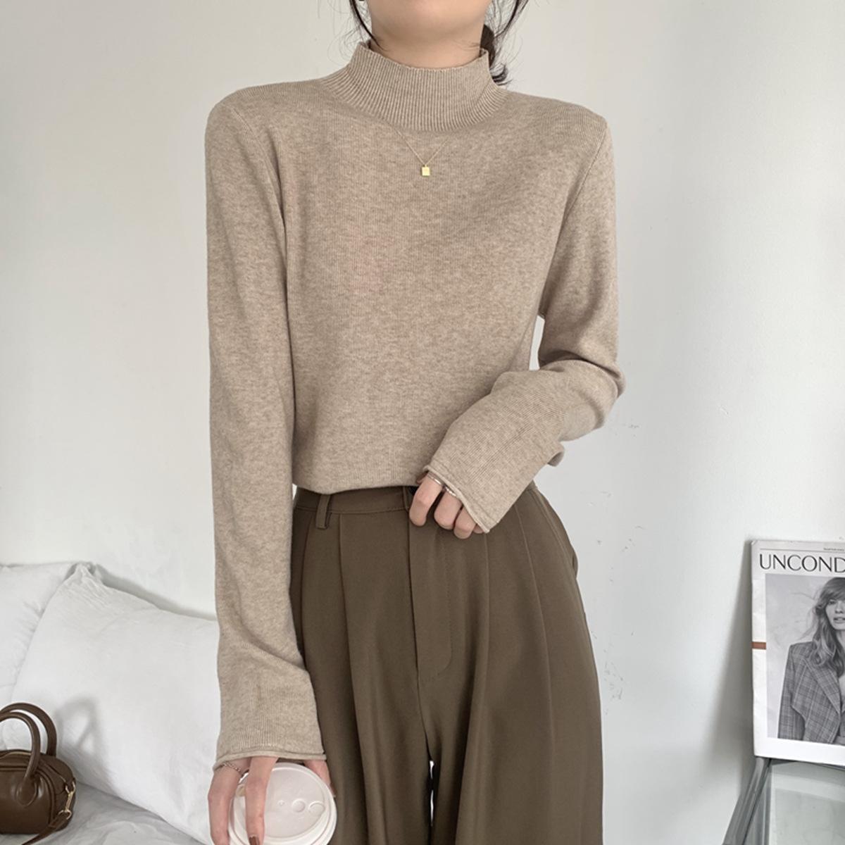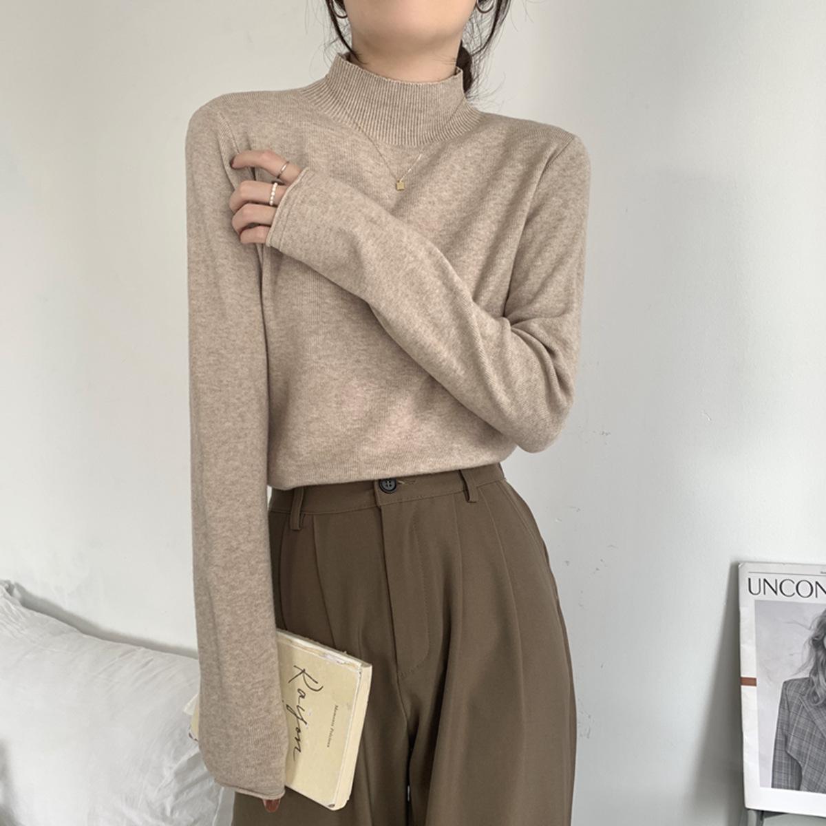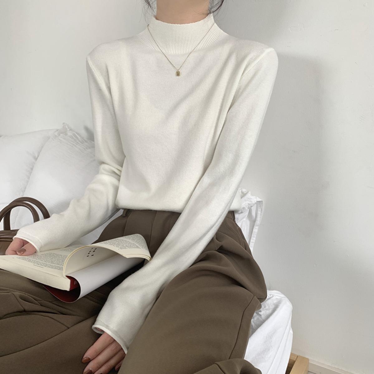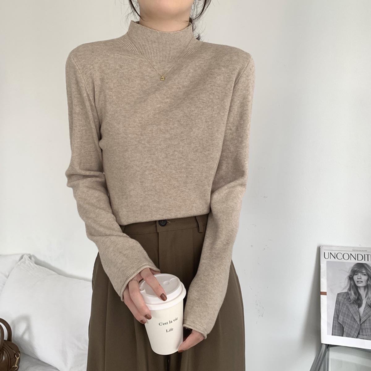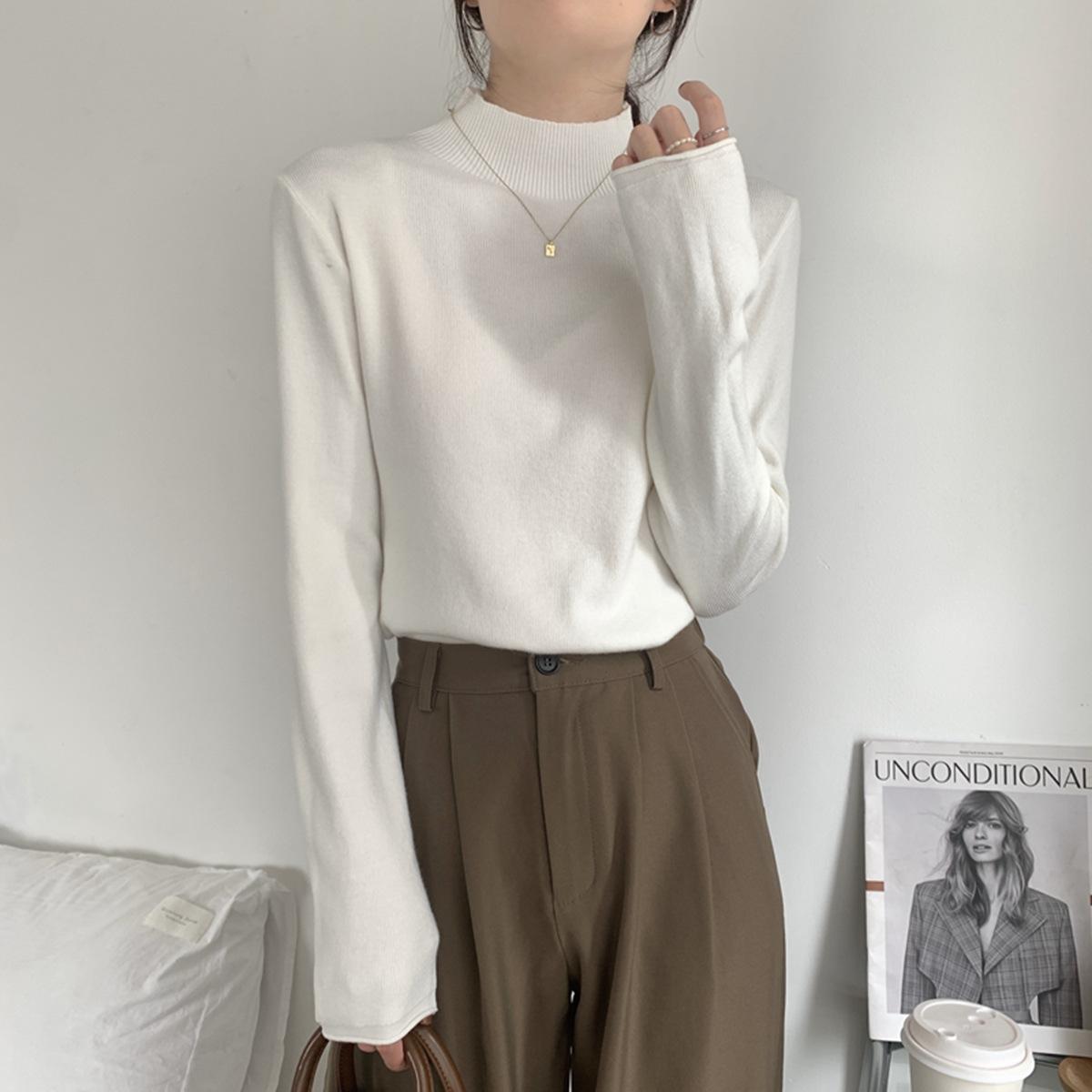 Top interior versátil de cuello alto medio estilo coreano para mujer Primavera 2025 Simple Casual de manga larga Camiseta básica de punto de bajo alto