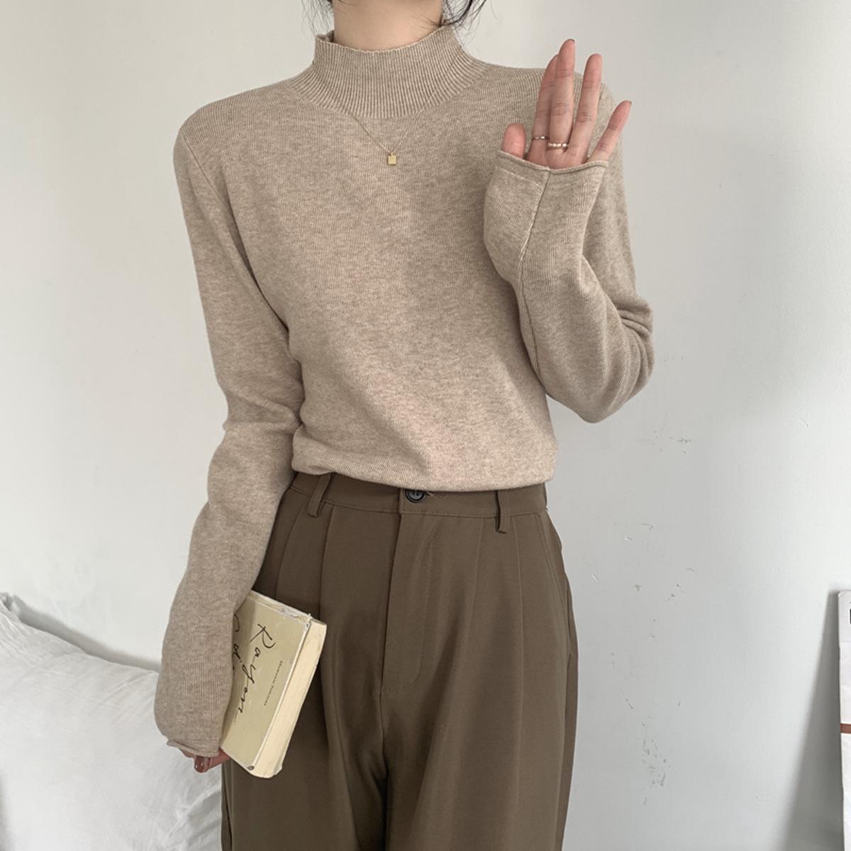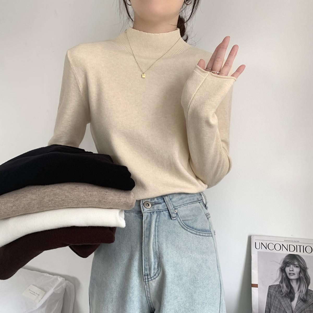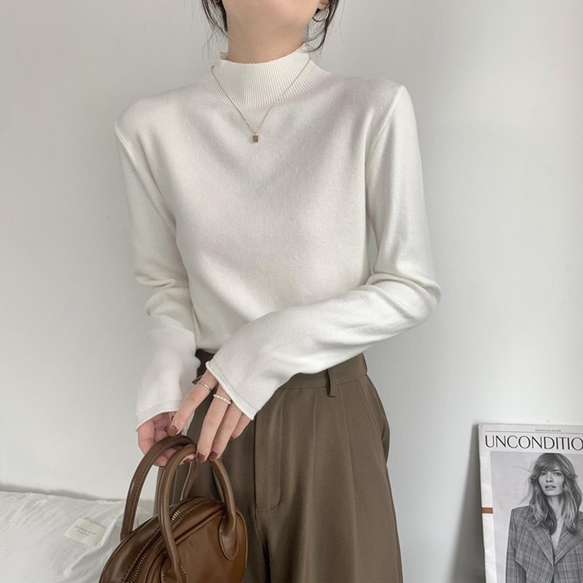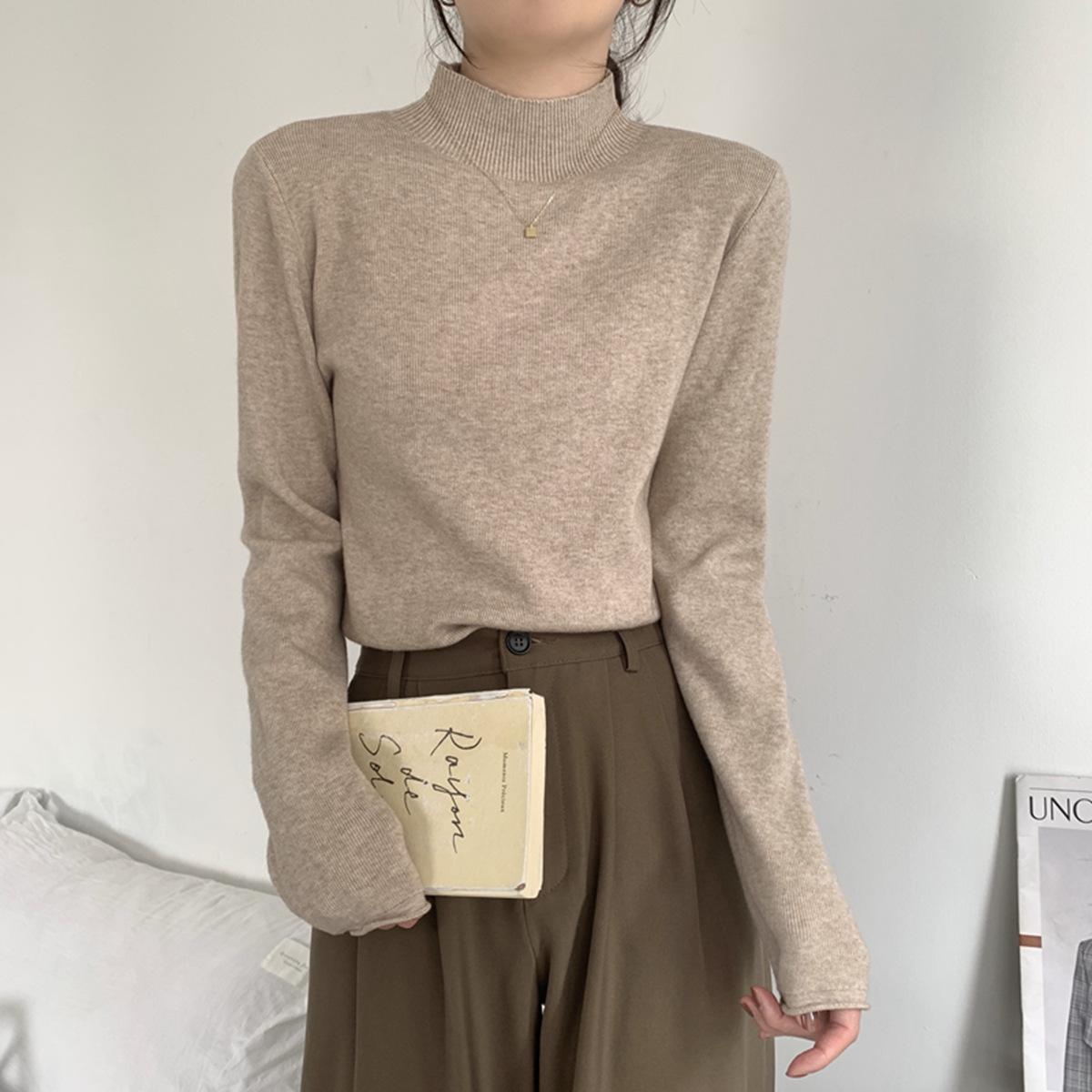 Top interior versátil de cuello alto medio estilo coreano para mujer Primavera 2025 Simple Casual de manga larga Camiseta básica de punto de bajo alto