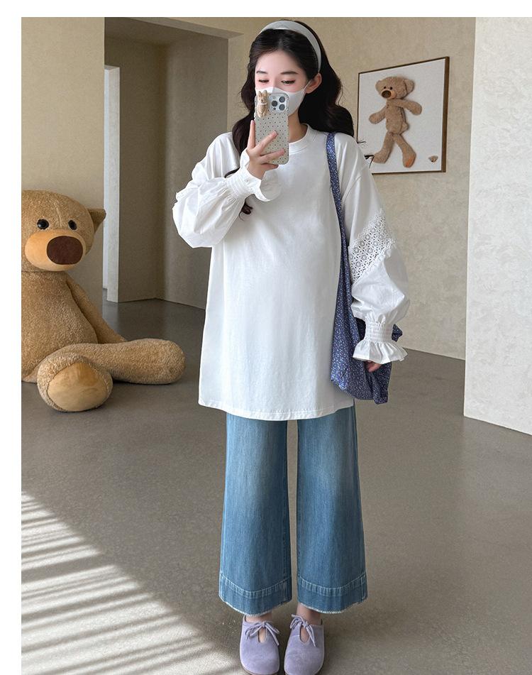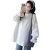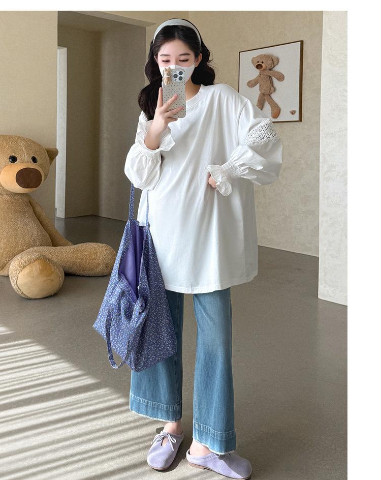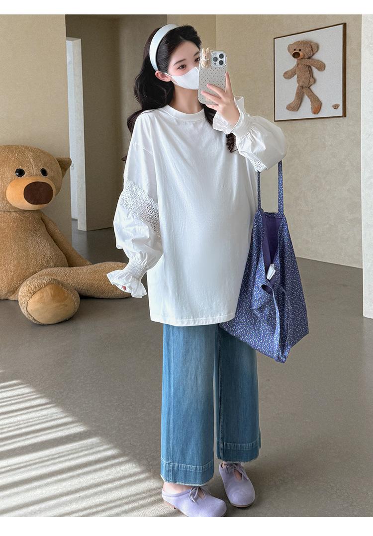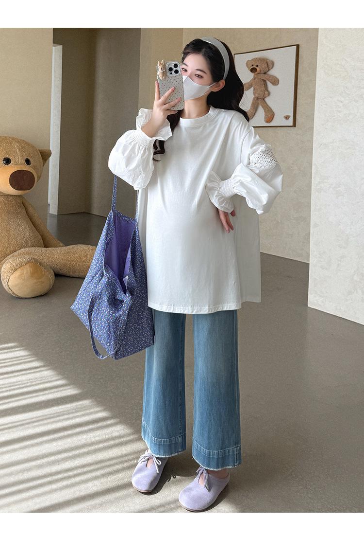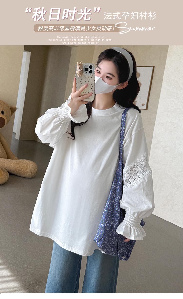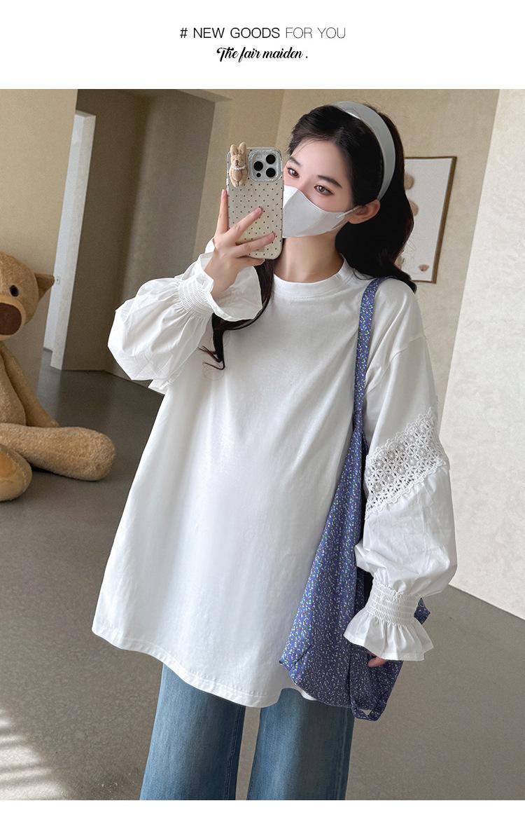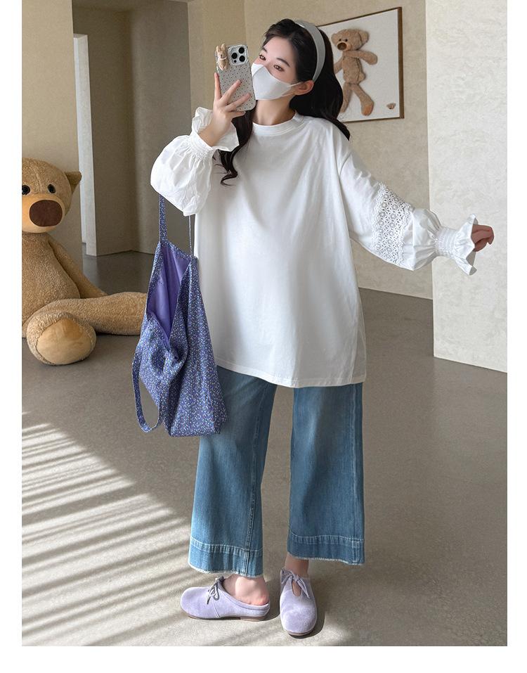 Mujeres embarazadas Camiseta de punto patchwork de algodón lavado de otoño e invierno suelta panel grande patchwork de encaje top básico que cubre la cadera