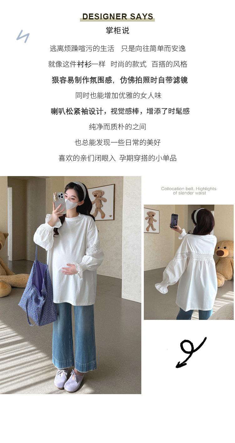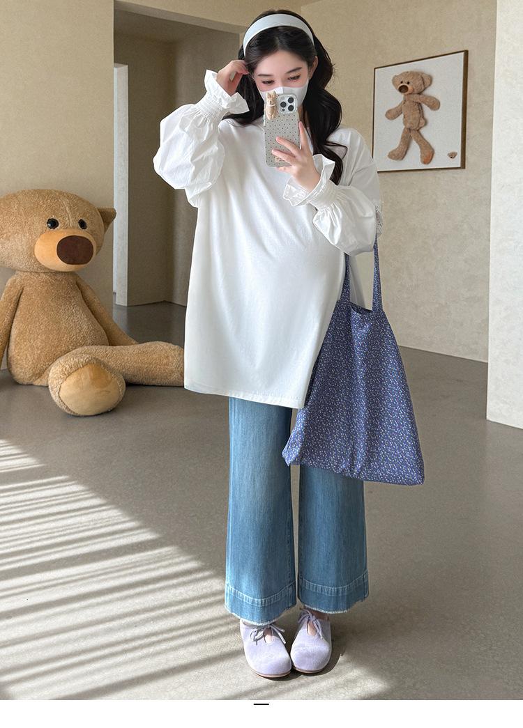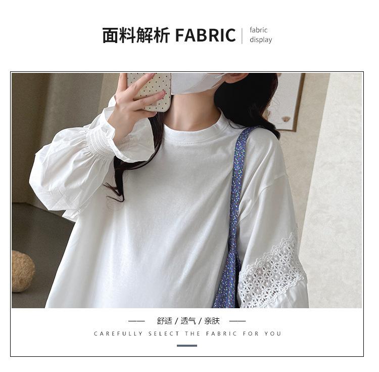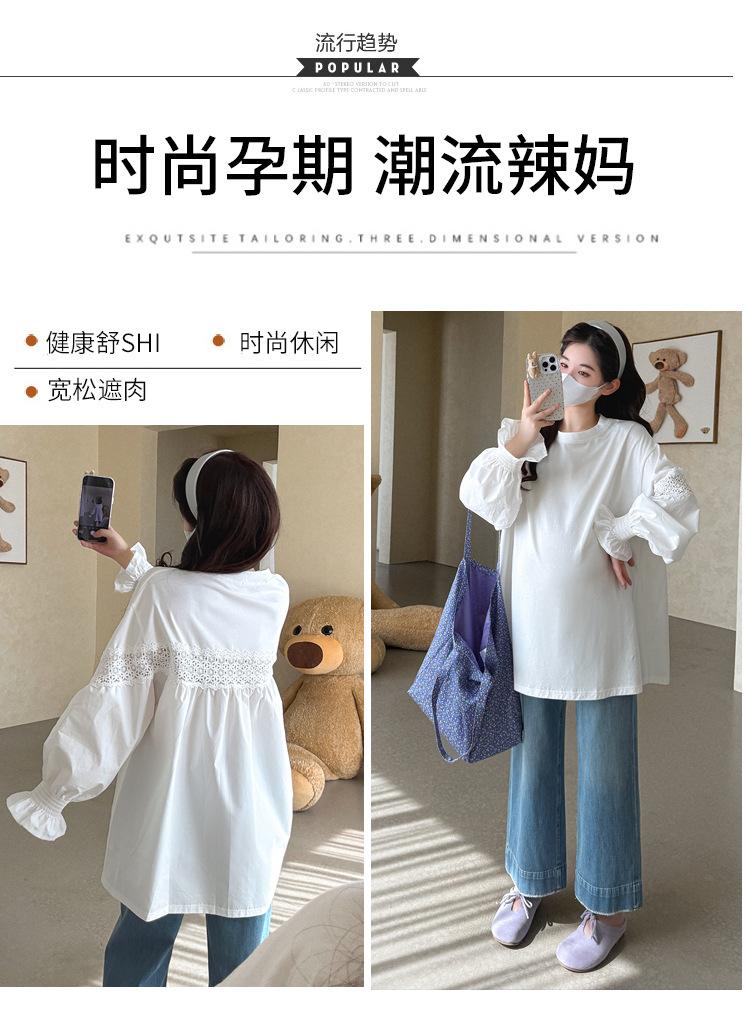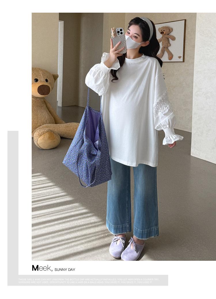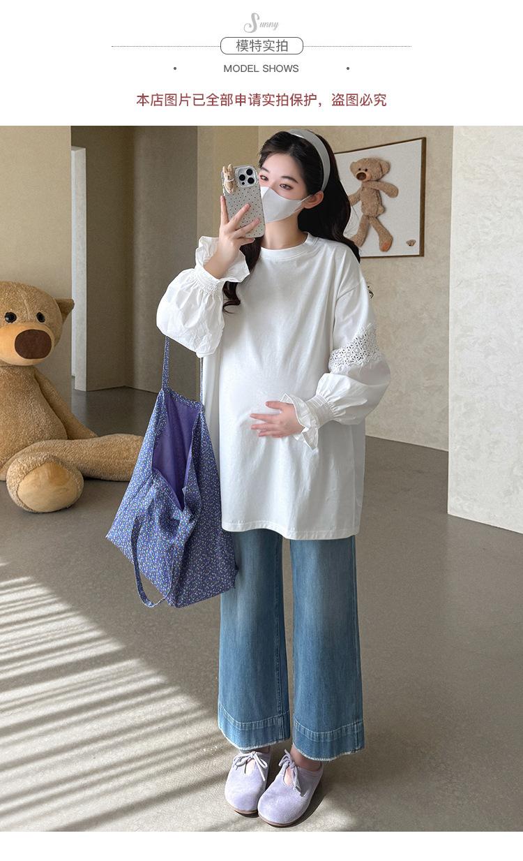 Mujeres embarazadas Camiseta de punto patchwork de algodón lavado de otoño e invierno suelta panel grande patchwork de encaje top básico que cubre la cadera
