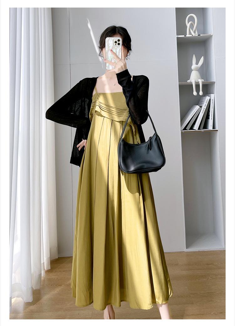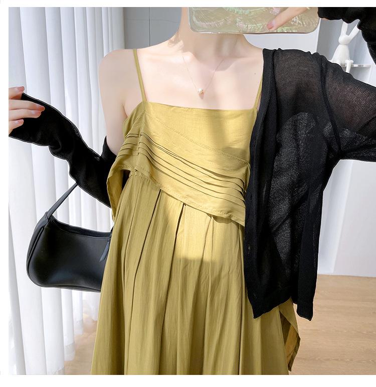 Black Cardigan, Green Sling Vest Dress, Royal Blue Slip Skirt, Apricot Slip Skirt