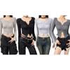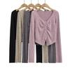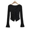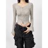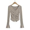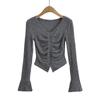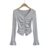 Otoño e invierno 2023 chica caliente sexy cuello en V manga acampanada suéter para mujer nuevo diseño plisado ajustado a la cintura camiseta de manga larga