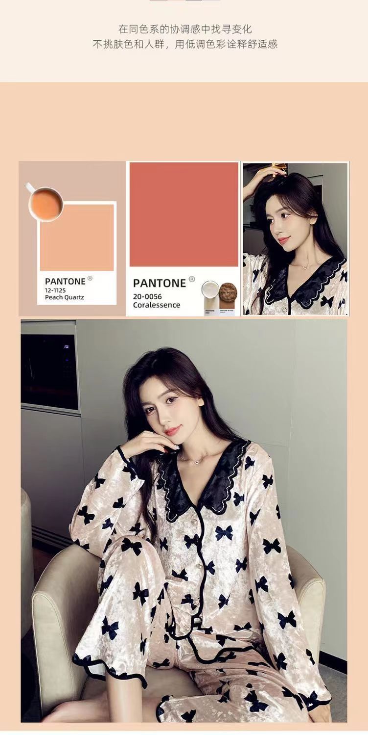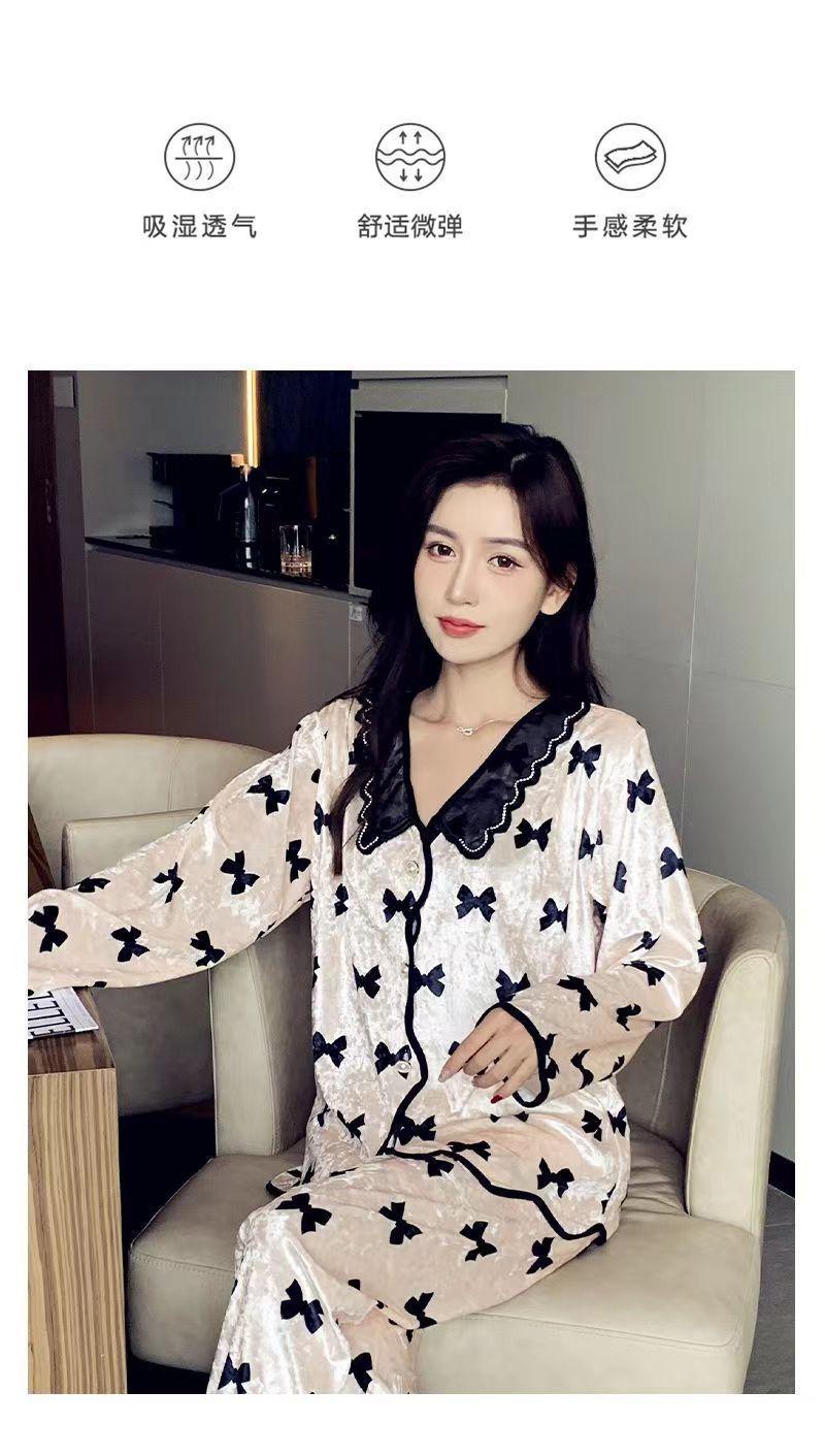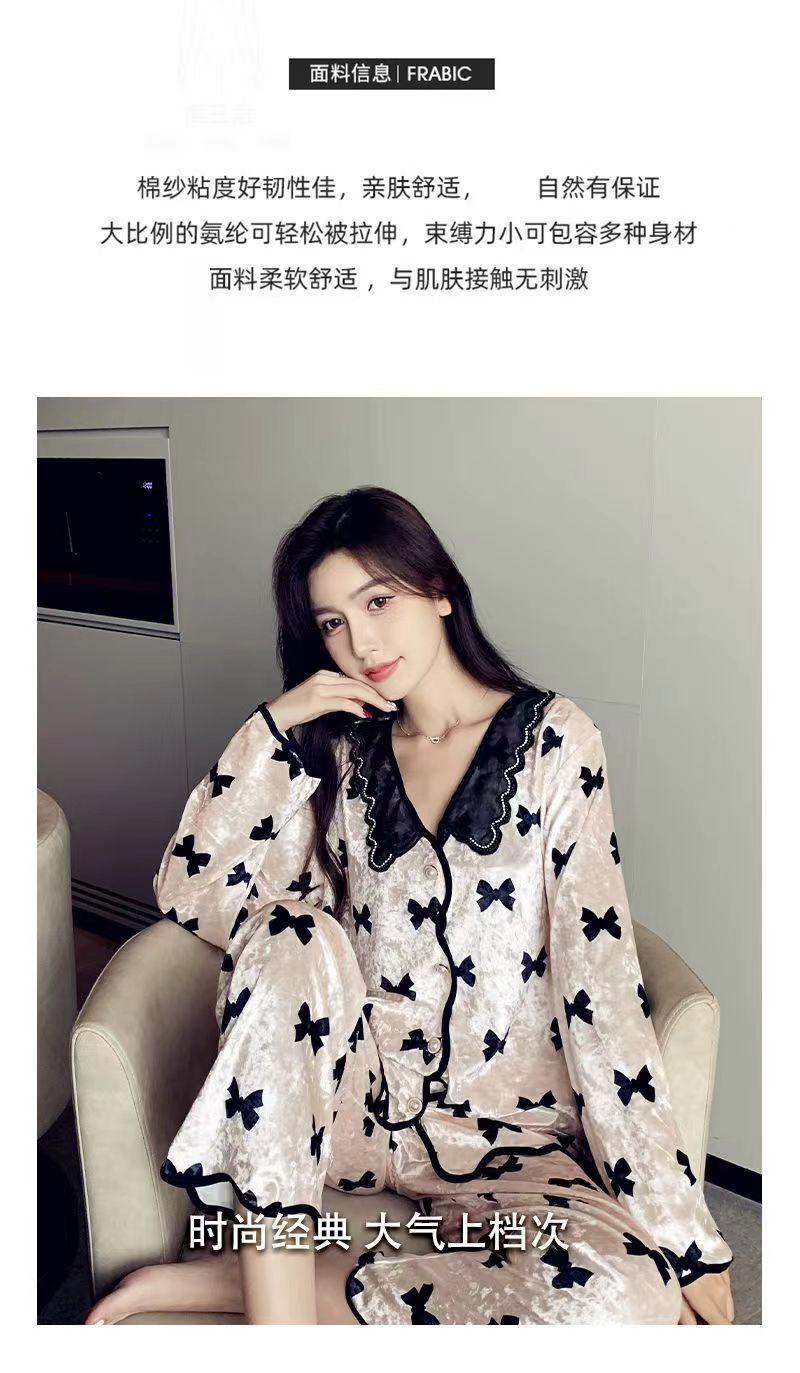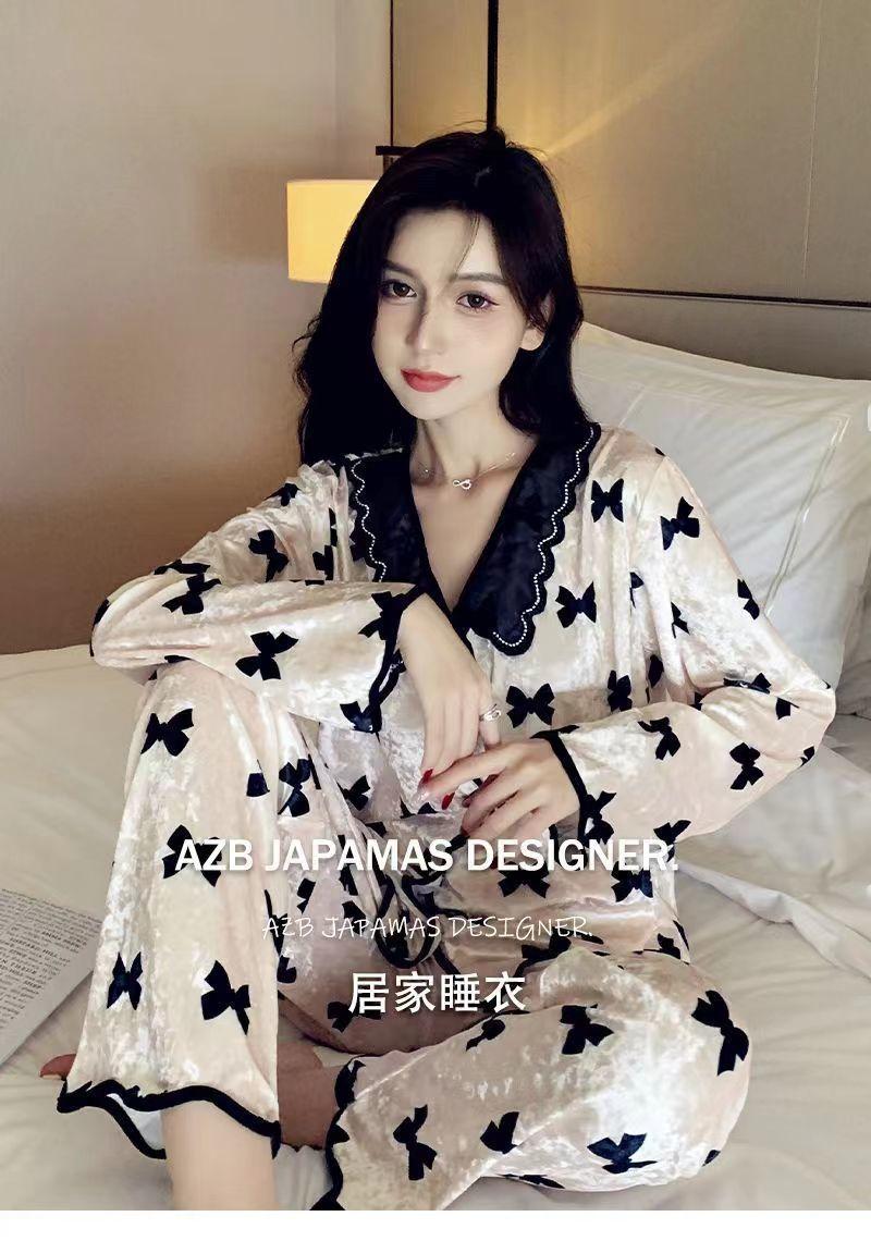 Pijama Nuevo de Mujer con Lazo Terciopelo Dorado Otoño e Invierno Cuello en V Caliente en Internet Ins Traje de Ropa para el Hogar
