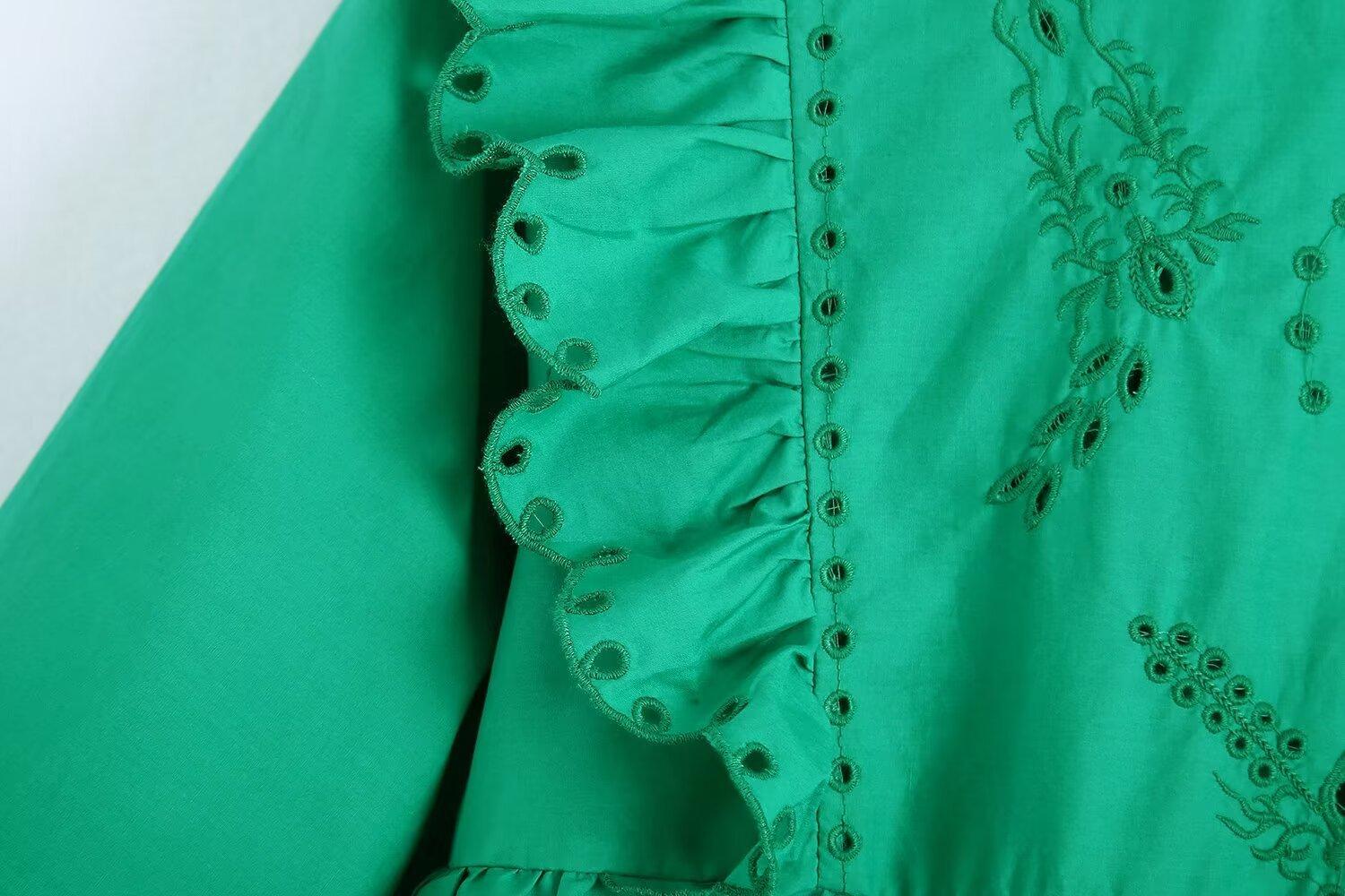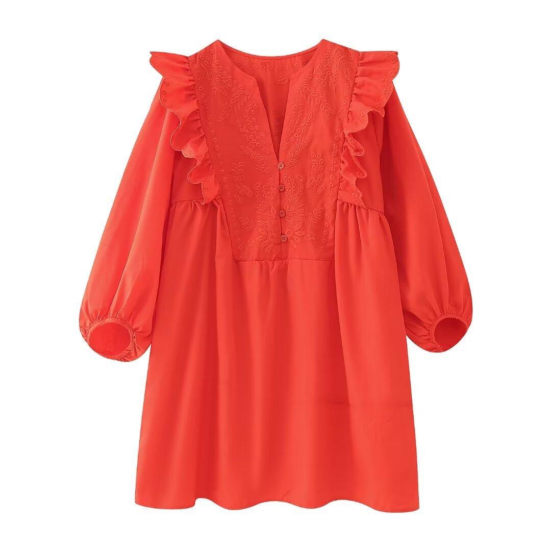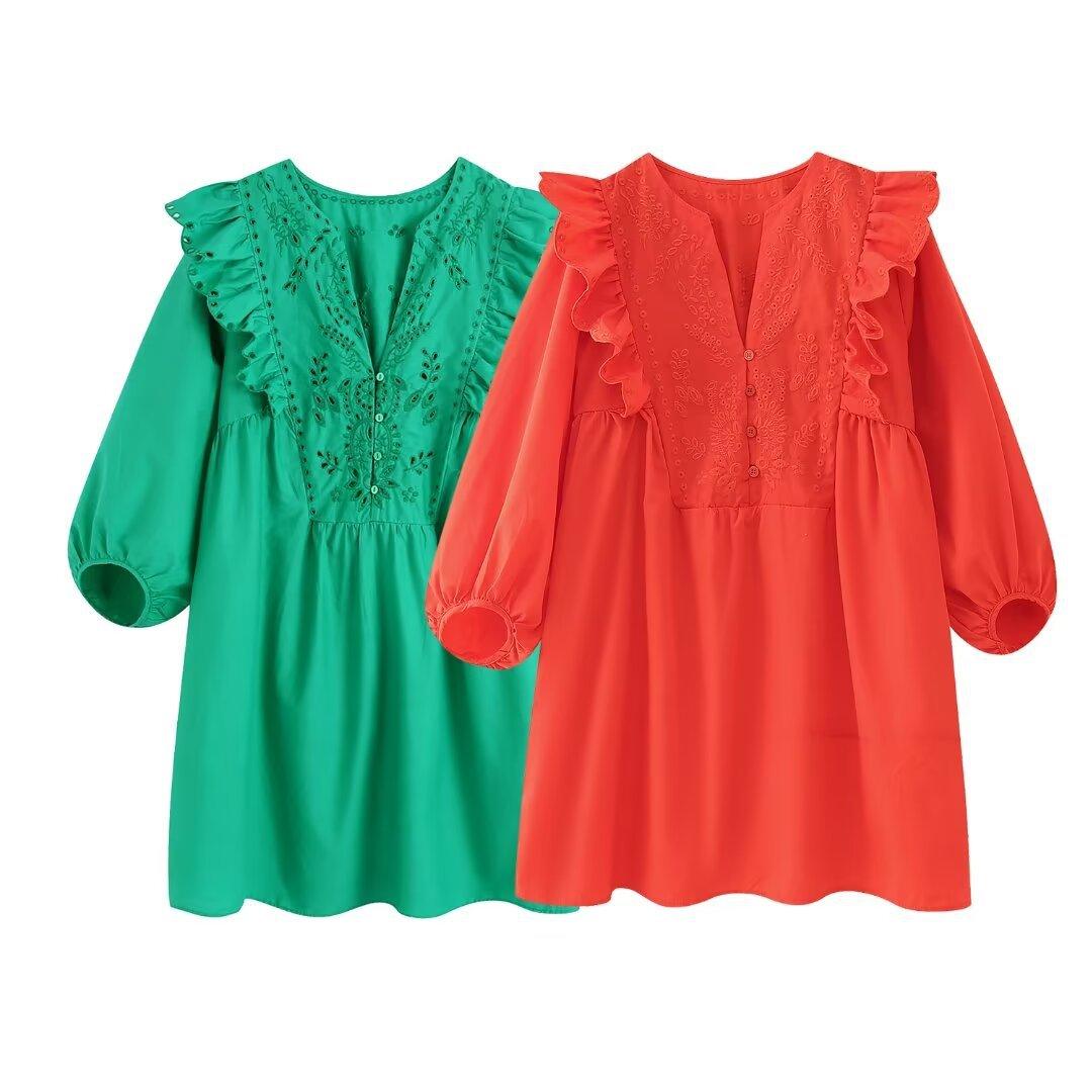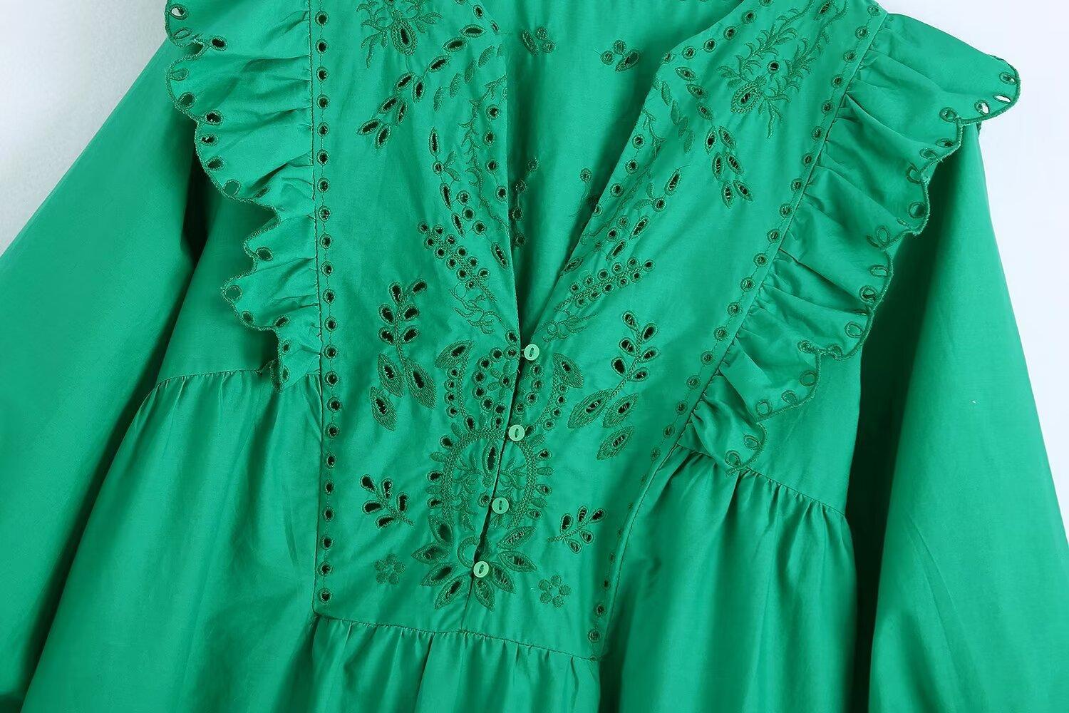 Venta al por mayor 2024 Primavera Nuevo Estilo Europeo Americano Vestido Camisero Bordado Calado de Manga Larga para Mujer