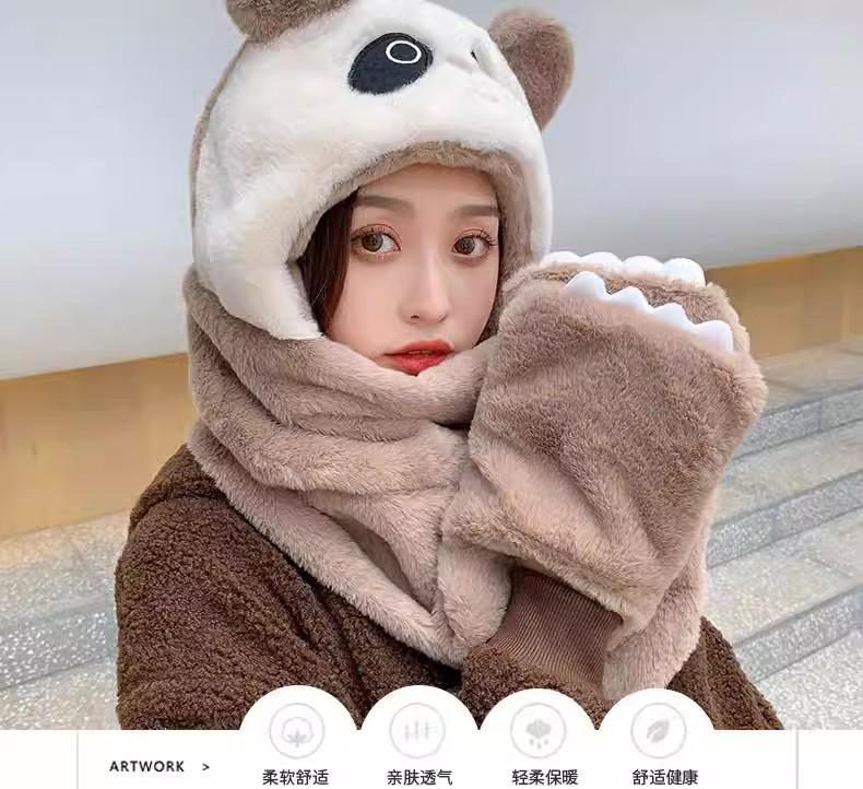 Loco Sombrero, Bufanda y Guantes de Otoño e Invierno, Set de Tres Piezas de Panda de Felpa y Versátil de Una Pieza, Sombrero de Una Pieza Grueso para Protección de Orejas y Cálido