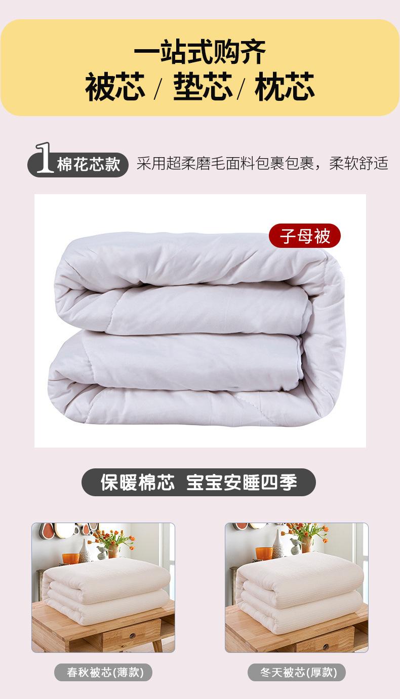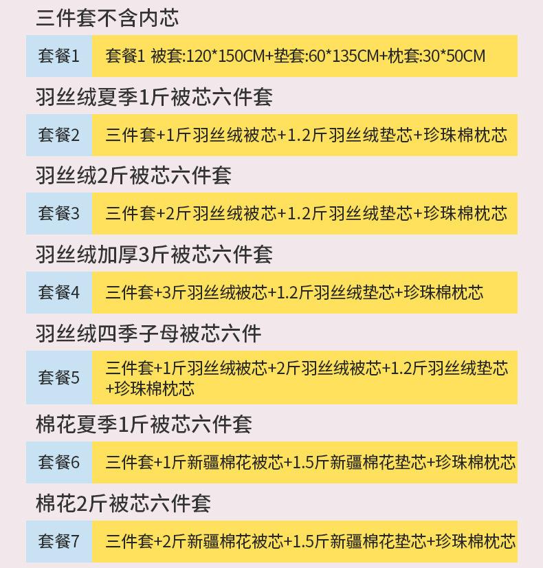 1 catty six-piece set [three-piece set + 1 catty cotton quilt core + 1.5 catty cotton mattress core + down fiber pillow core]