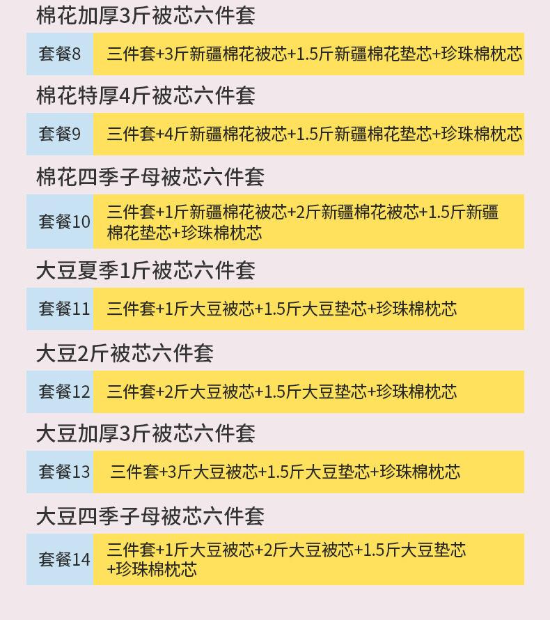 1 cat six-piece set [three-piece set + 1 cat soybean quilt core + 1.5 cat soybean pad core + down fiber pillow core]