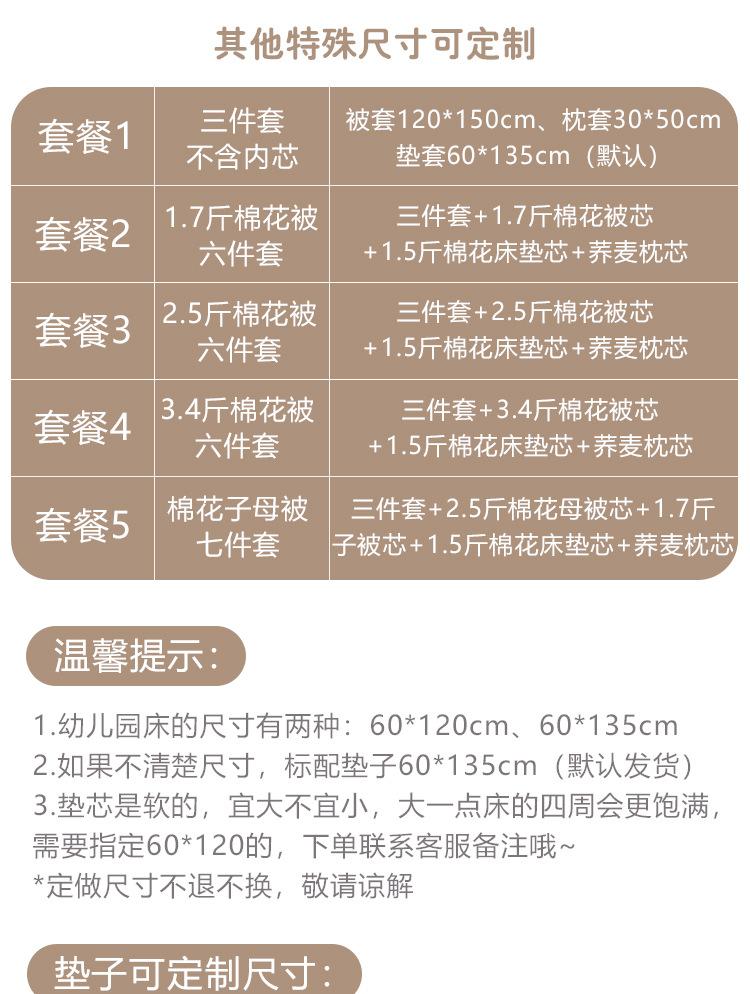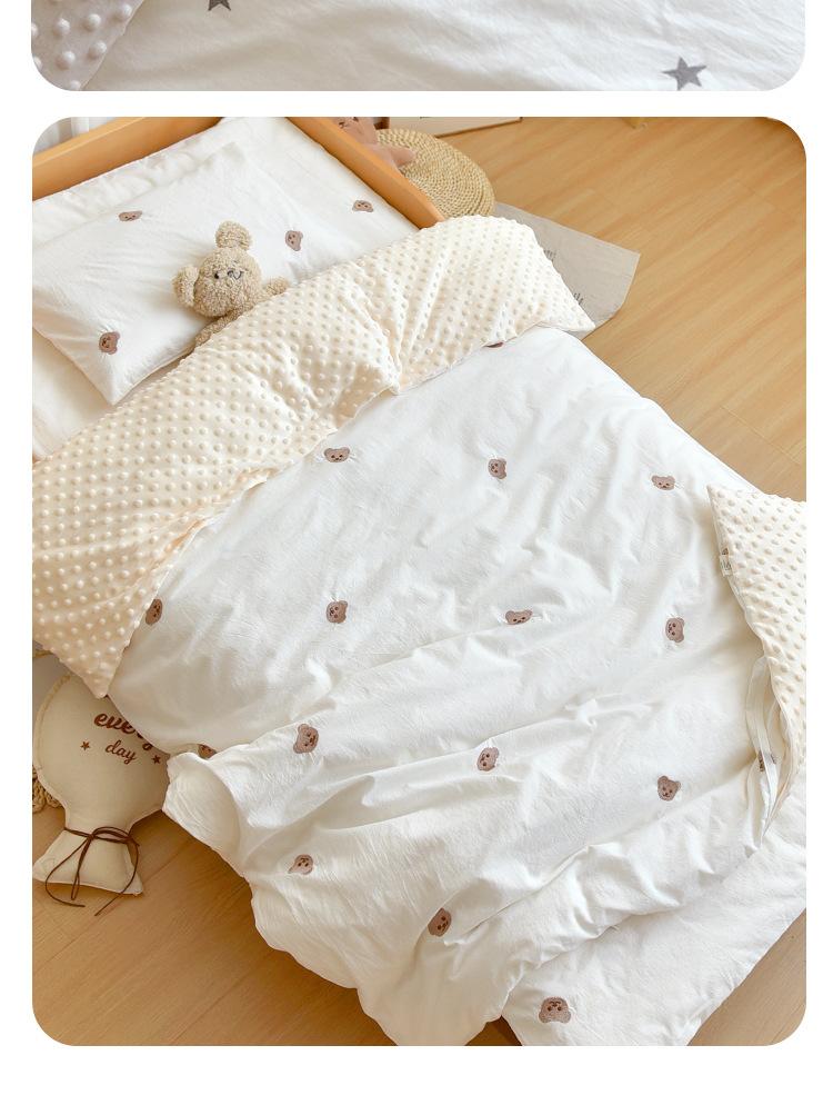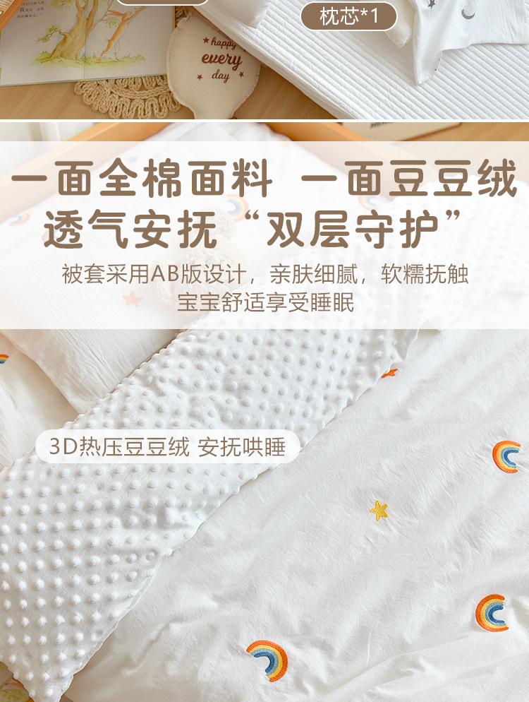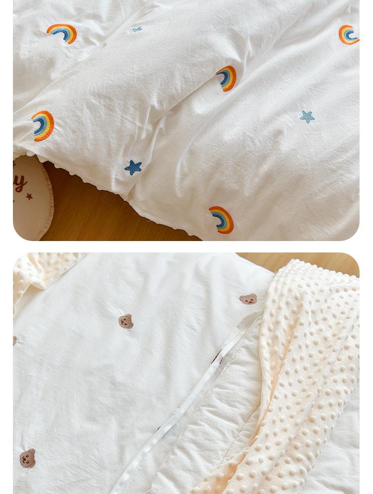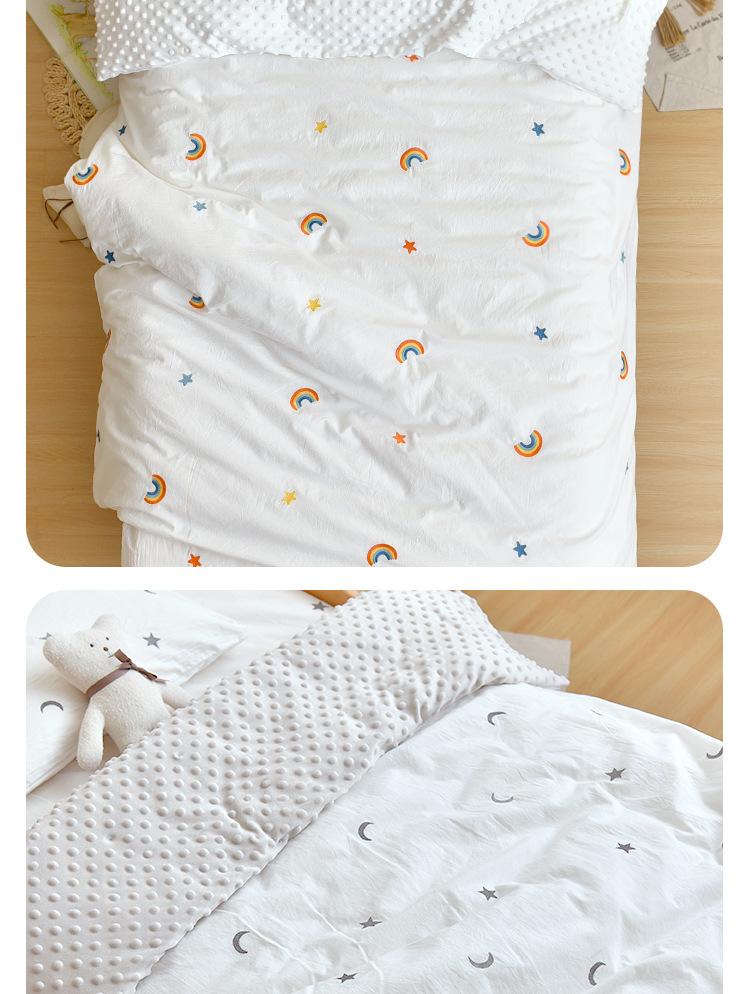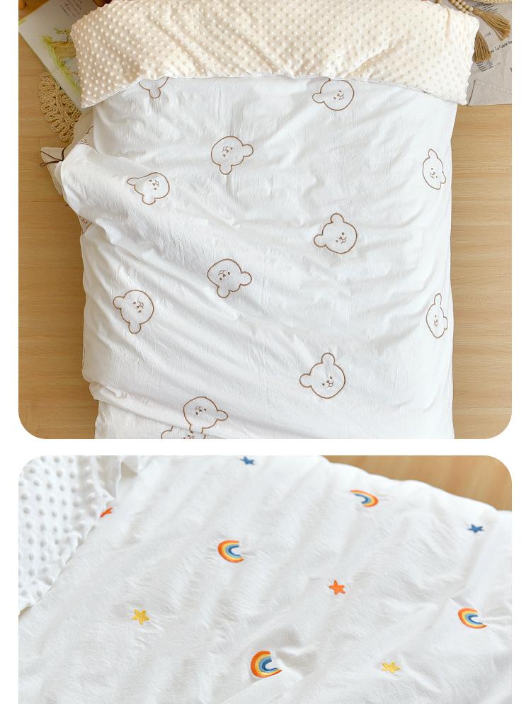 Juego de cama de algodón para jardín de infantes La funda nórdica está hecha con un diseño de lado AB, un lado con un patrón bordado de algodón 100%, y el otro lado con tela minky de color sólido. Patrón de bordado de diez mil puntadas, exquisitamente elaborado y fino, no roza la piel del bebé, hermoso y atmosférico El terciopelo de frijol 3D prensado en caliente es cálido y suave Utilizable por ambos lados, la funda nórdica tiene un diseño de cremallera invisible, es segura y no rayará al bebé. El edredón y el protector de colchón están hechos de algodón, rellenos con una pieza entera de guata de algodón, tienen buena retención de calor y no son propensos a apelmazarse. El edredón viene en 4 grosores para elegir, entre los cuales el estilo de doble capa tiene dos núcleos de edredón~ La funda de almohada es de algodón de doble cara, hecha en estilo sobre, y el relleno es núcleo de almohada de cáscara de trigo sarraceno. El tamaño del colchón se puede personalizar Si necesita personalización, solo contacte al servicio al cliente al realizar su pedido~