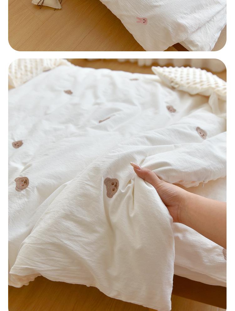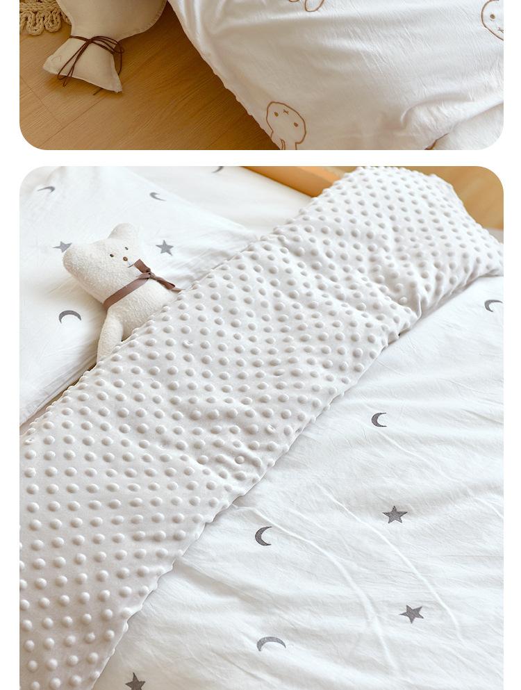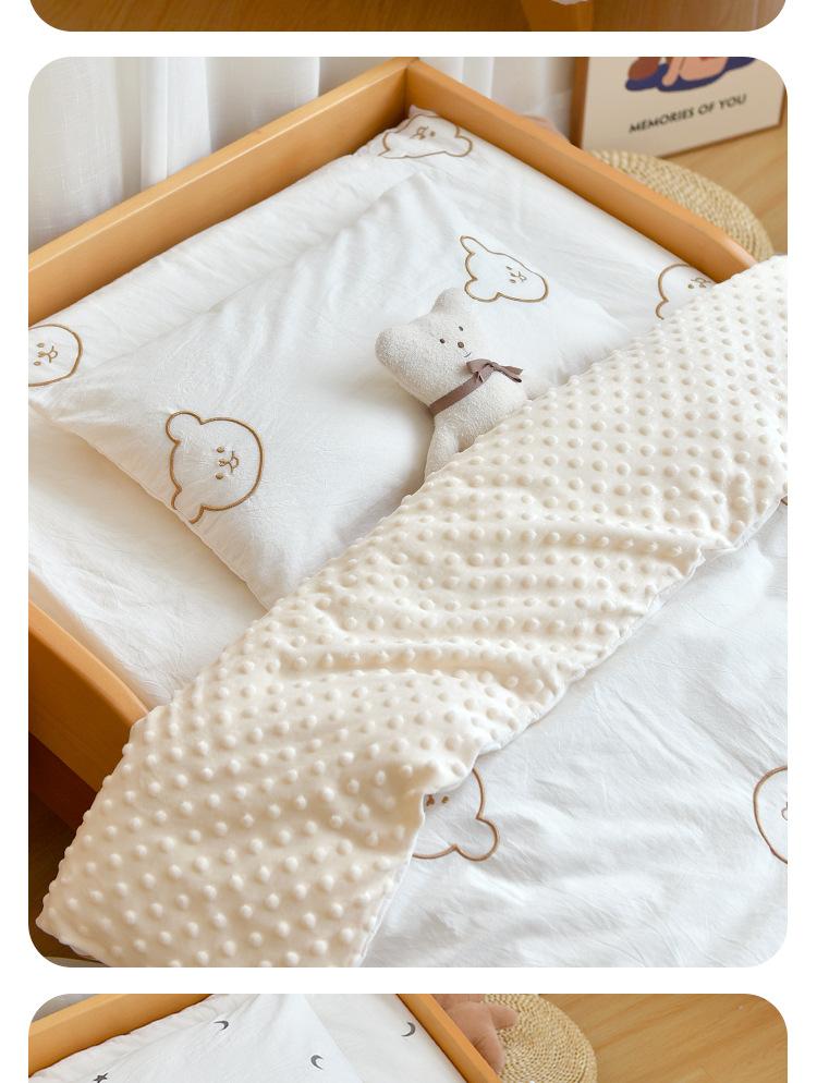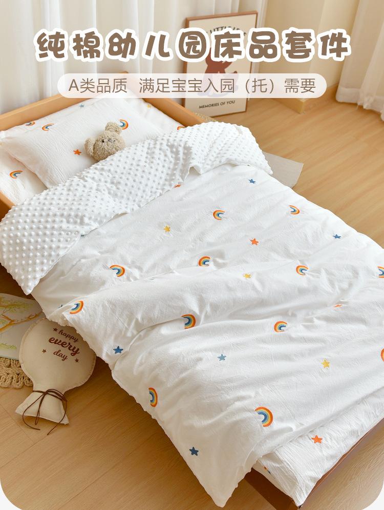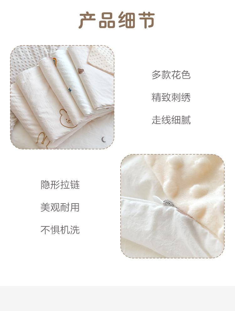 Juego de cama de algodón para jardín de infantes La funda nórdica está hecha con un diseño de lado AB, un lado con un patrón bordado de algodón 100%, y el otro lado con tela minky de color sólido. Patrón de bordado de diez mil puntadas, exquisitamente elaborado y fino, no roza la piel del bebé, hermoso y atmosférico El terciopelo de frijol 3D prensado en caliente es cálido y suave Utilizable por ambos lados, la funda nórdica tiene un diseño de cremallera invisible, es segura y no rayará al bebé. El edredón y el protector de colchón están hechos de algodón, rellenos con una pieza entera de guata de algodón, tienen buena retención de calor y no son propensos a apelmazarse. El edredón viene en 4 grosores para elegir, entre los cuales el estilo de doble capa tiene dos núcleos de edredón~ La funda de almohada es de algodón de doble cara, hecha en estilo sobre, y el relleno es núcleo de almohada de cáscara de trigo sarraceno. El tamaño del colchón se puede personalizar Si necesita personalización, solo contacte al servicio al cliente al realizar su pedido~