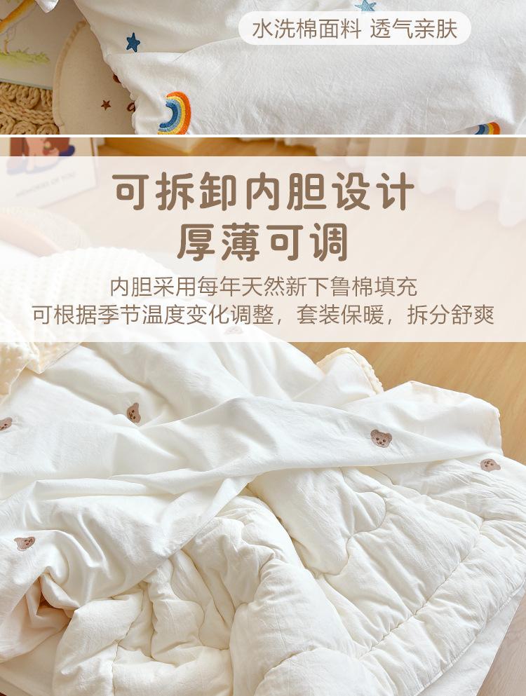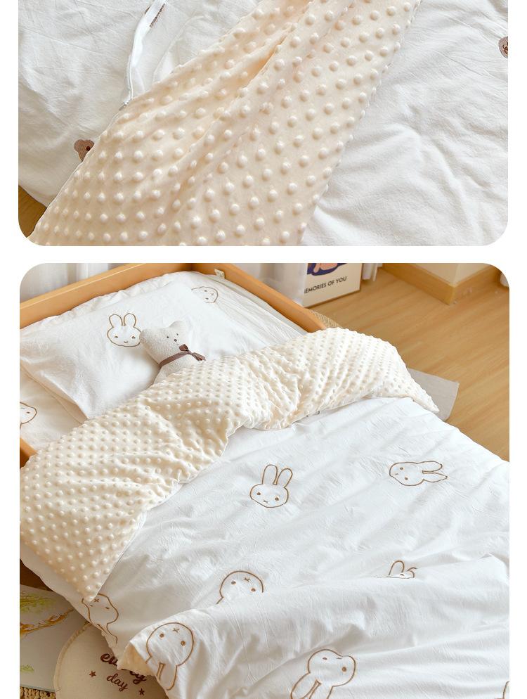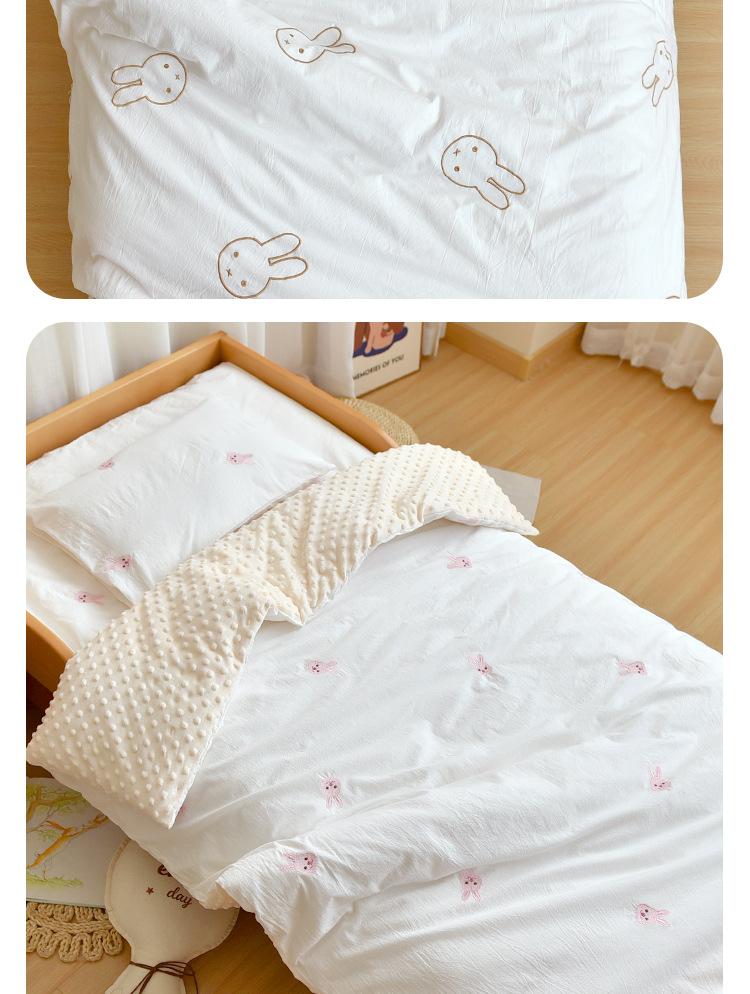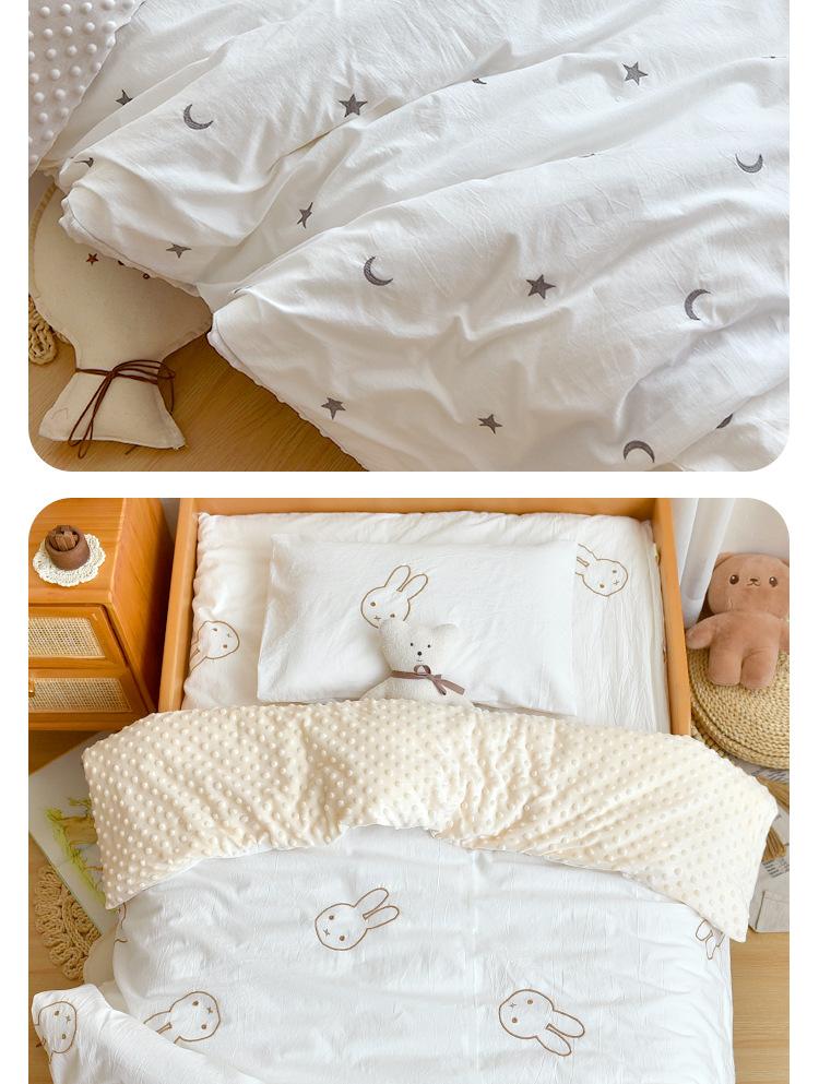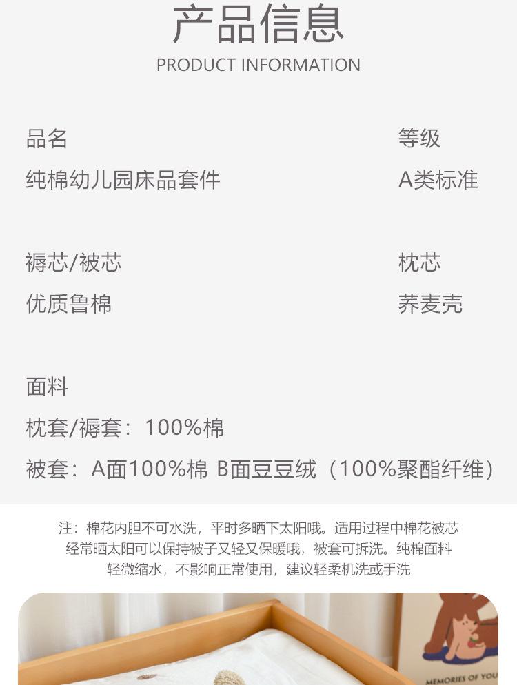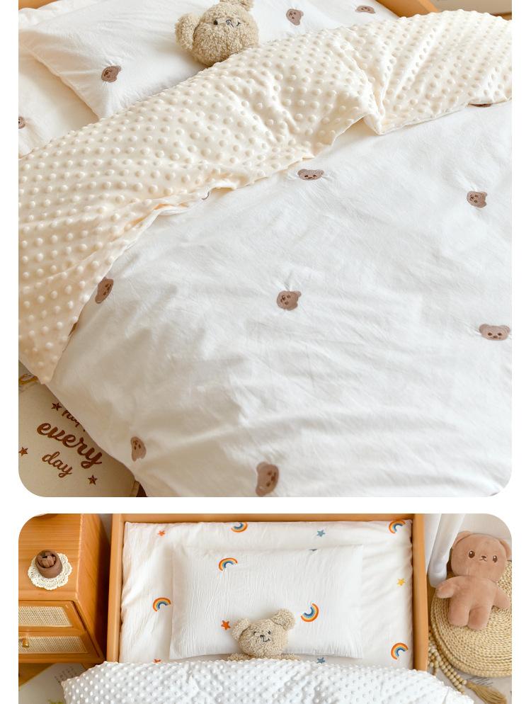 Juego de cama de algodón para jardín de infantes La funda nórdica está hecha con un diseño de lado AB, un lado con un patrón bordado de algodón 100%, y el otro lado con tela minky de color sólido. Patrón de bordado de diez mil puntadas, exquisitamente elaborado y fino, no roza la piel del bebé, hermoso y atmosférico El terciopelo de frijol 3D prensado en caliente es cálido y suave Utilizable por ambos lados, la funda nórdica tiene un diseño de cremallera invisible, es segura y no rayará al bebé. El edredón y el protector de colchón están hechos de algodón, rellenos con una pieza entera de guata de algodón, tienen buena retención de calor y no son propensos a apelmazarse. El edredón viene en 4 grosores para elegir, entre los cuales el estilo de doble capa tiene dos núcleos de edredón~ La funda de almohada es de algodón de doble cara, hecha en estilo sobre, y el relleno es núcleo de almohada de cáscara de trigo sarraceno. El tamaño del colchón se puede personalizar Si necesita personalización, solo contacte al servicio al cliente al realizar su pedido~