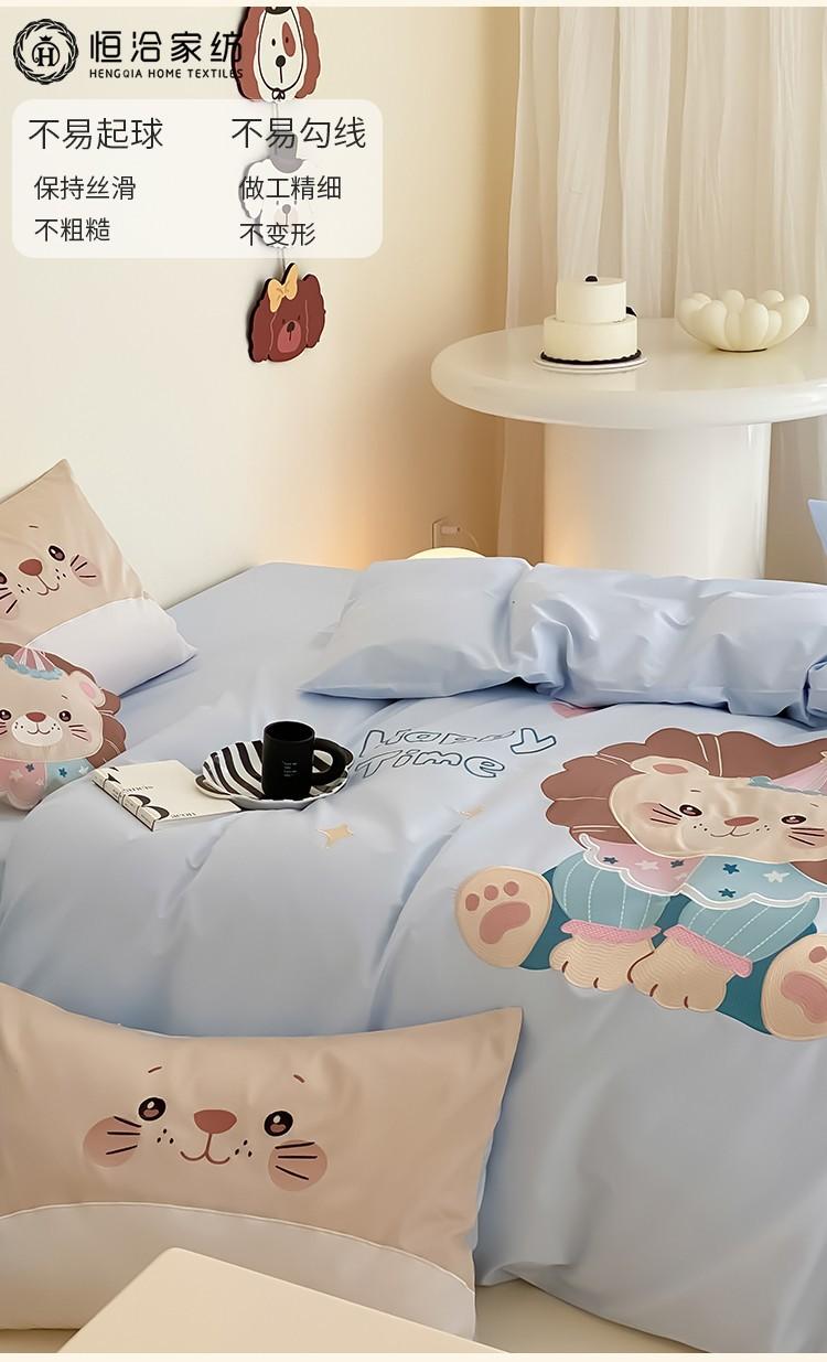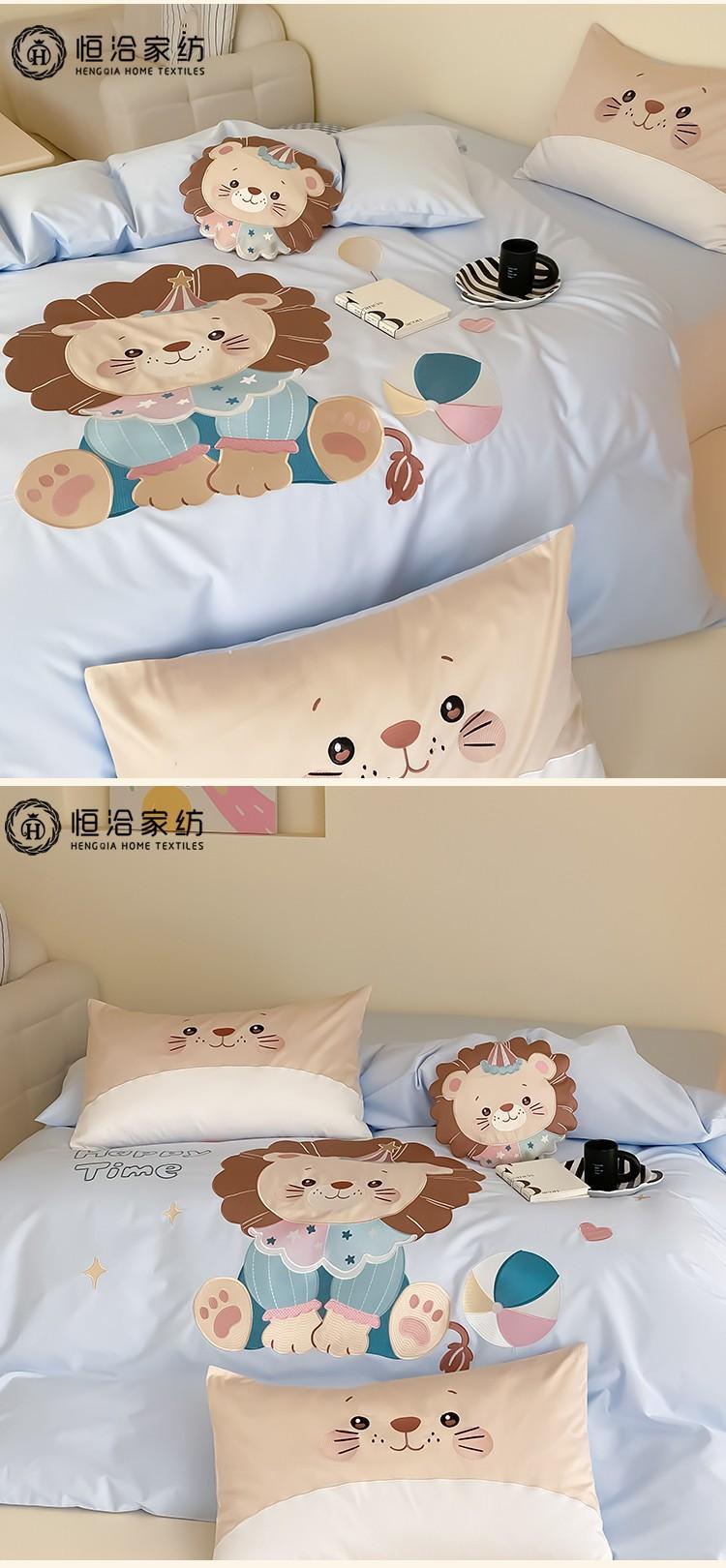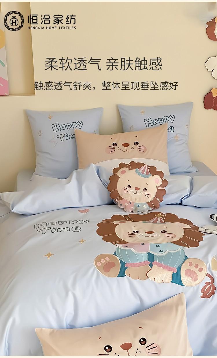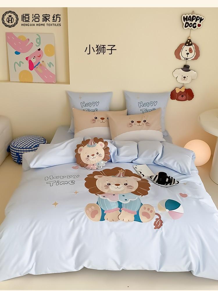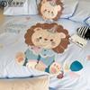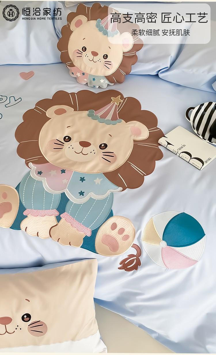 Lindo Juego de Cuatro Piezas de Algodón de Fibra Larga Estilo Dibujo Animado Súper Suave Algodón Puro Bordado de Leoncito Funda Nórdica Ropa de Cama 1.2m