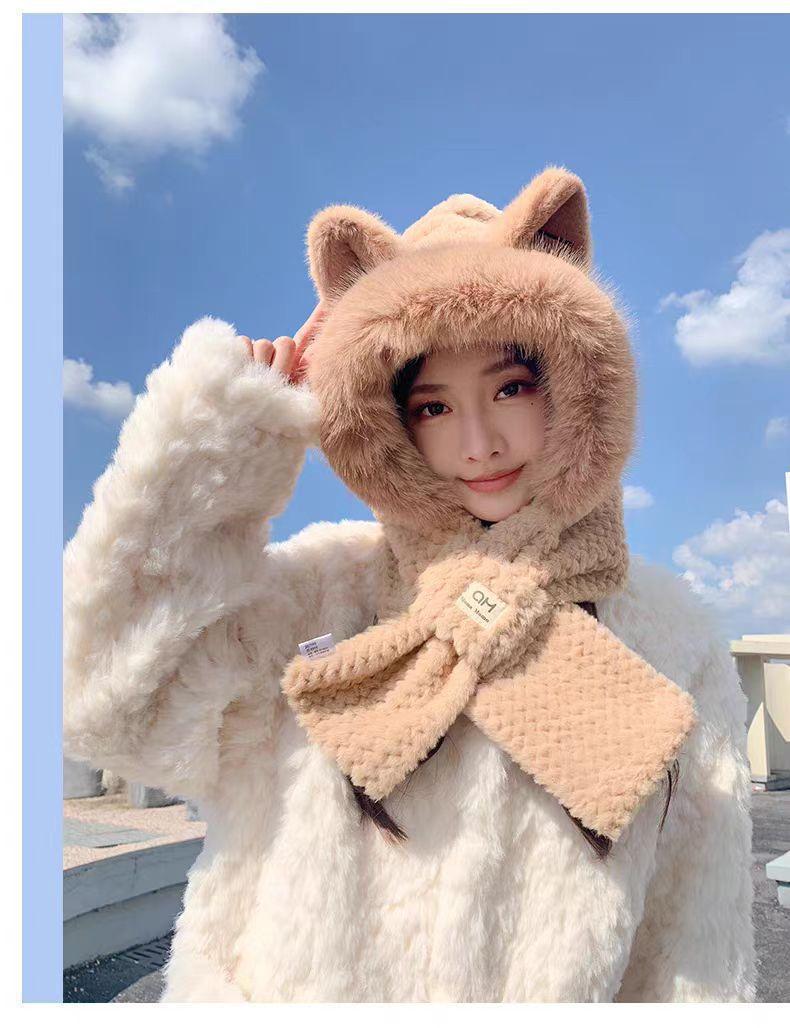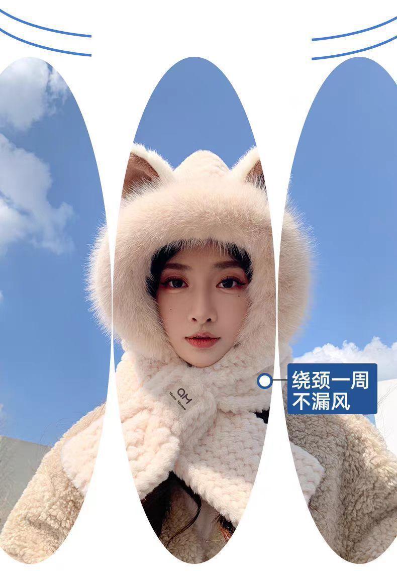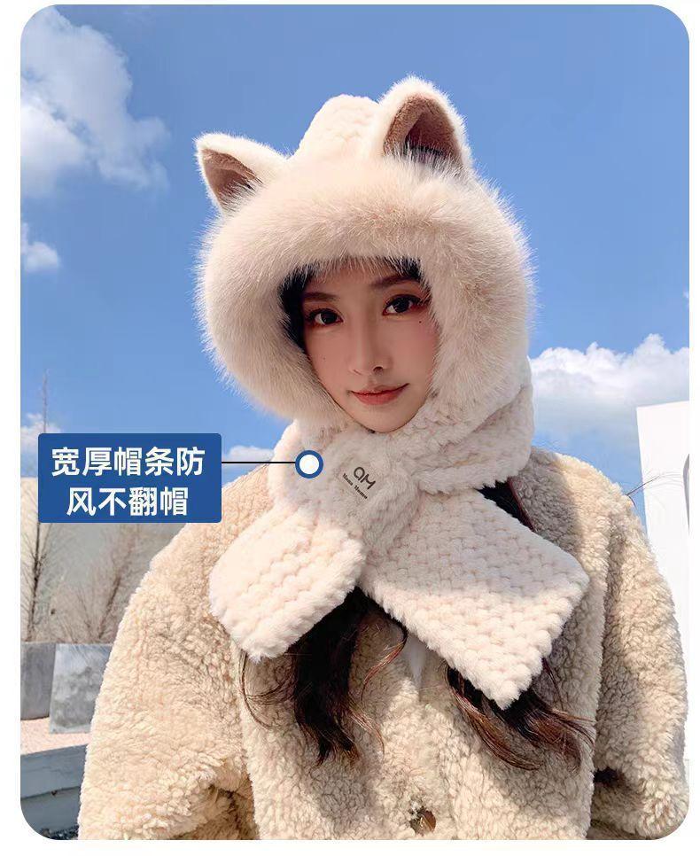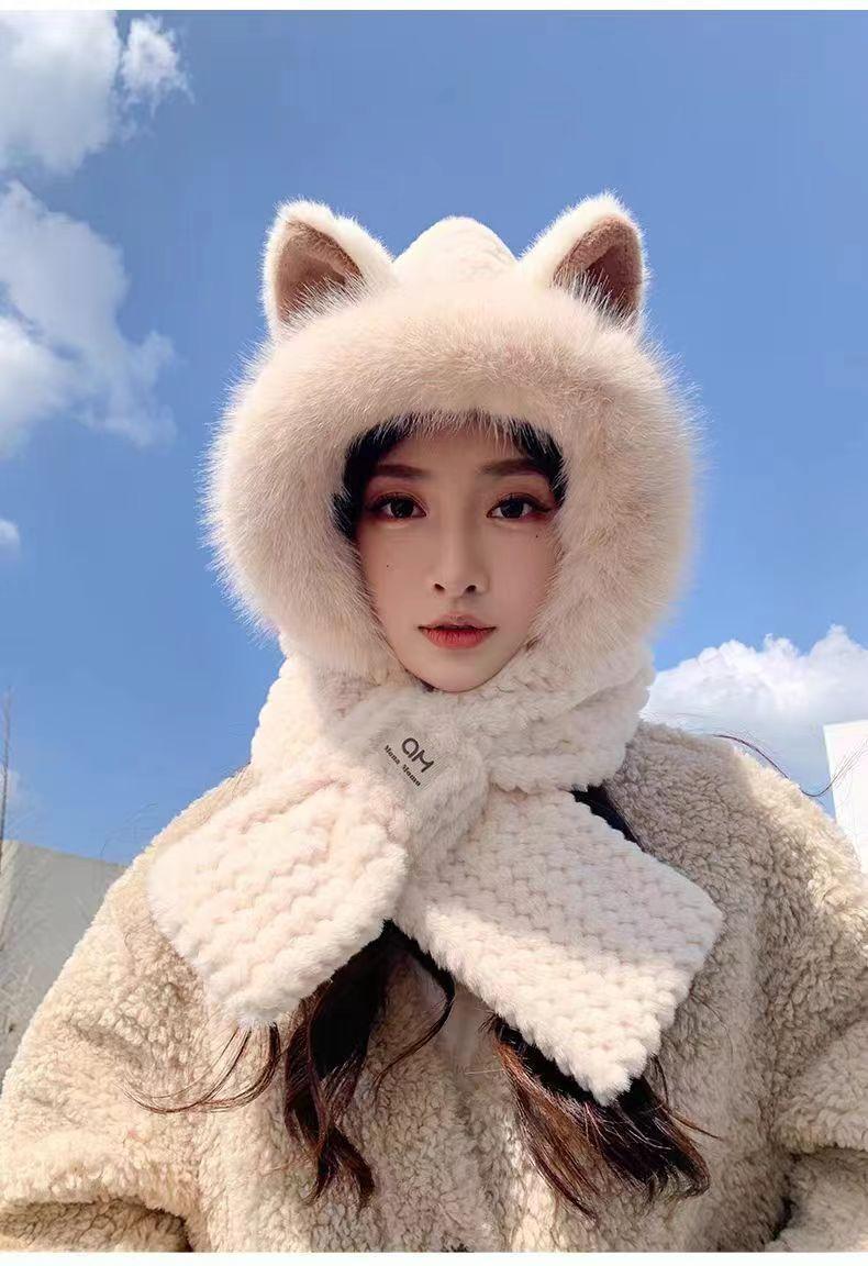 Gorro a Prueba de Frío con Orejas de Zorro para Mujer 2024 Nuevo Lindo Felpa Otoño e Invierno Versátil Moda Bufanda para el Cuello