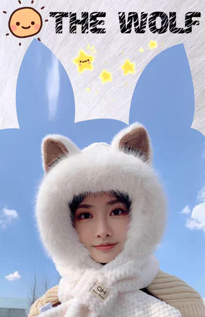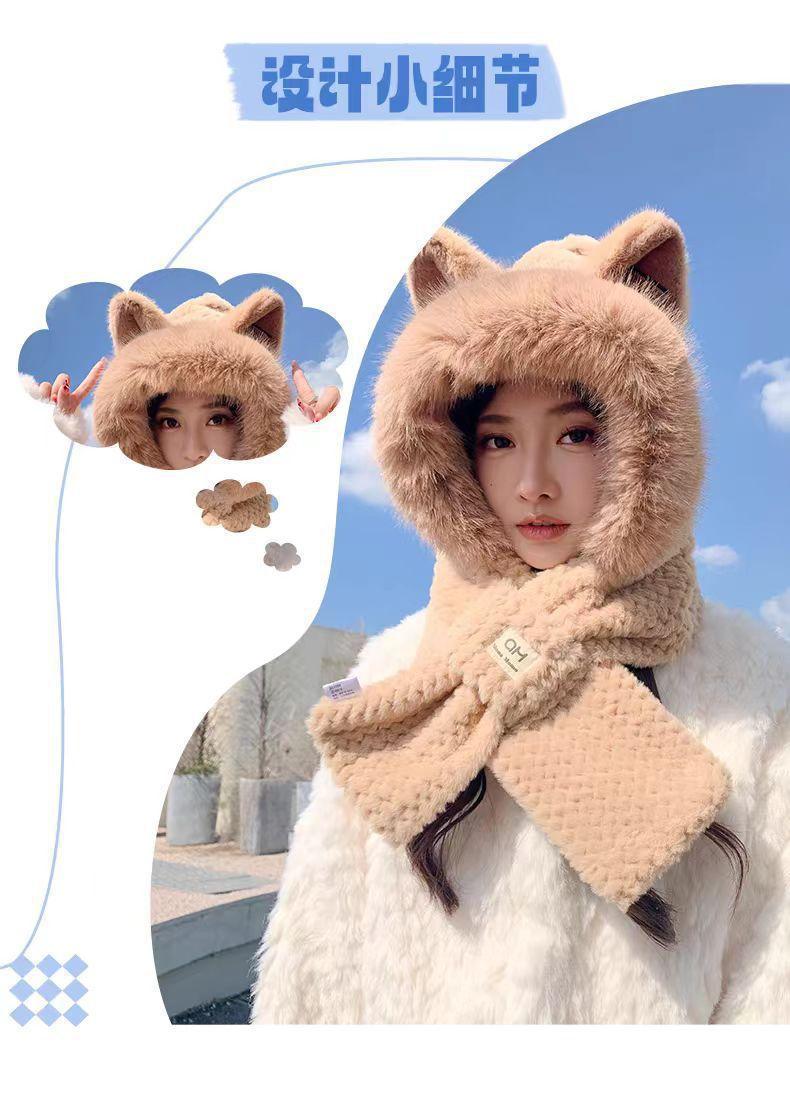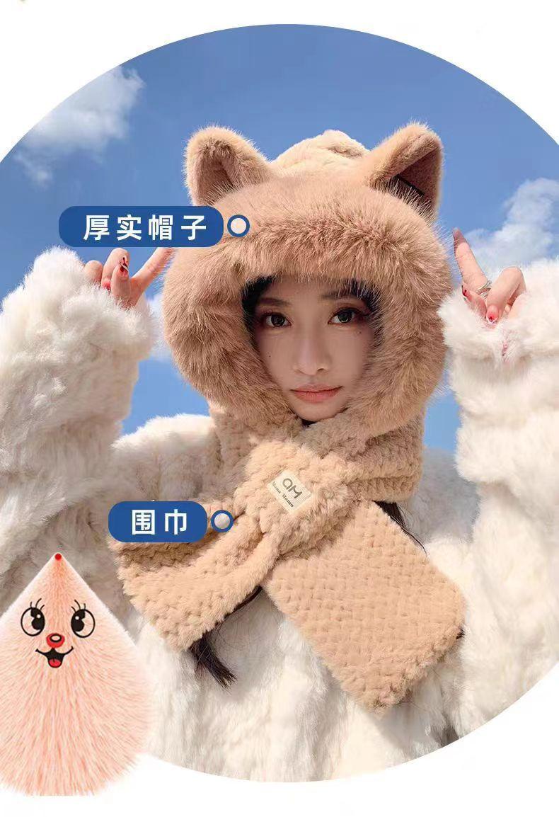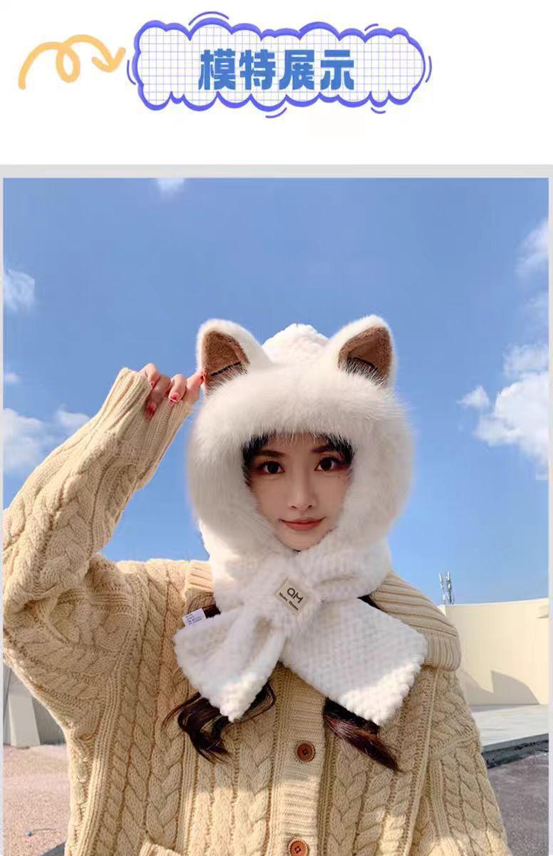 Gorro a Prueba de Frío con Orejas de Zorro para Mujer 2024 Nuevo Lindo Felpa Otoño e Invierno Versátil Moda Bufanda para el Cuello