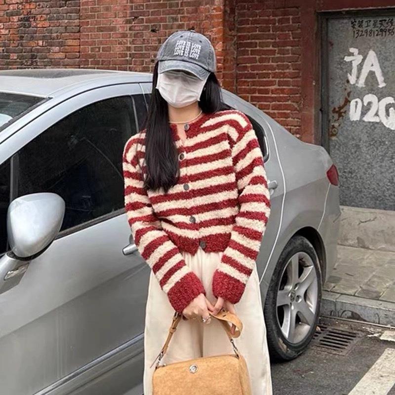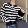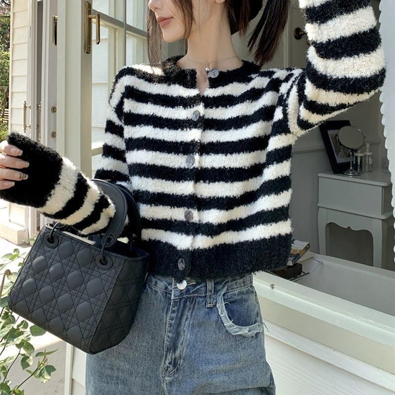 2023 Otoño e Invierno Nuevo Estilo Coreano Retro Suéter de Cuello Redondo a Rayas Moda de Mujer Estilo Suave Ceroso Delicado Cárdigan de Punto Combinable