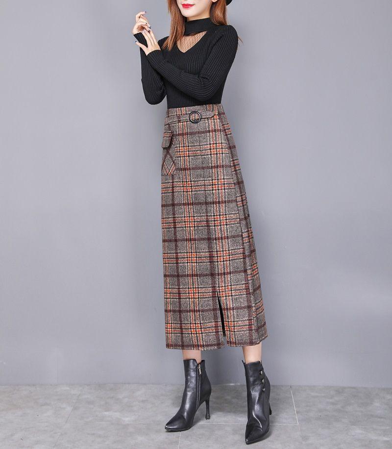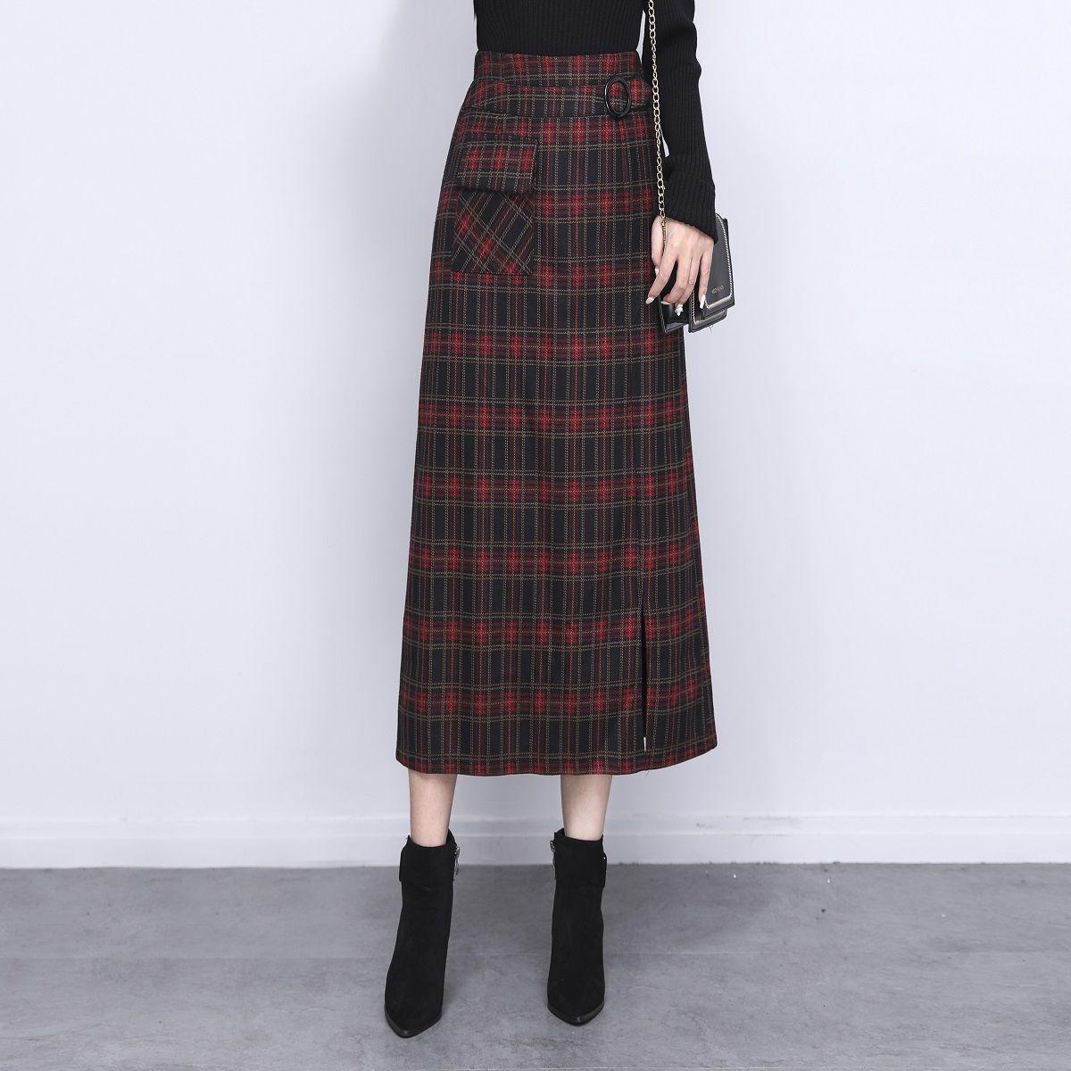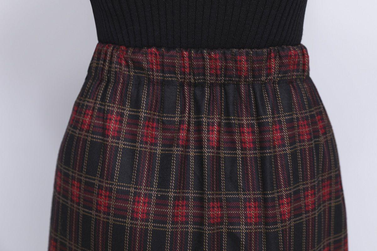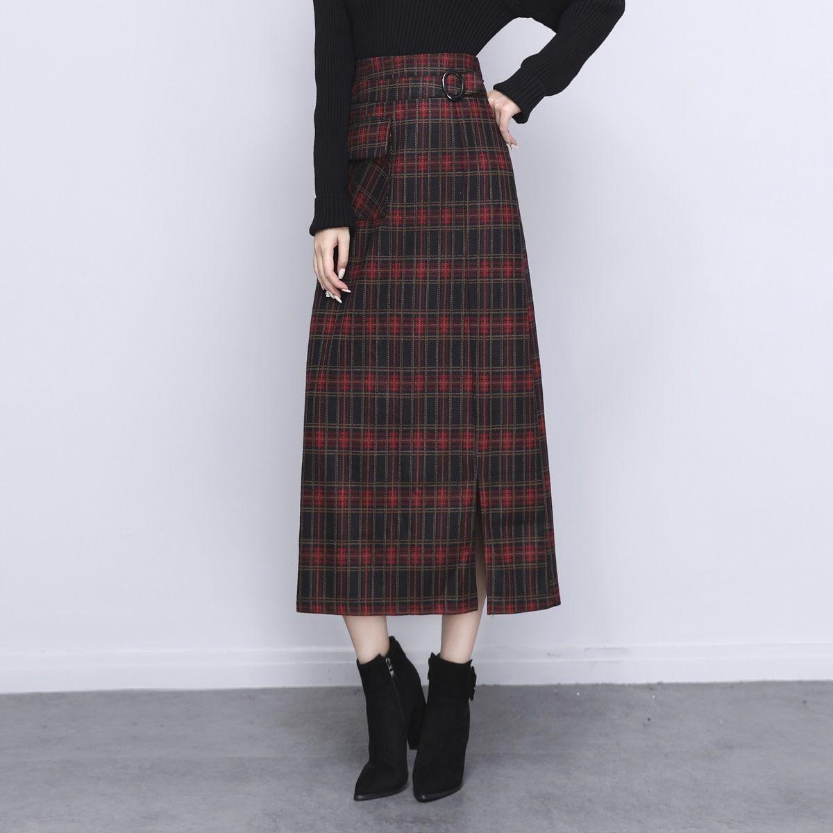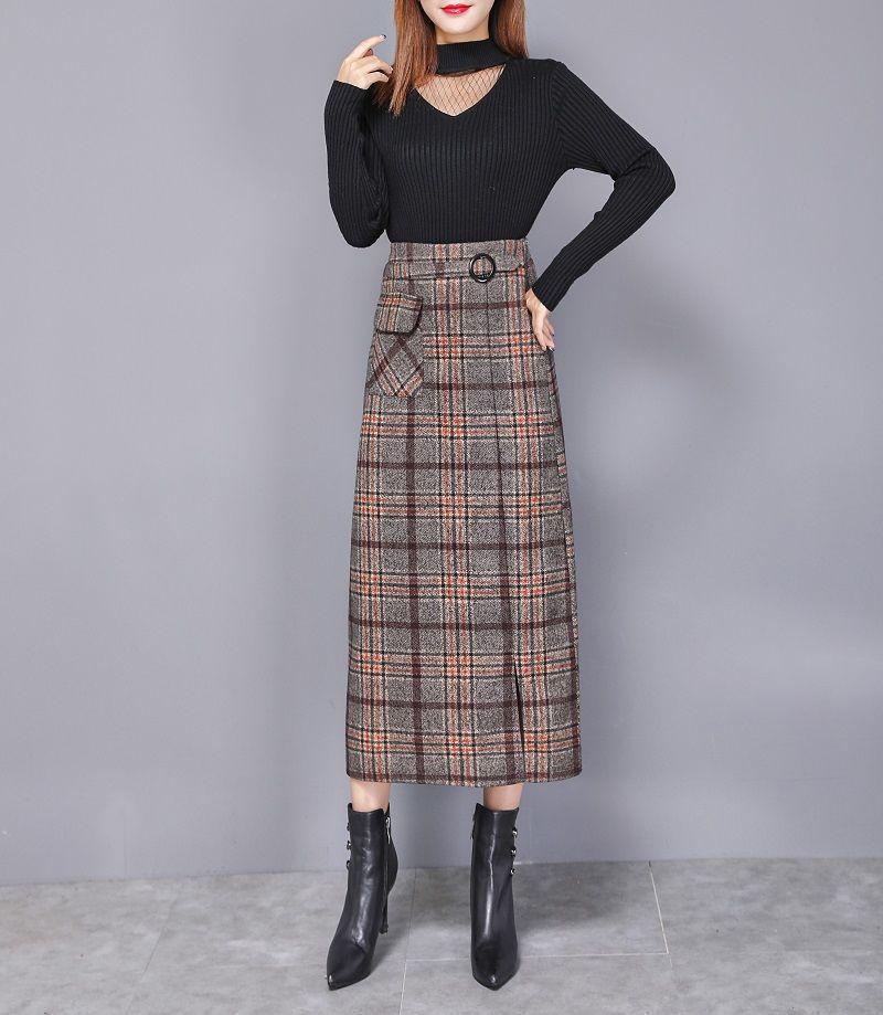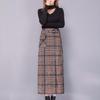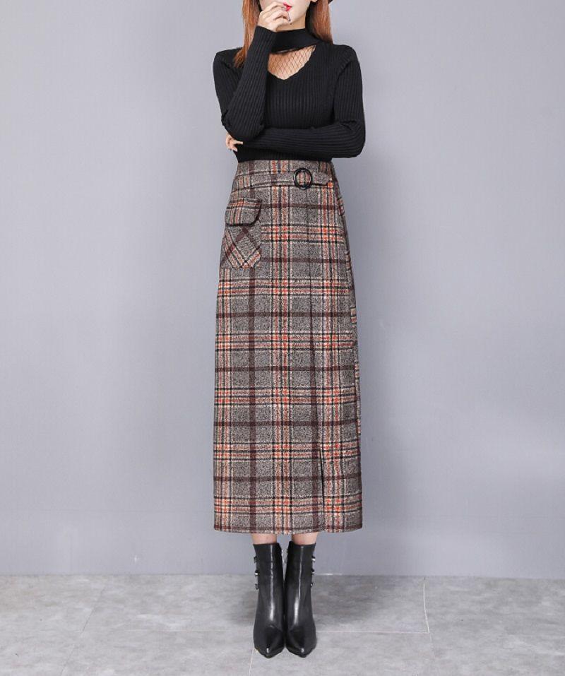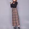 Falda de Lana a Cuadros Otoño e Invierno 2023 Nueva Falda Línea A Cadera Falda de Invierno Falda Paraguas de Largo Medio para Mujer Falda con Abertura