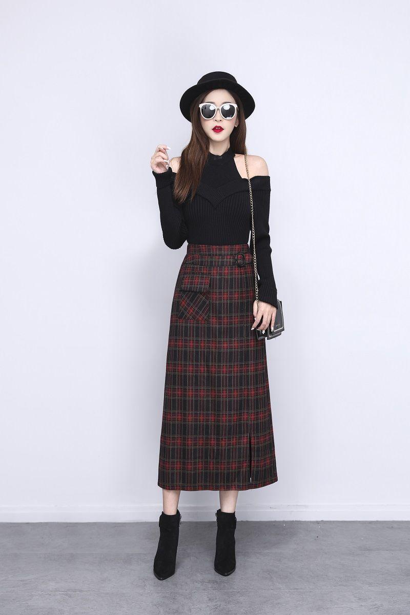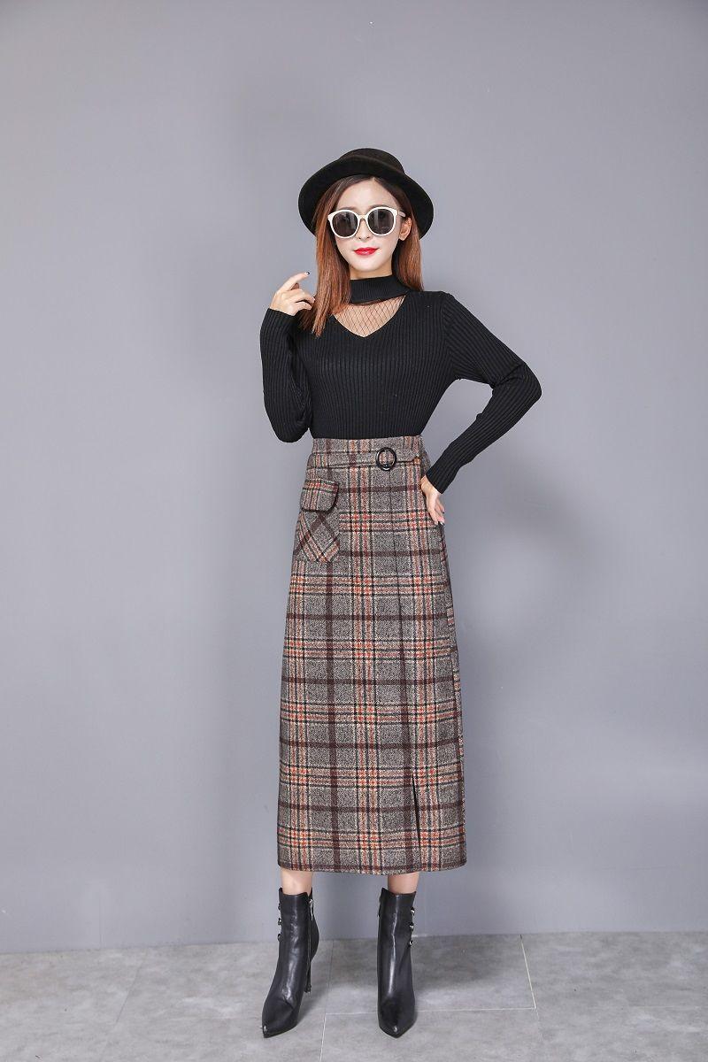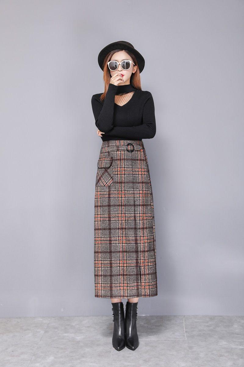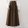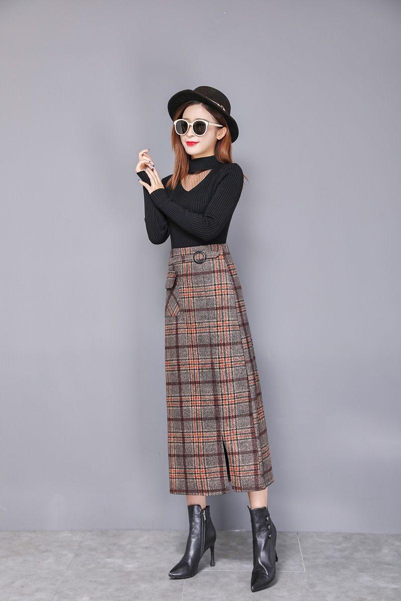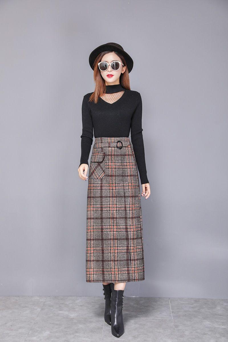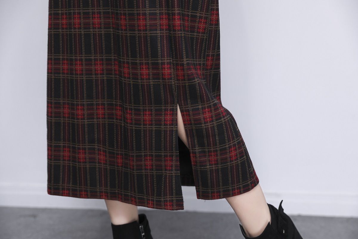 Falda de Lana a Cuadros Otoño e Invierno 2023 Nueva Falda Línea A Cadera Falda de Invierno Falda Paraguas de Largo Medio para Mujer Falda con Abertura