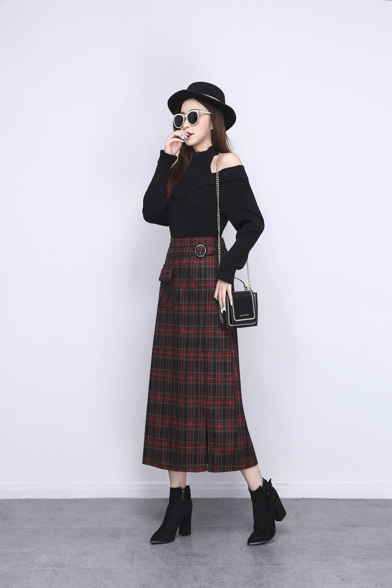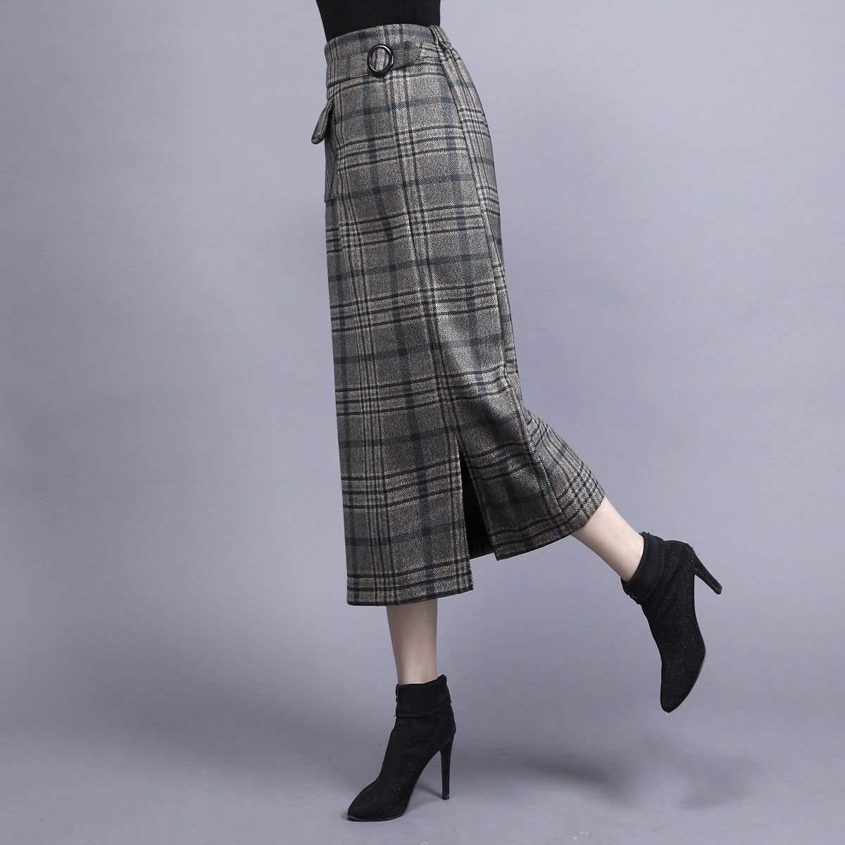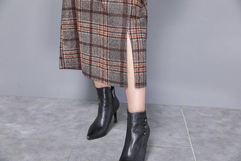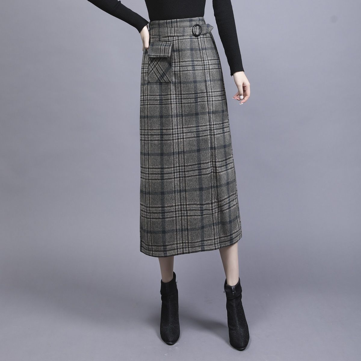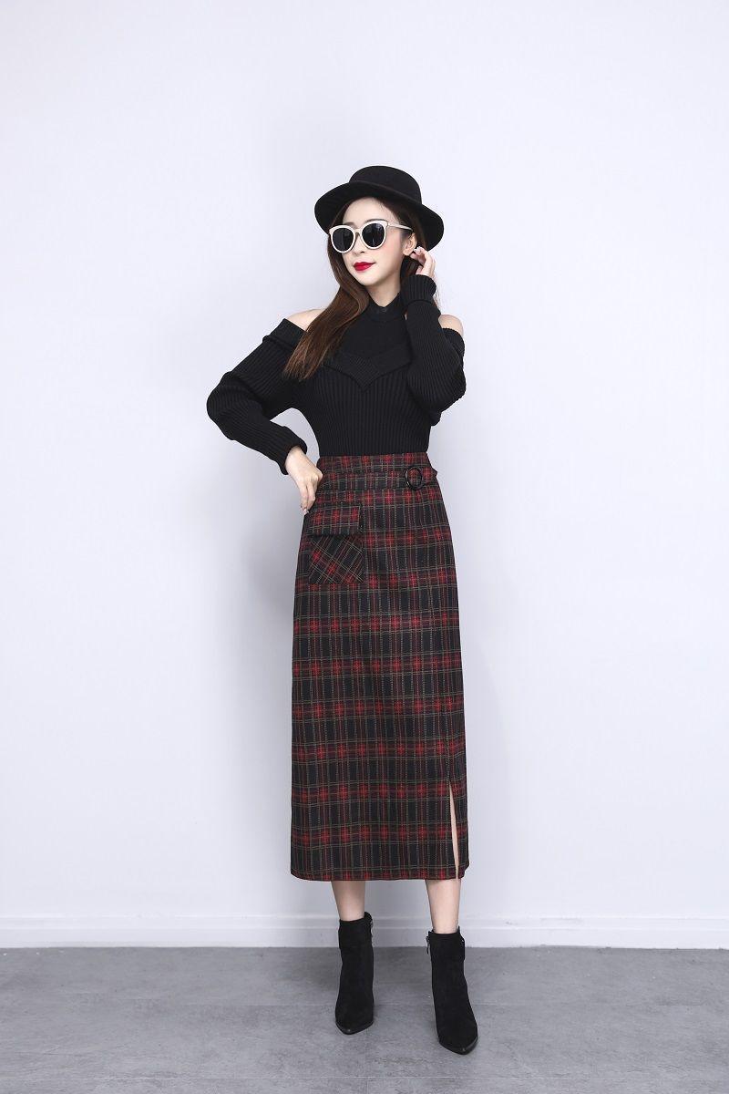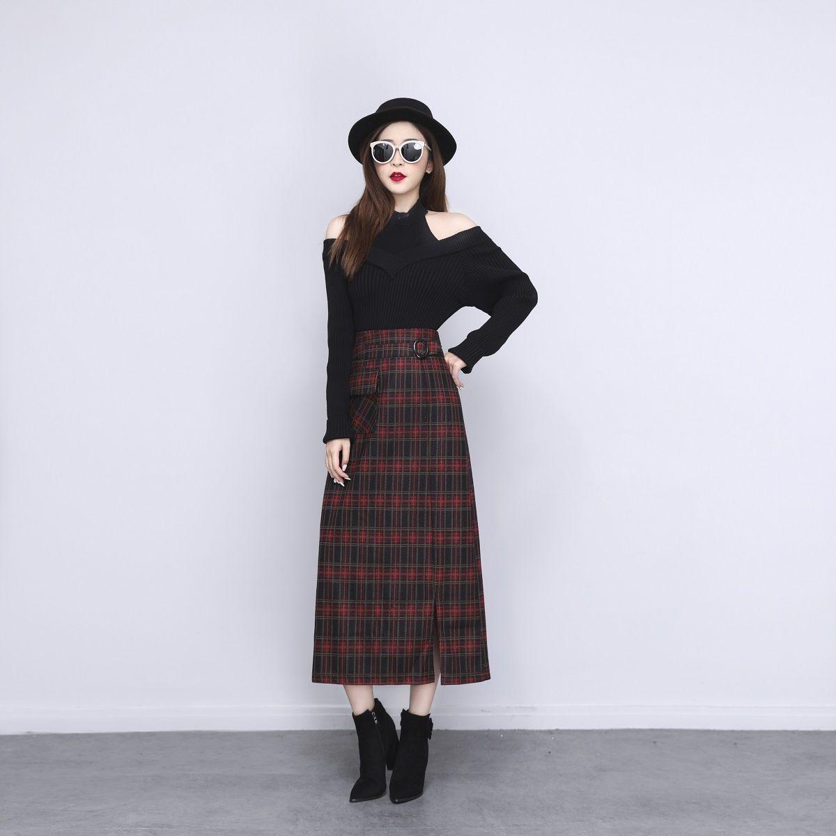 Falda de Lana a Cuadros Otoño e Invierno 2023 Nueva Falda Línea A Cadera Falda de Invierno Falda Paraguas de Largo Medio para Mujer Falda con Abertura