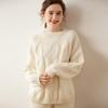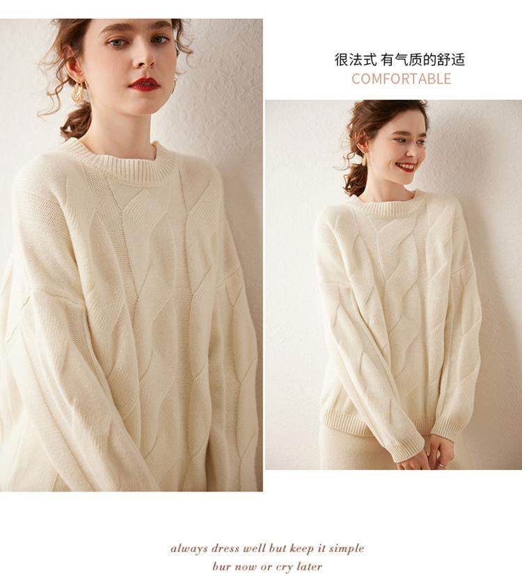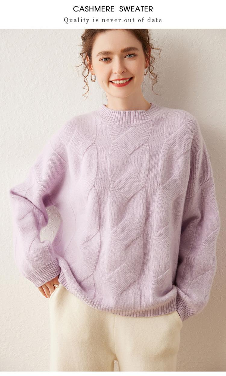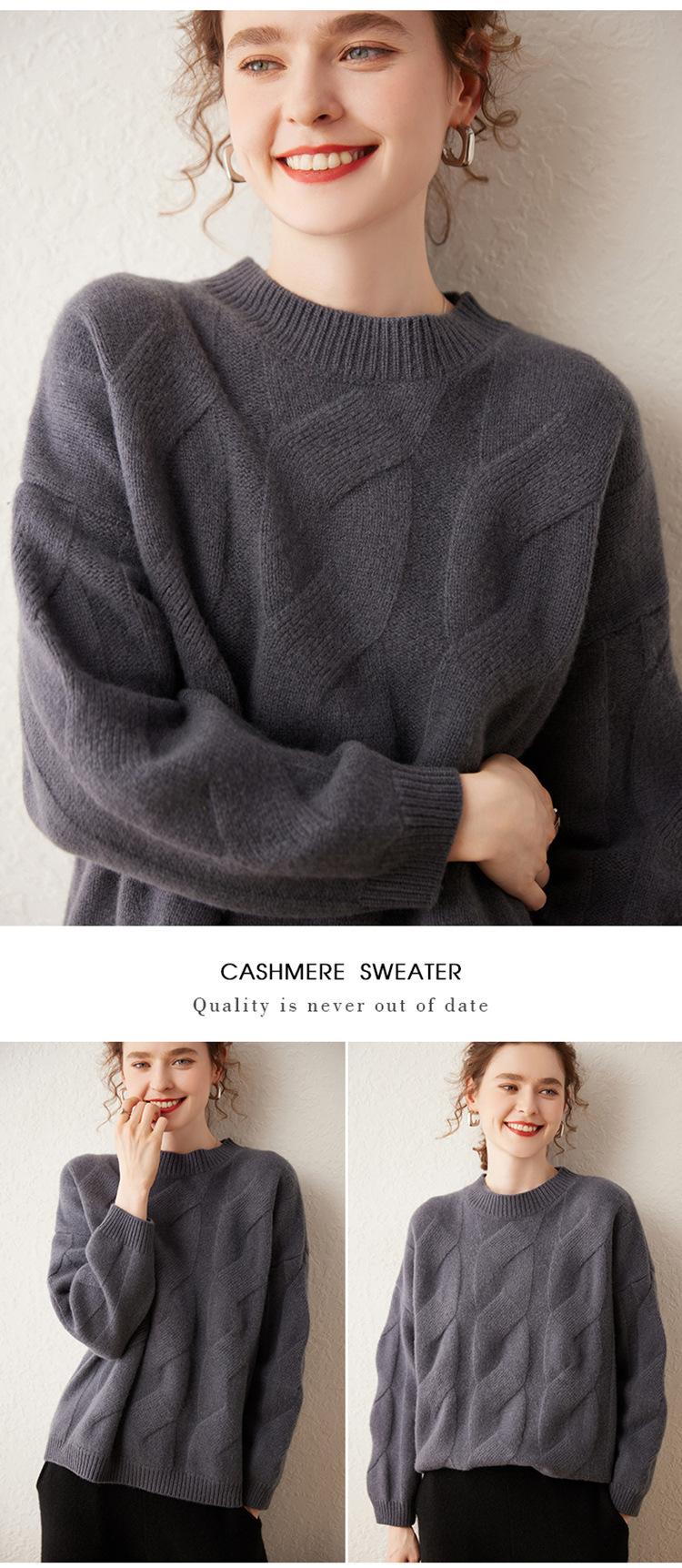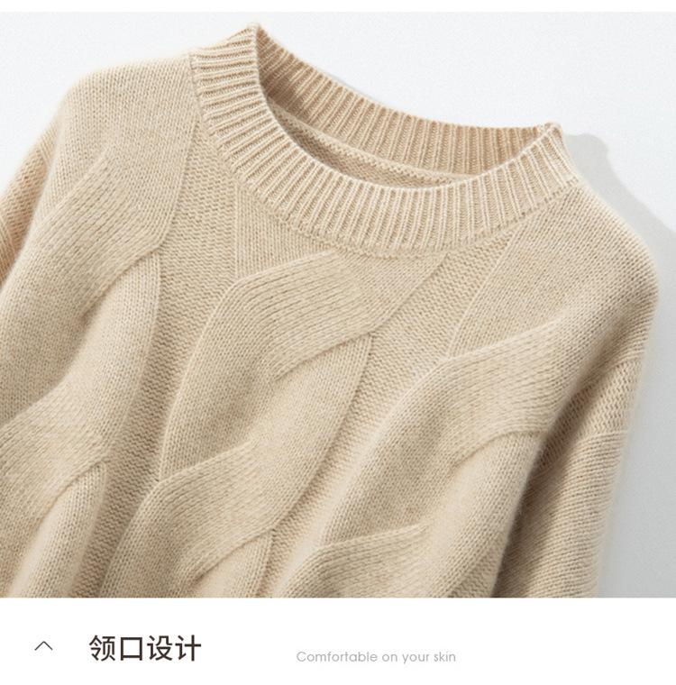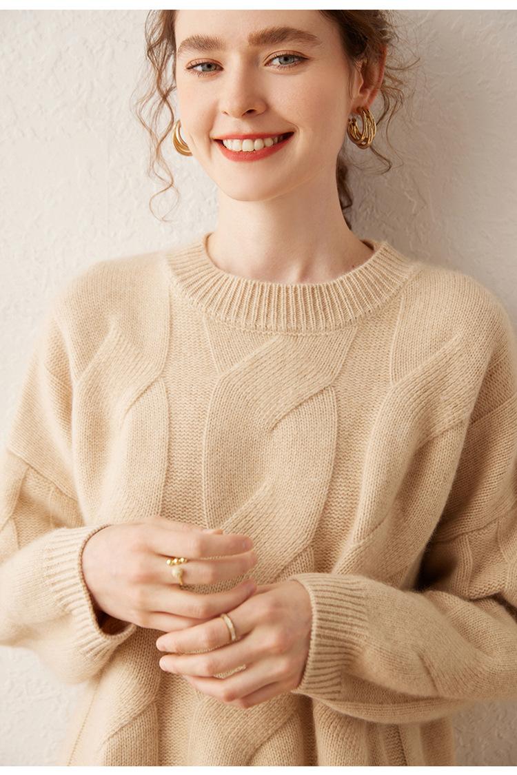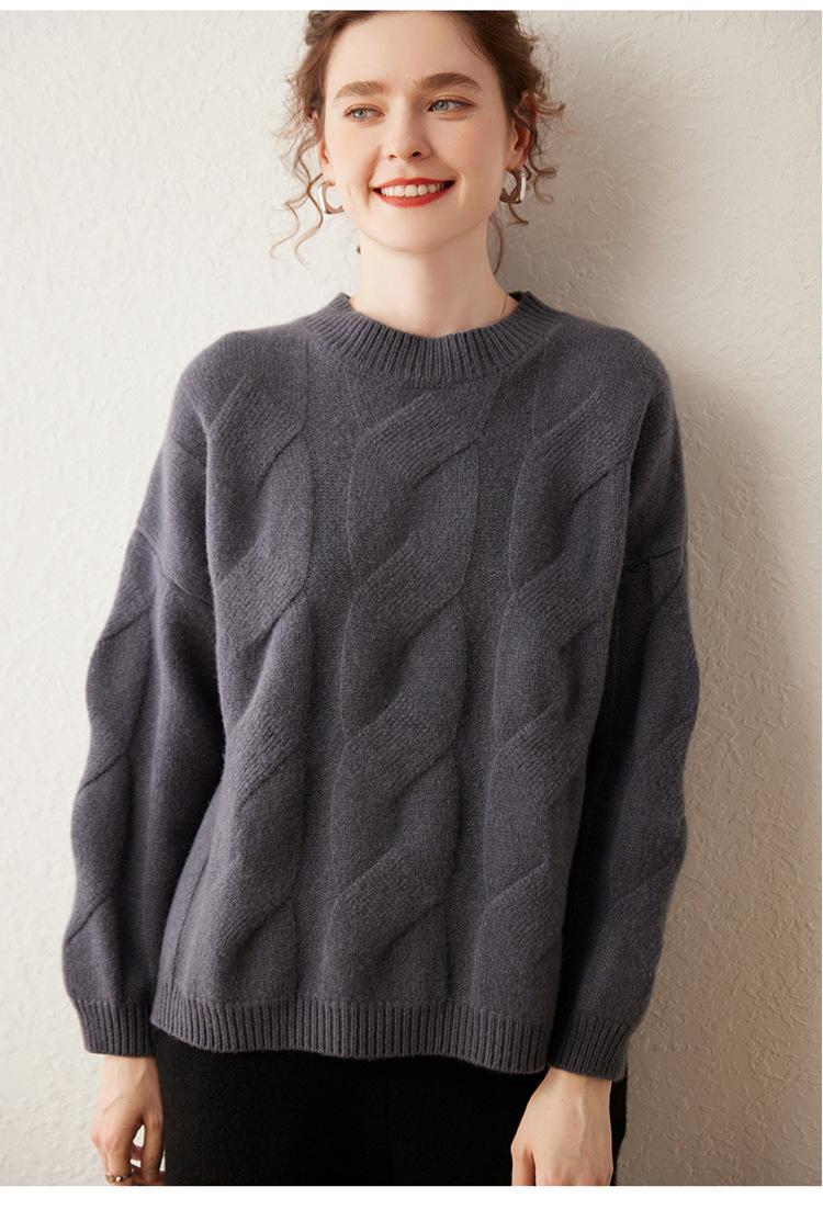 Suéter de cachemira de color puro para otoño e invierno de 2023 para mujer, cuello redondo, largo medio, tejido grueso trenzado grande, holgado casual para exterior