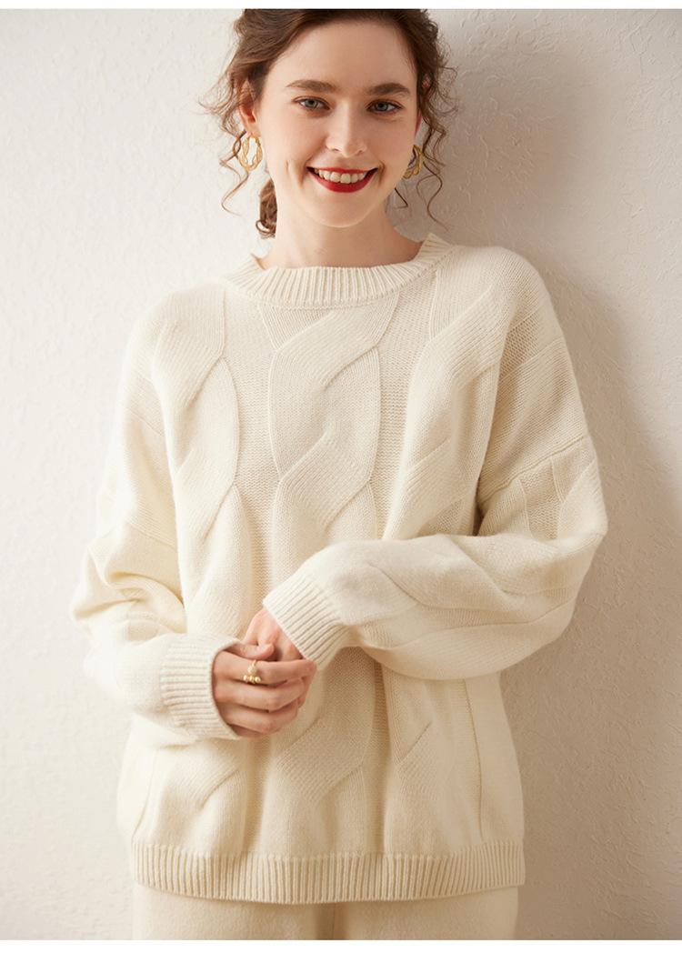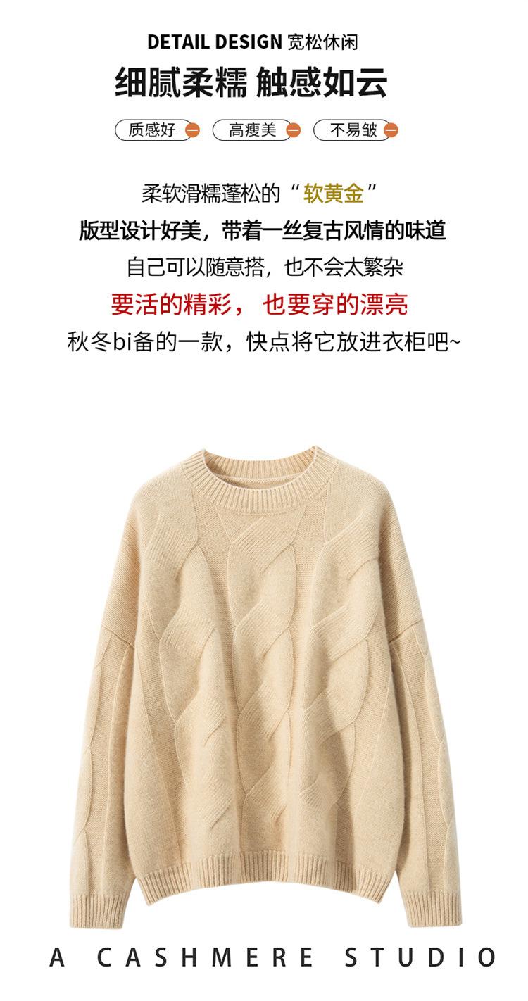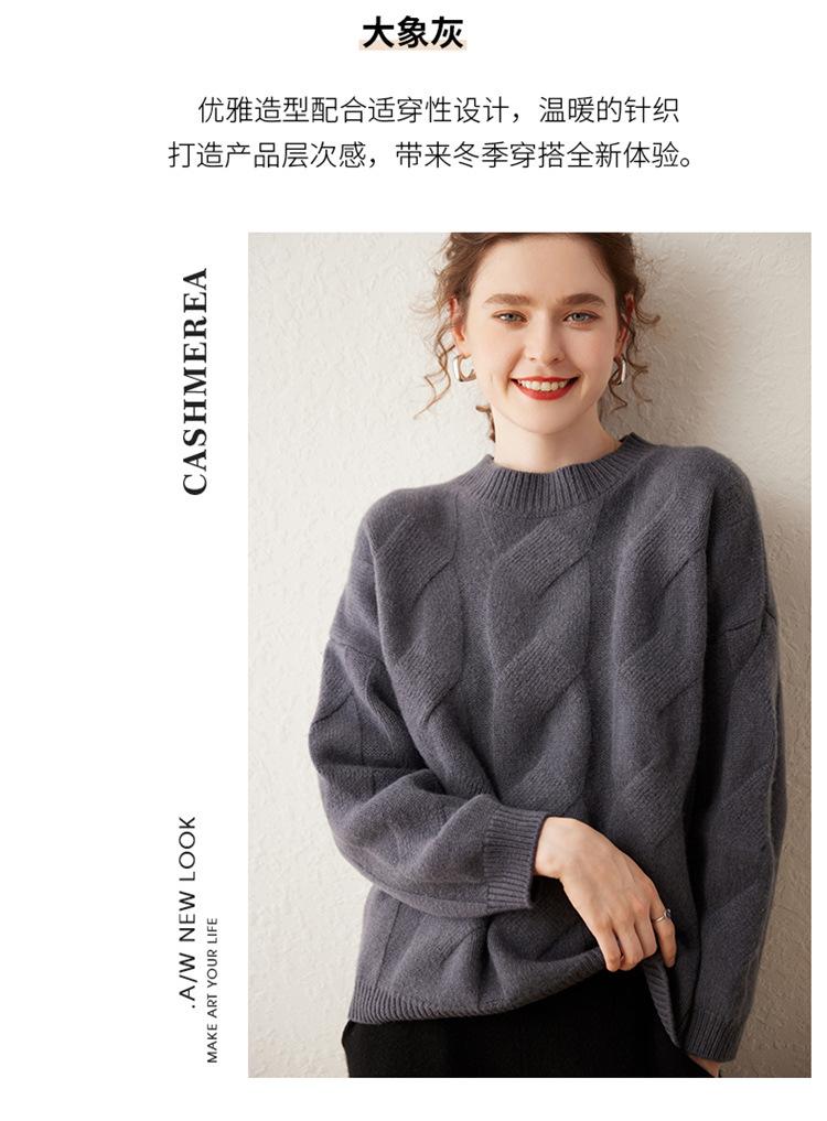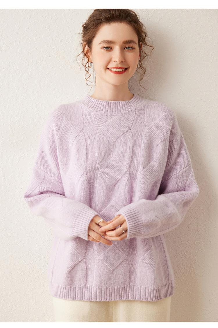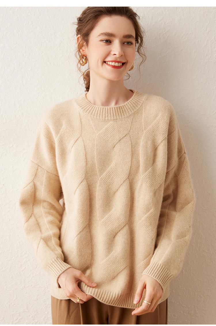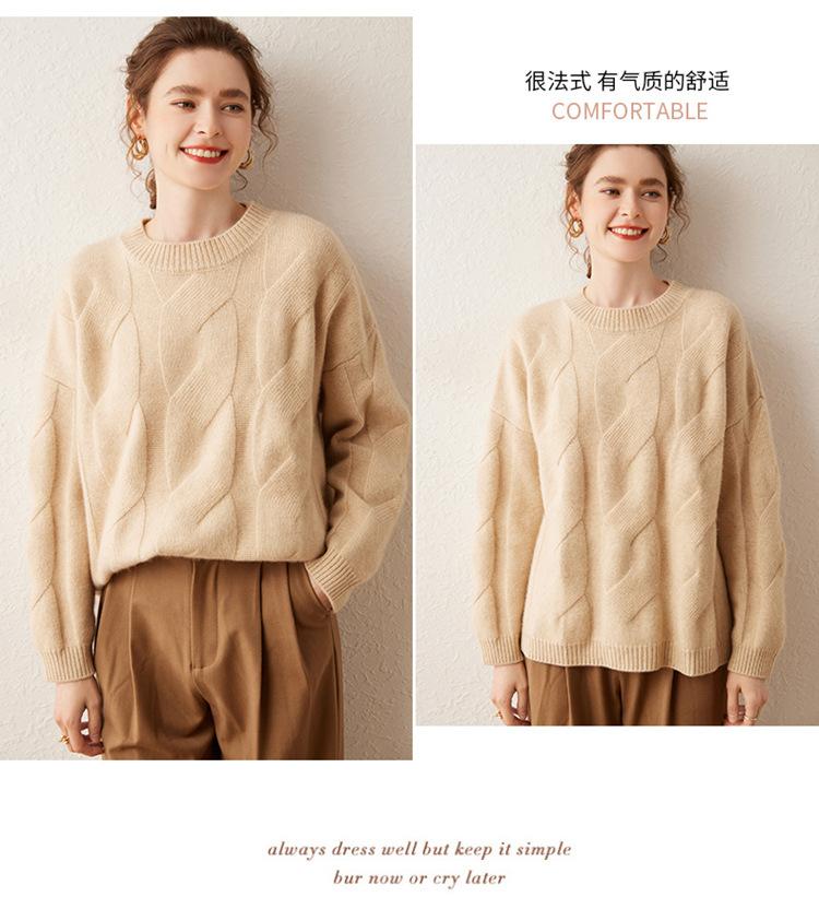 Suéter de cachemira de color puro para otoño e invierno de 2023 para mujer, cuello redondo, largo medio, tejido grueso trenzado grande, holgado casual para exterior