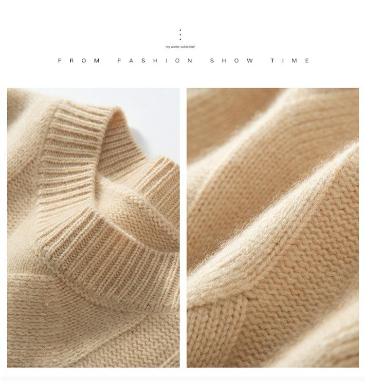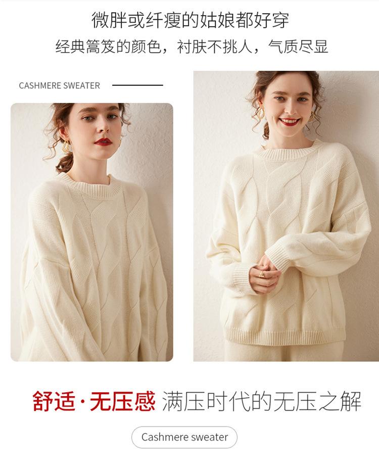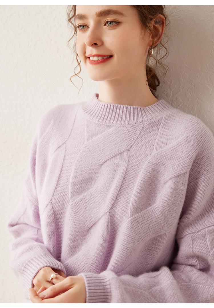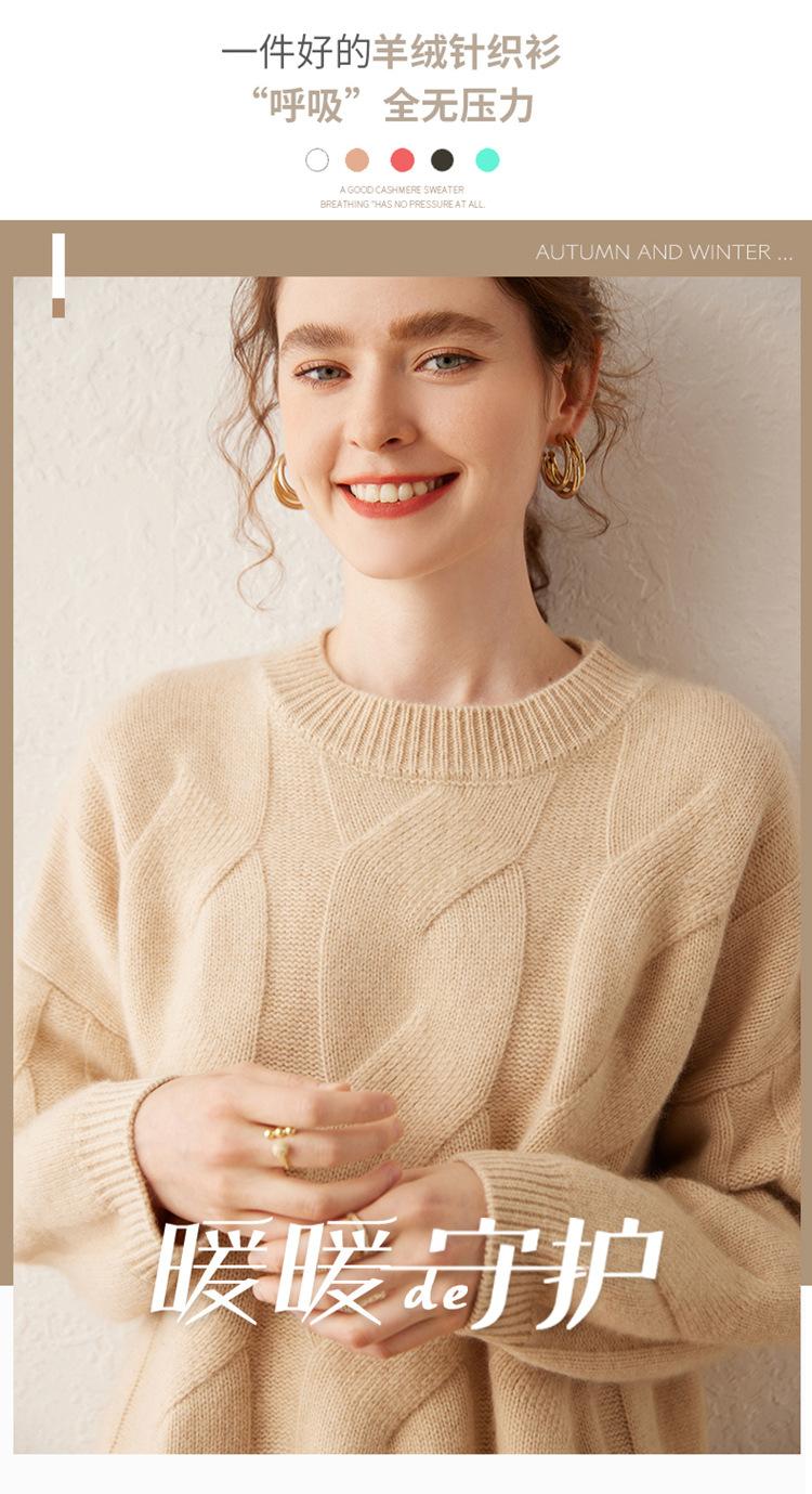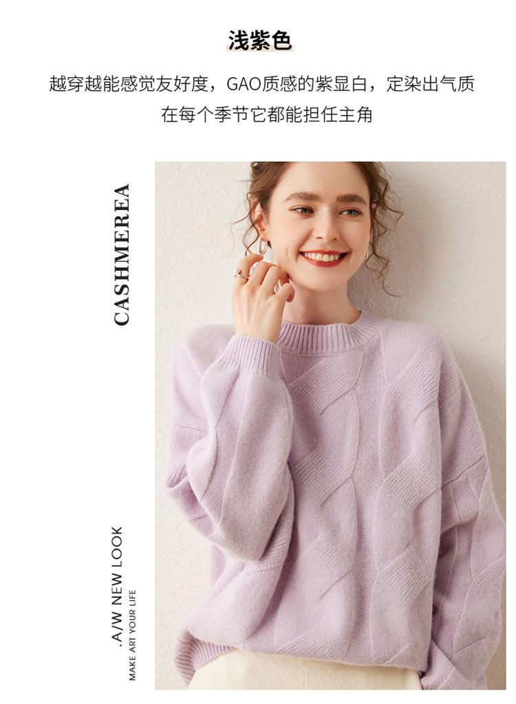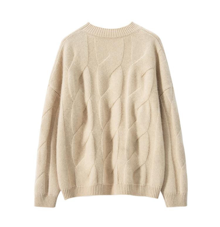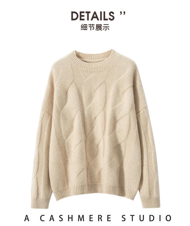 Suéter de cachemira de color puro para otoño e invierno de 2023 para mujer, cuello redondo, largo medio, tejido grueso trenzado grande, holgado casual para exterior