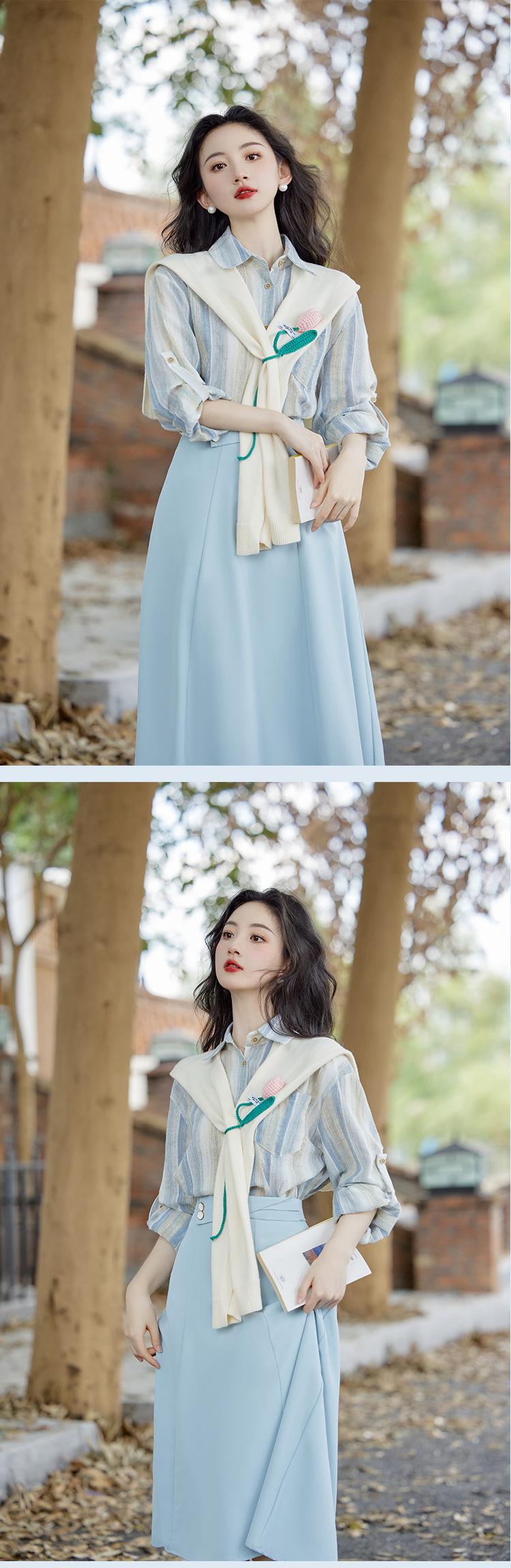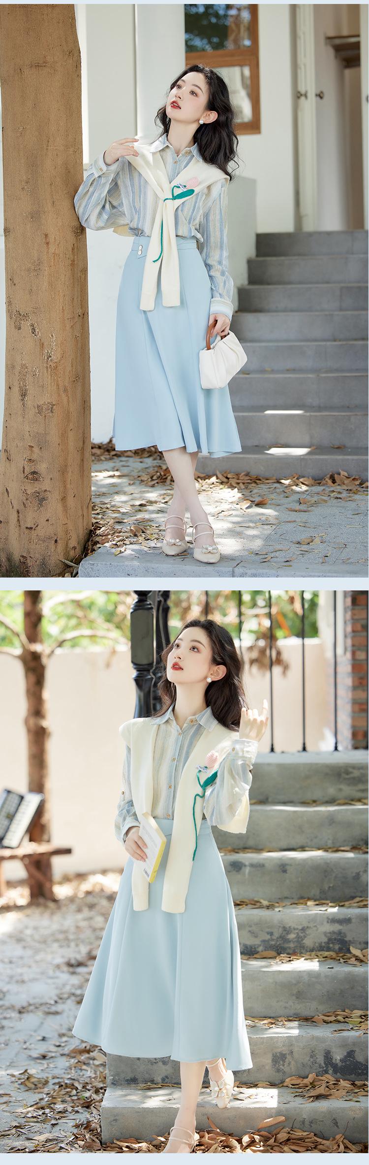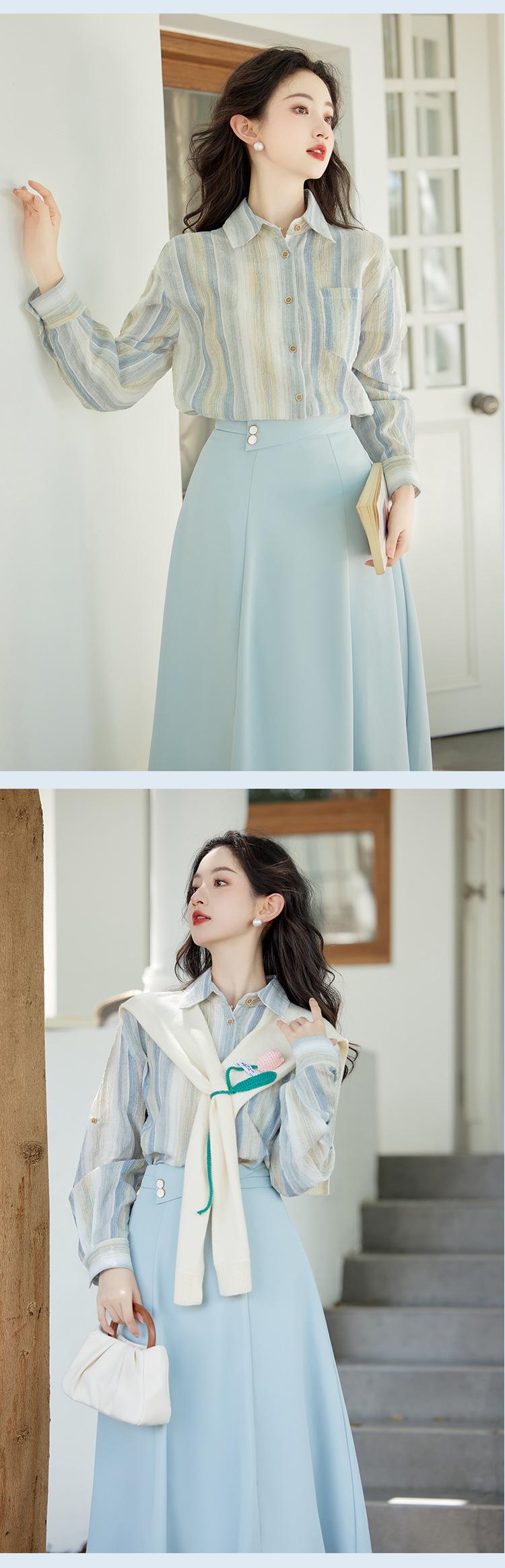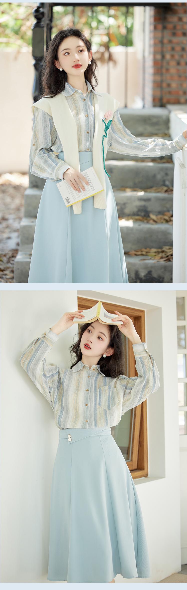 Foto real en stock Otoño nuevo commuter casual ladylike camisa falda midi conjunto de dos piezas
