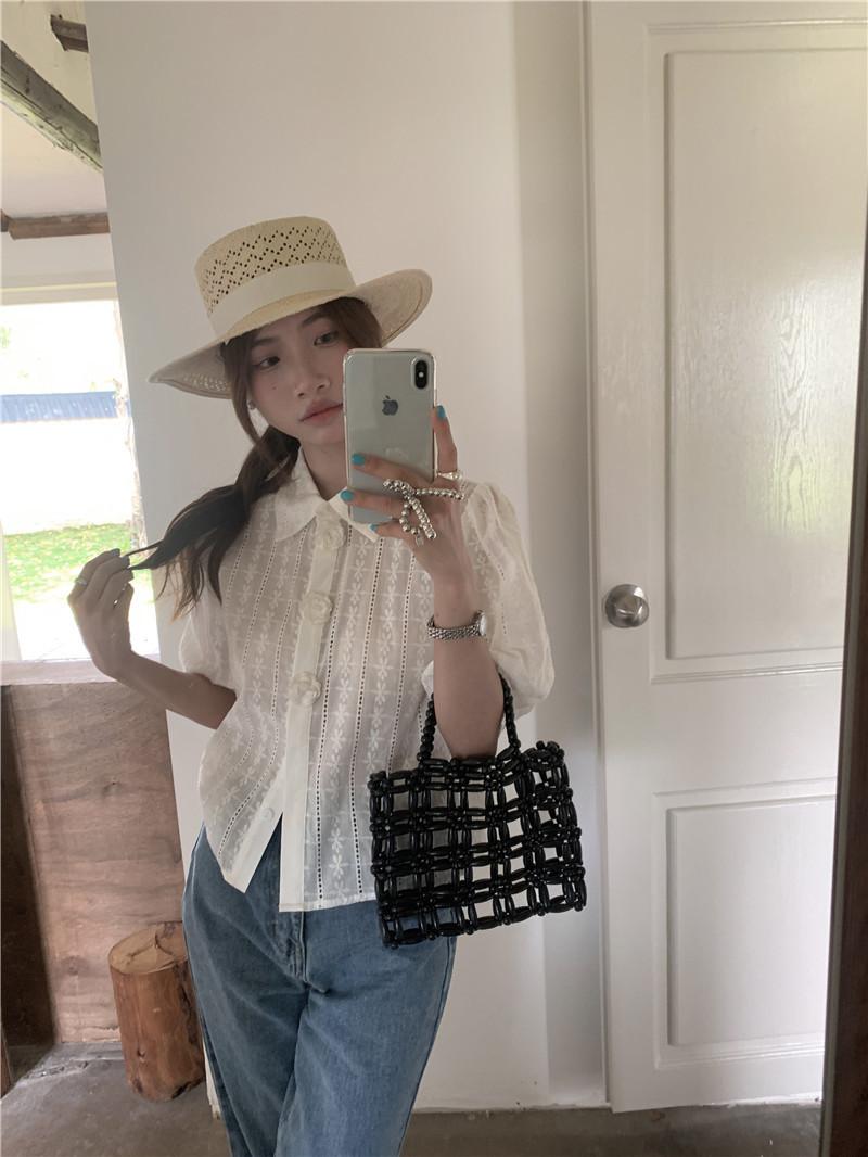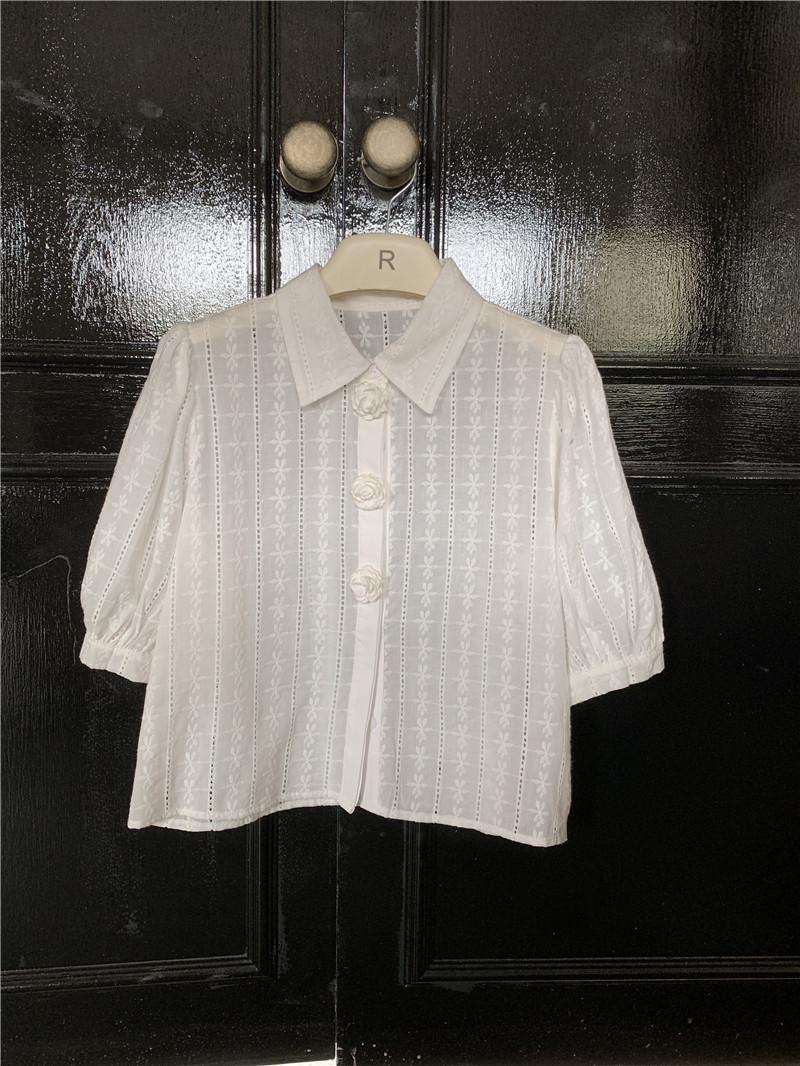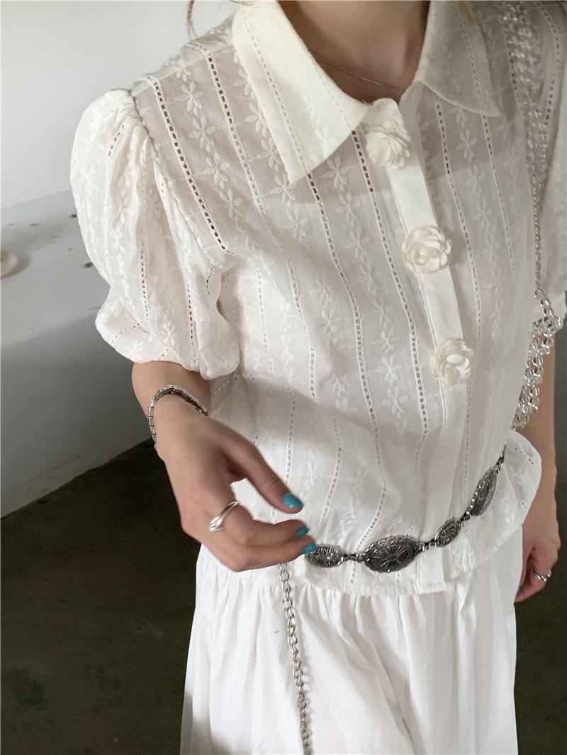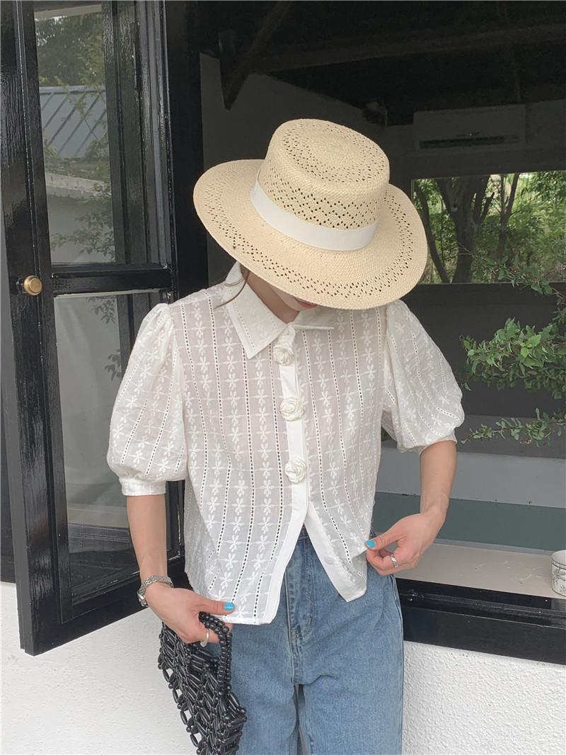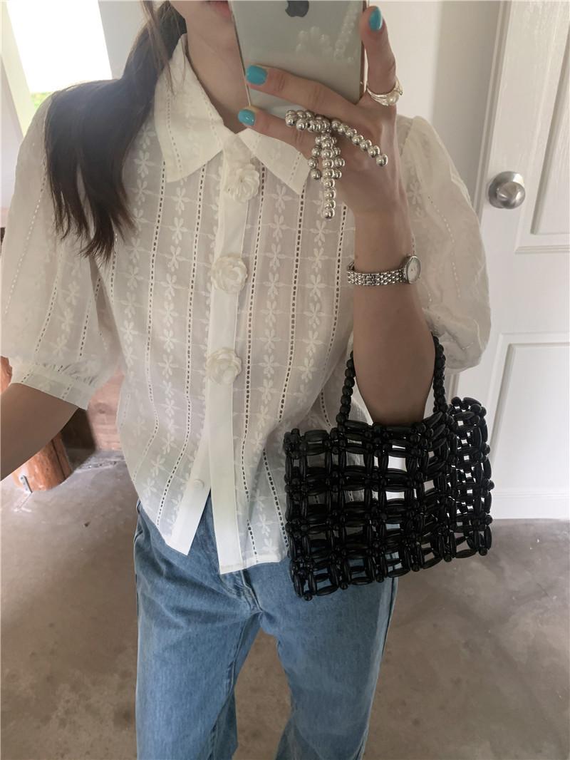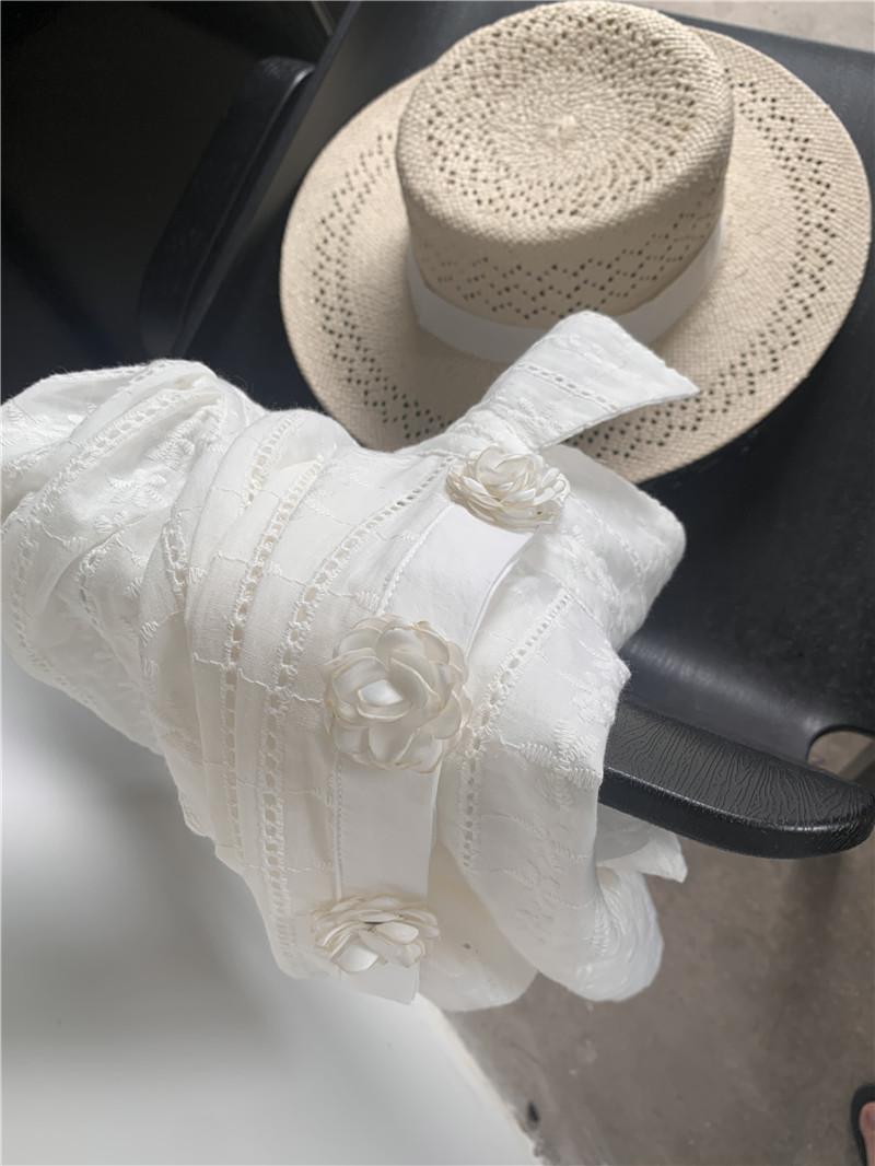 La decoración de botón de flor blanca está quemada con láser. El borde puede volverse amarillo. Por favor, tenga cuidado si le molesta.