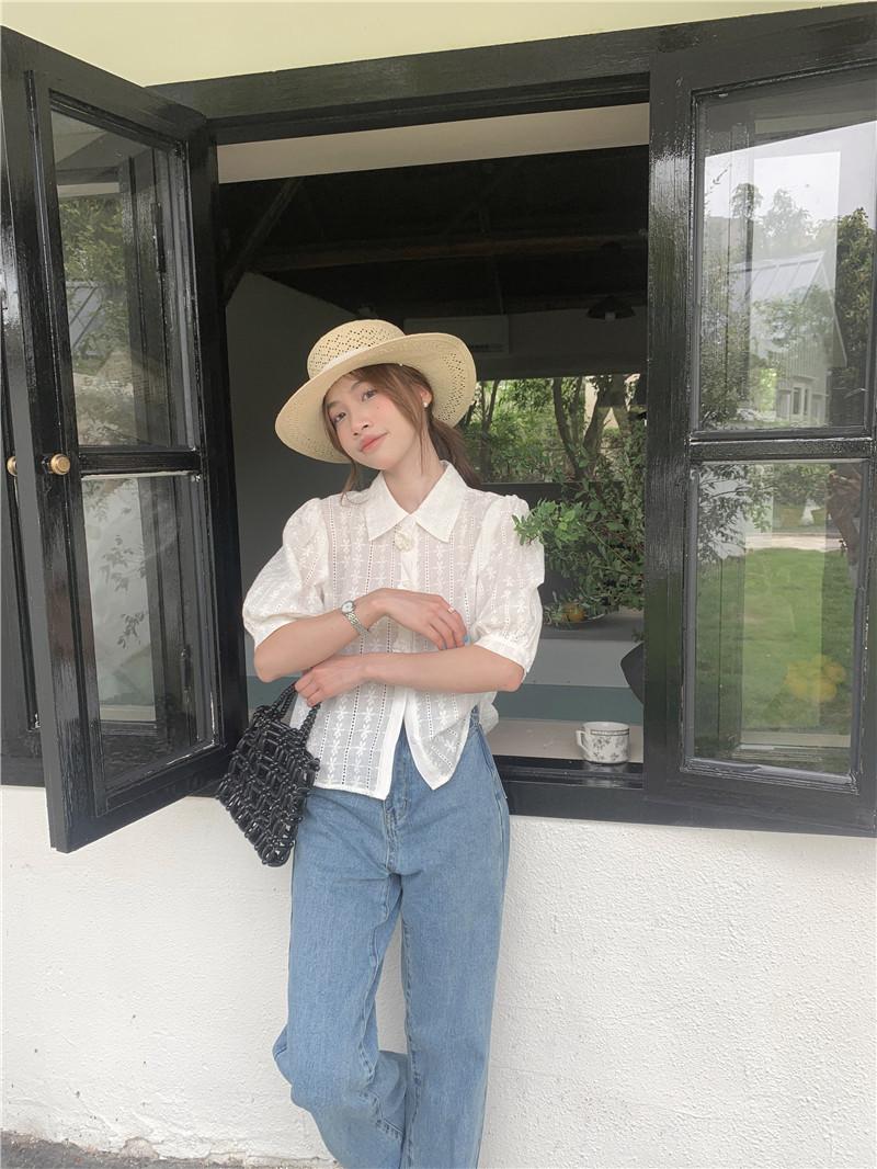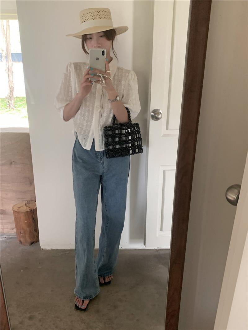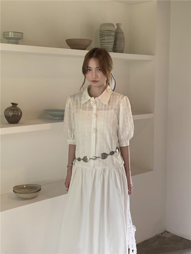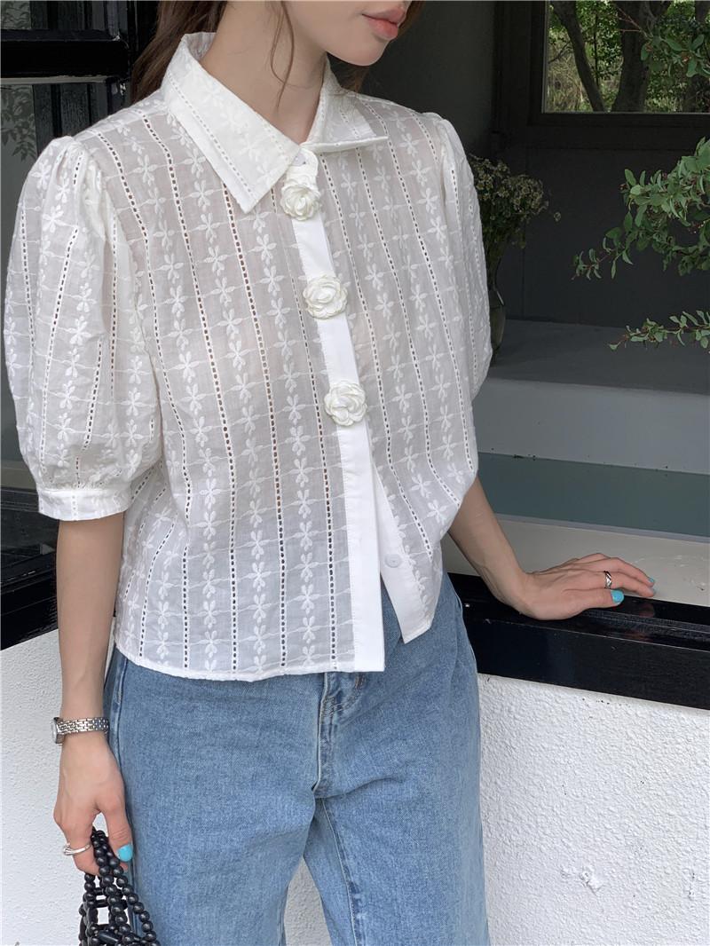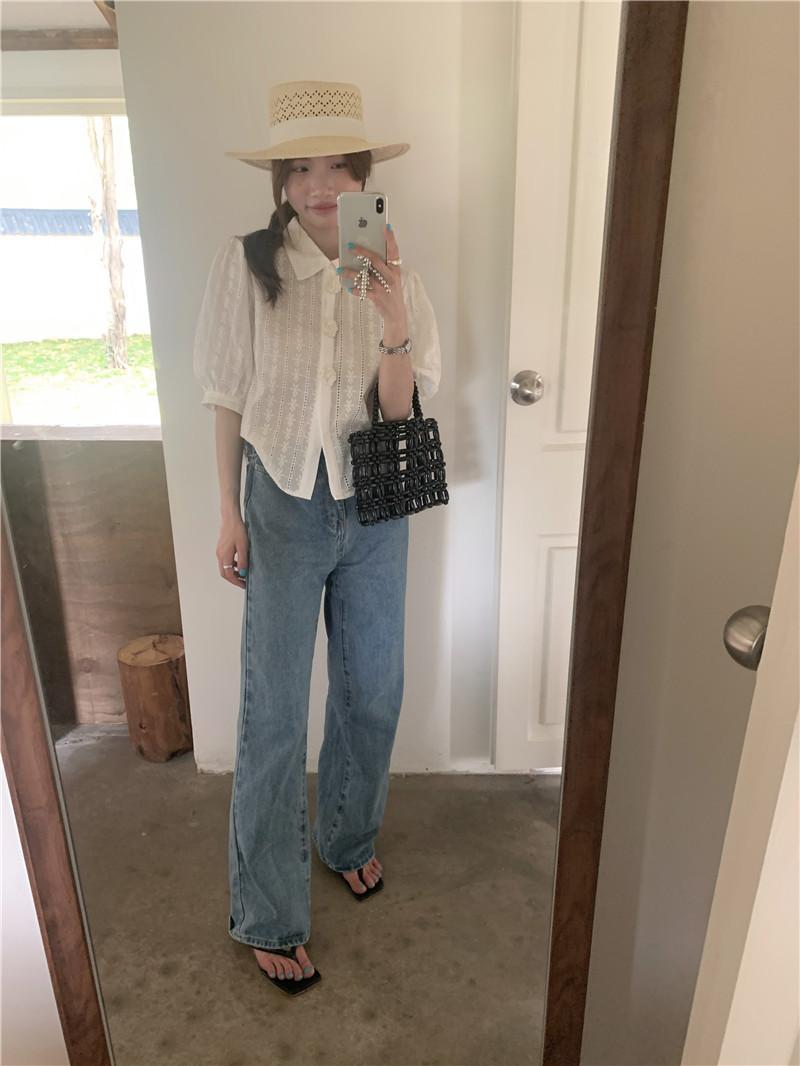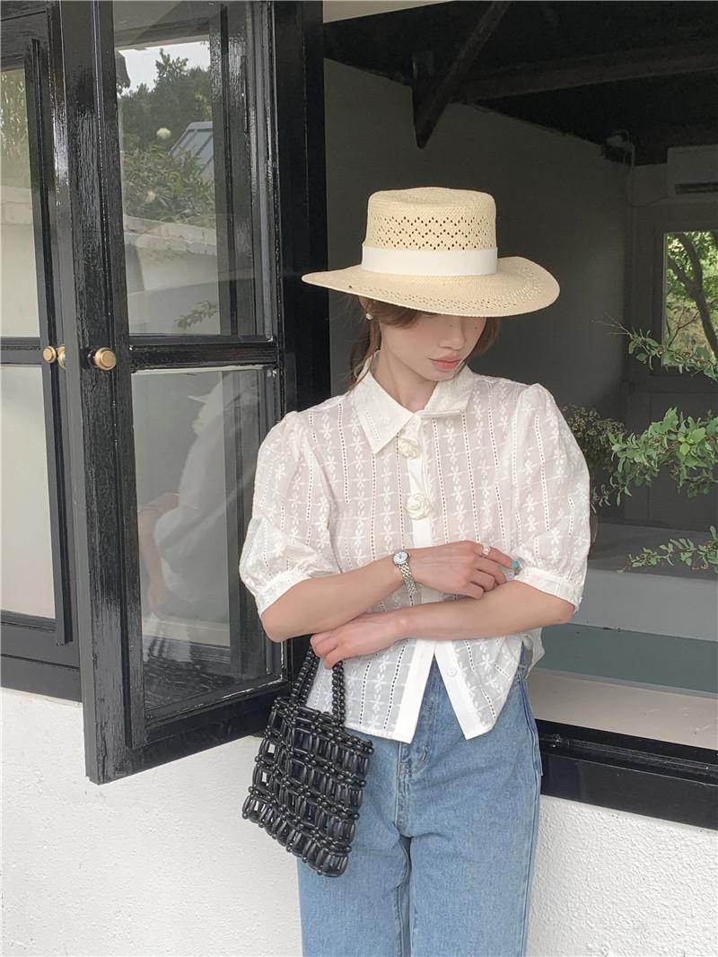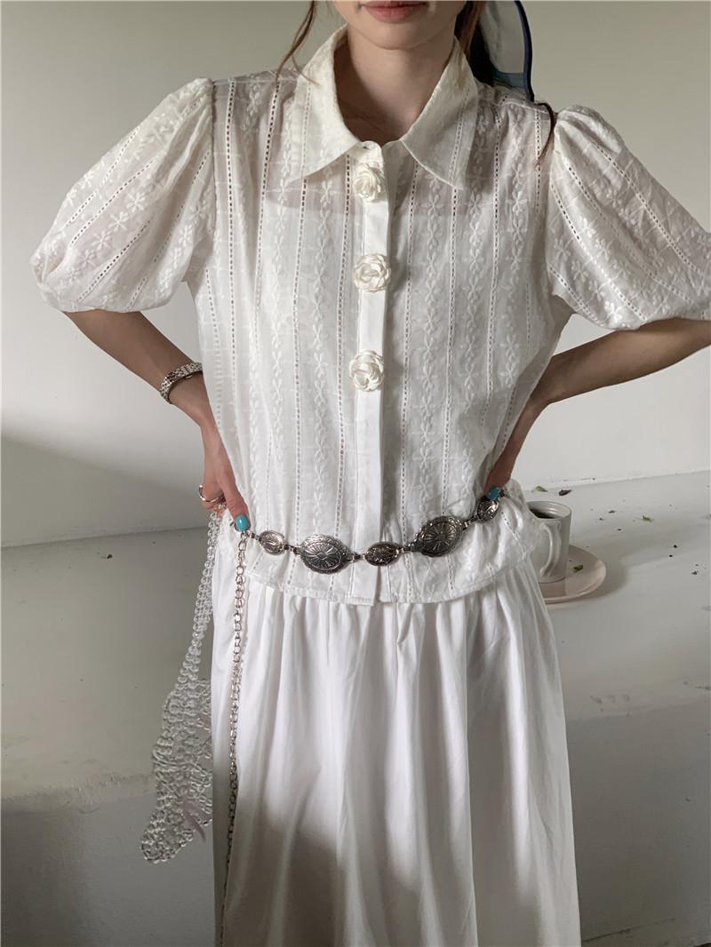 La decoración de botón de flor blanca está quemada con láser. El borde puede volverse amarillo. Por favor, tenga cuidado si le molesta.