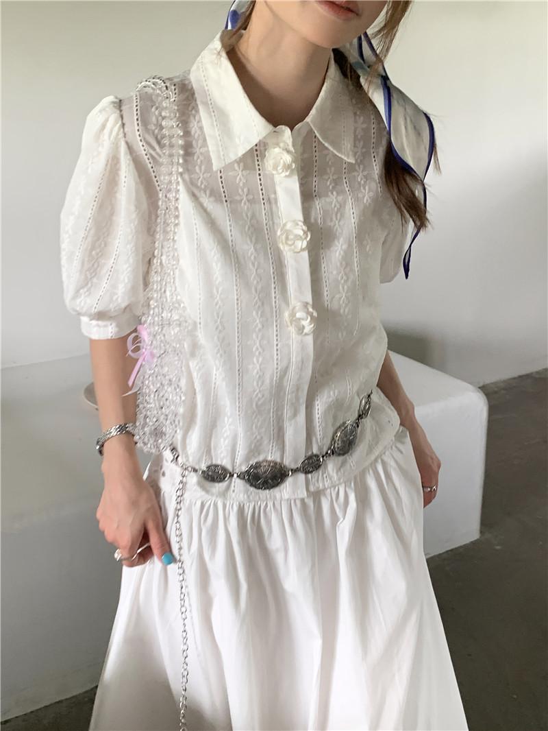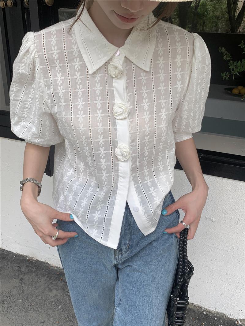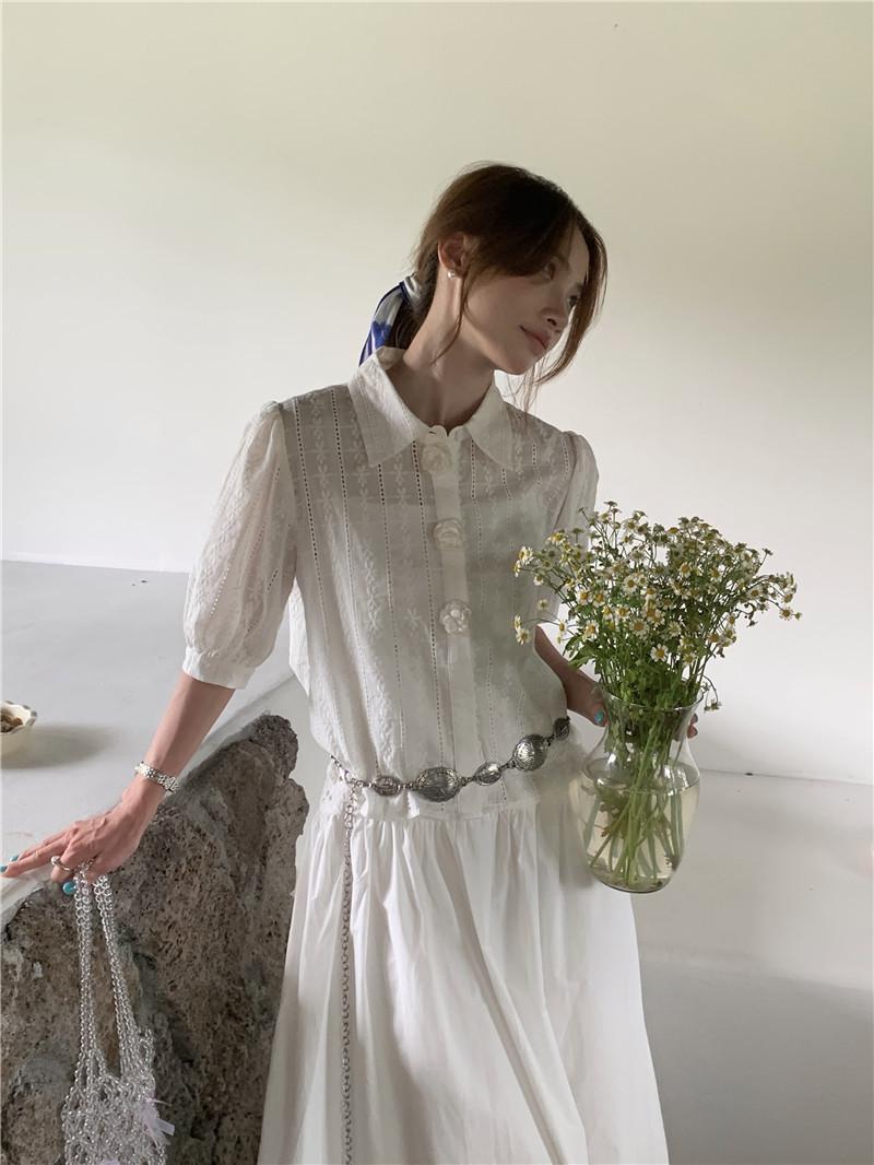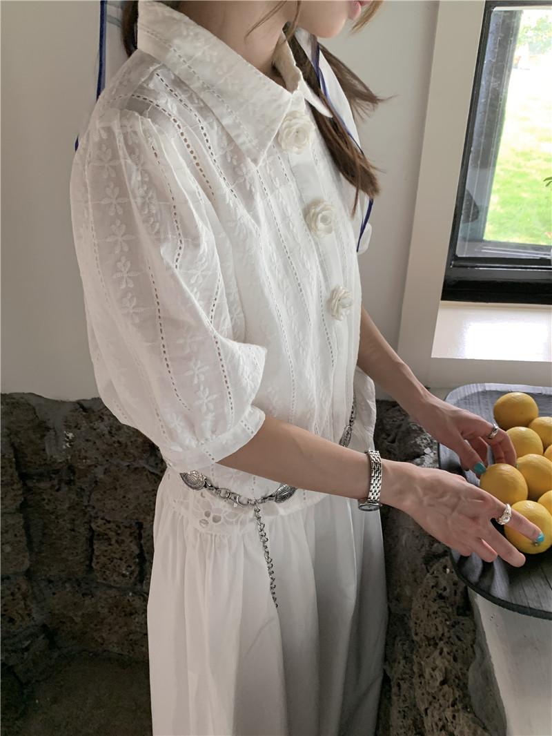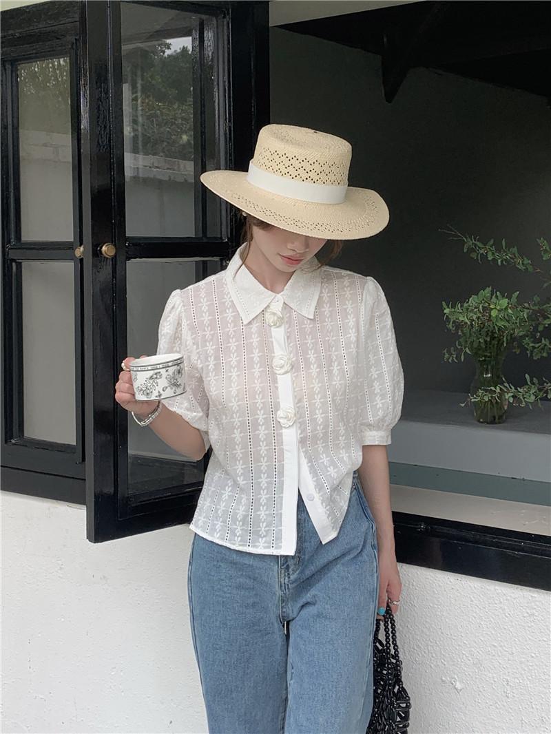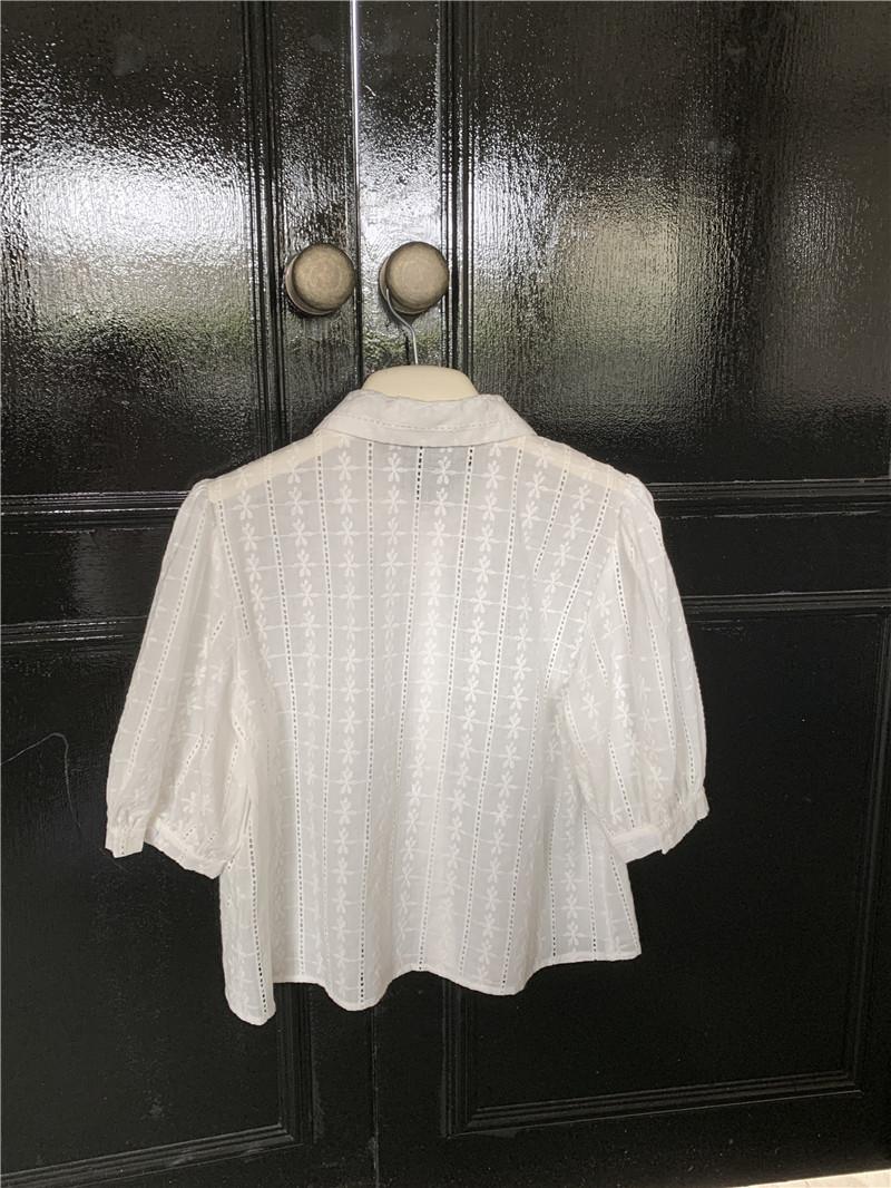 La decoración de botón de flor blanca está quemada con láser. El borde puede volverse amarillo. Por favor, tenga cuidado si le molesta.