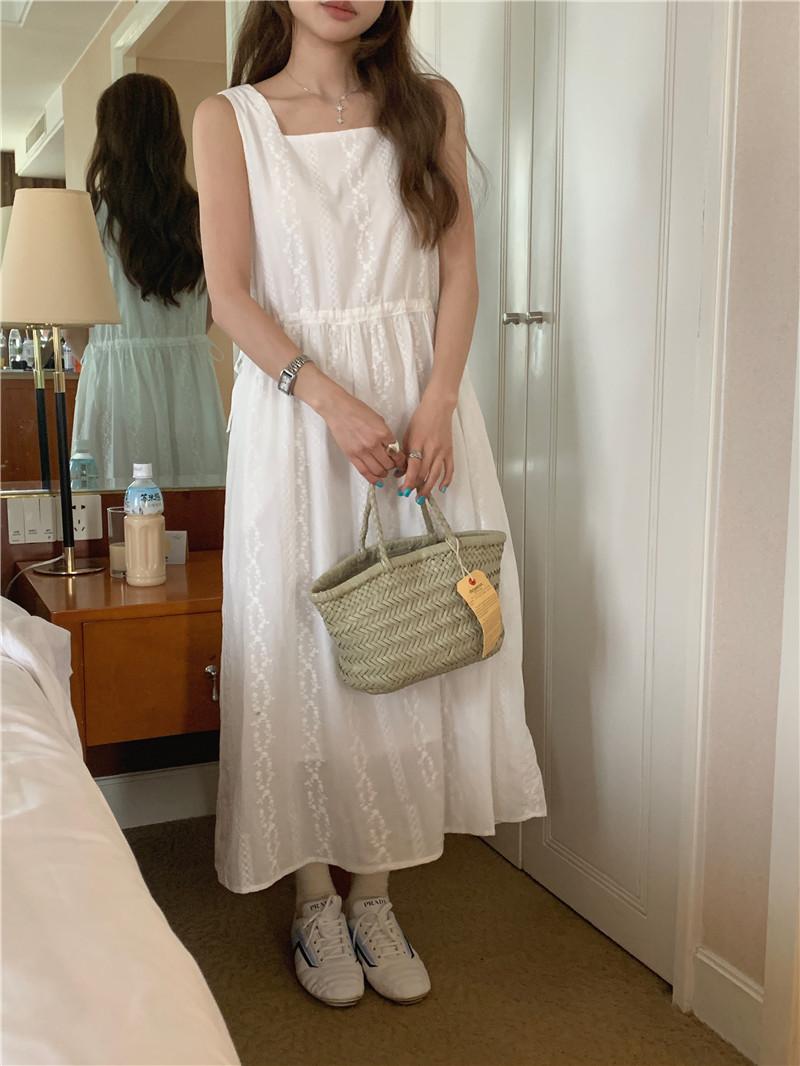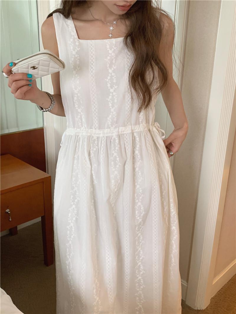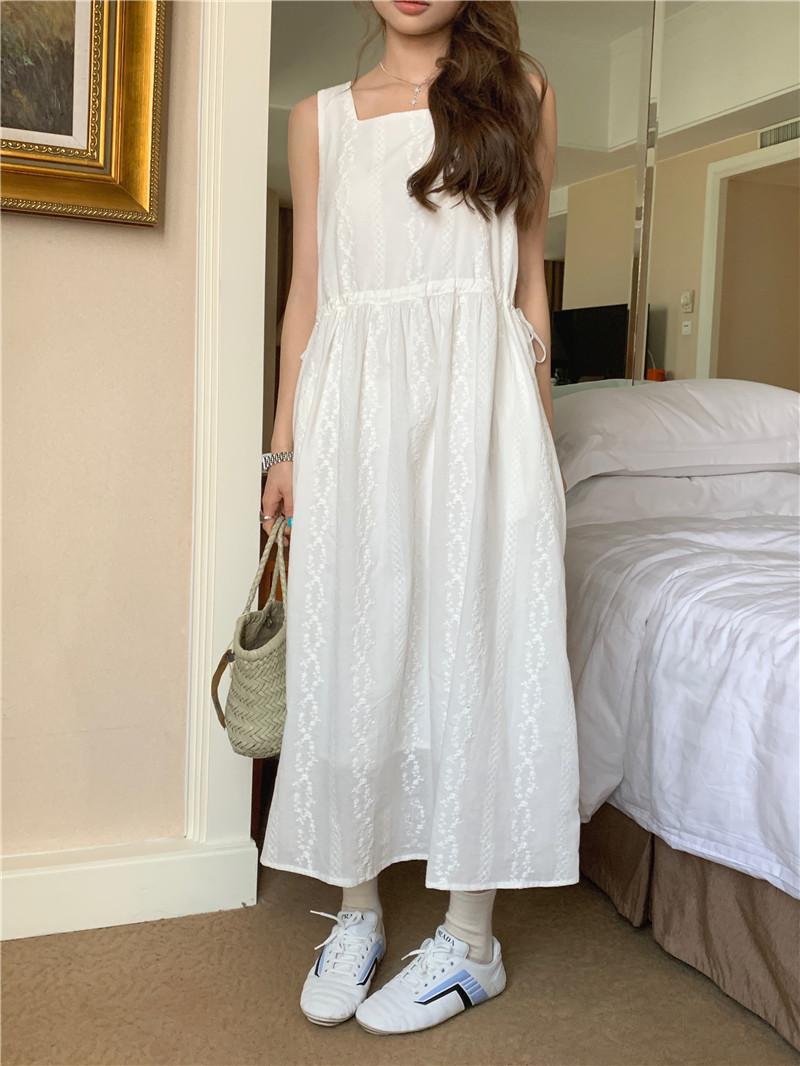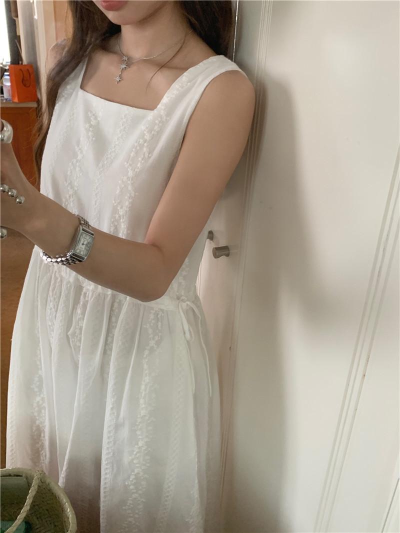 Vestido blanco sin mangas de verano 2024 estilo coreano estilo fresco cuello cuadrado bordado entallado con cordones