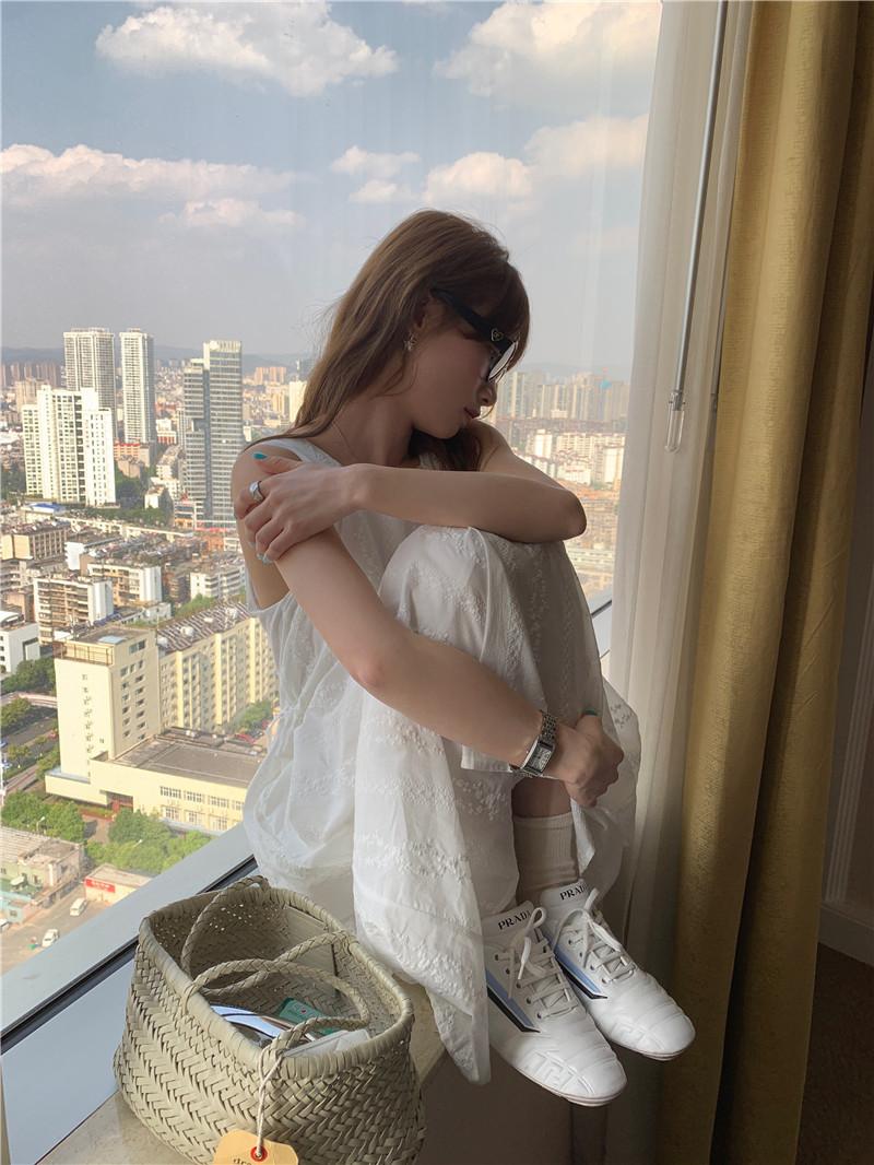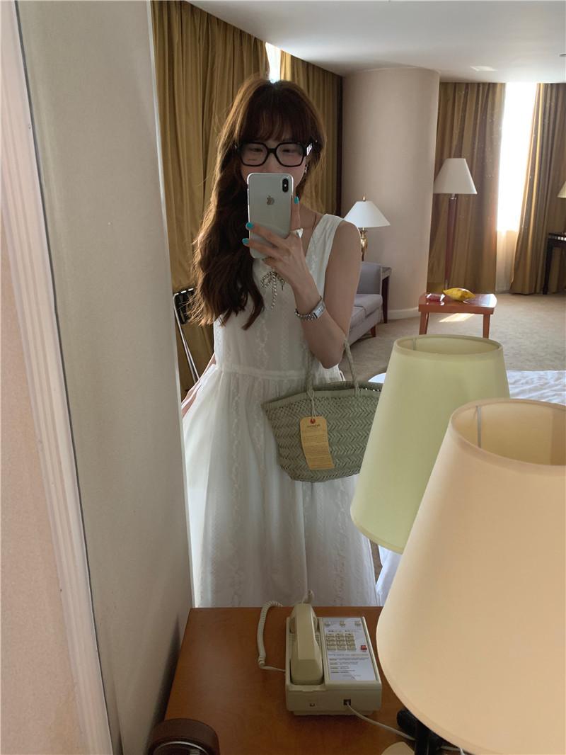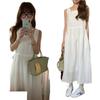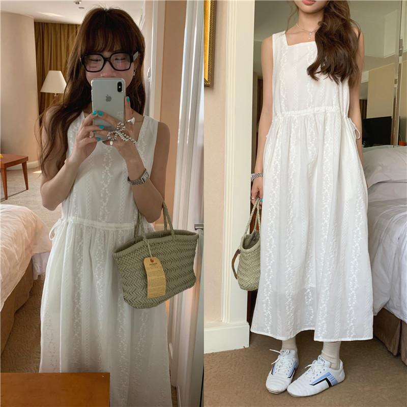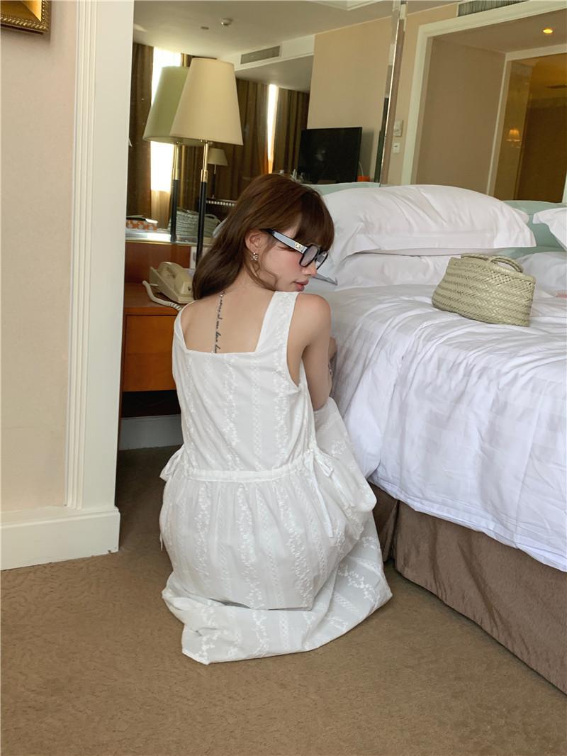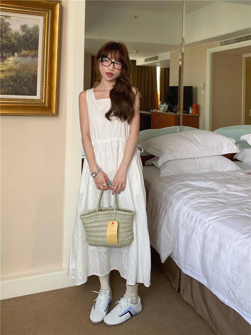 Vestido blanco sin mangas de verano 2024 estilo coreano estilo fresco cuello cuadrado bordado entallado con cordones