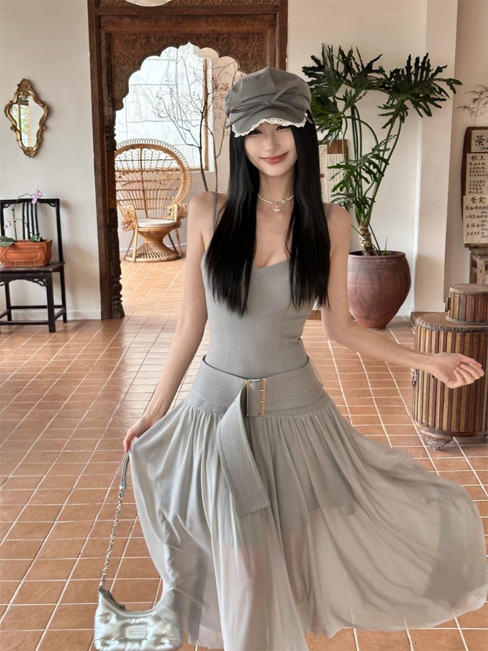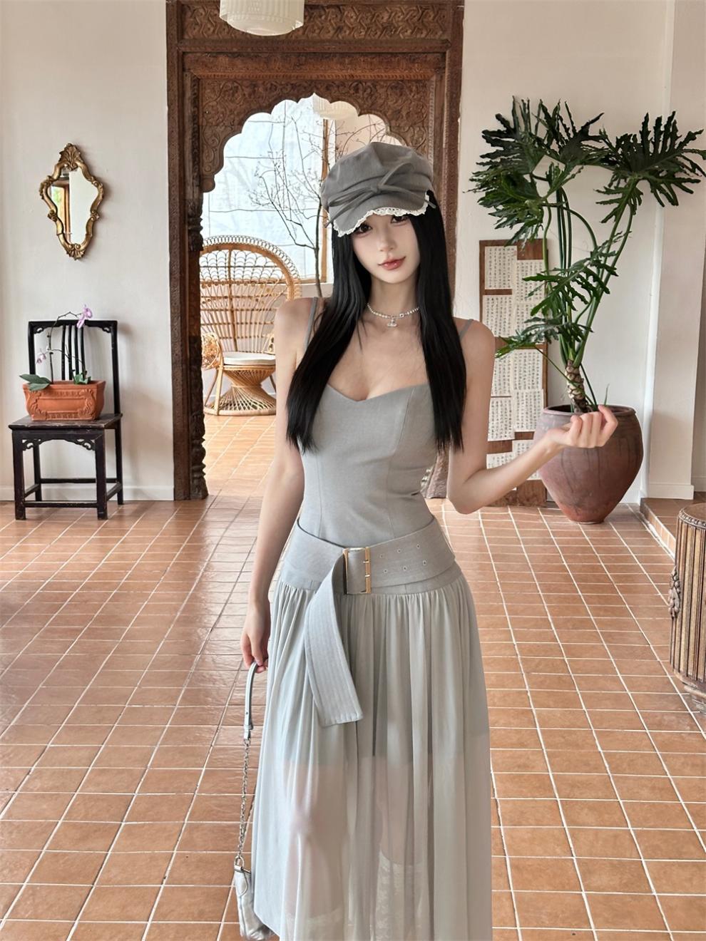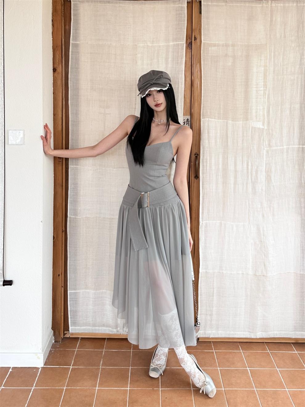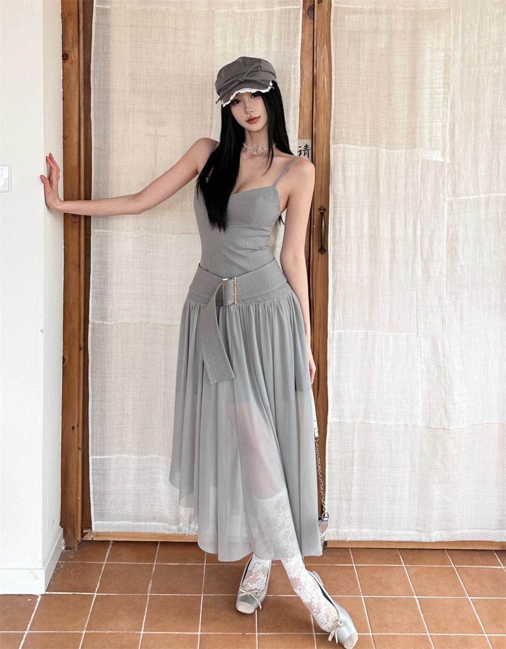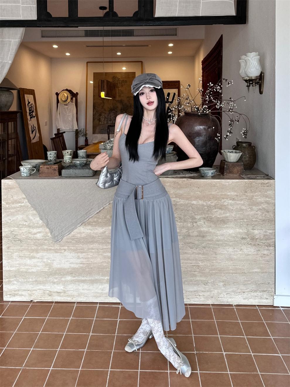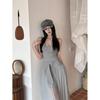 Foto real en stock Vestido sling de lana mezclada con costuras de cinturón Vestido de malla para mujer