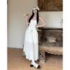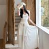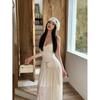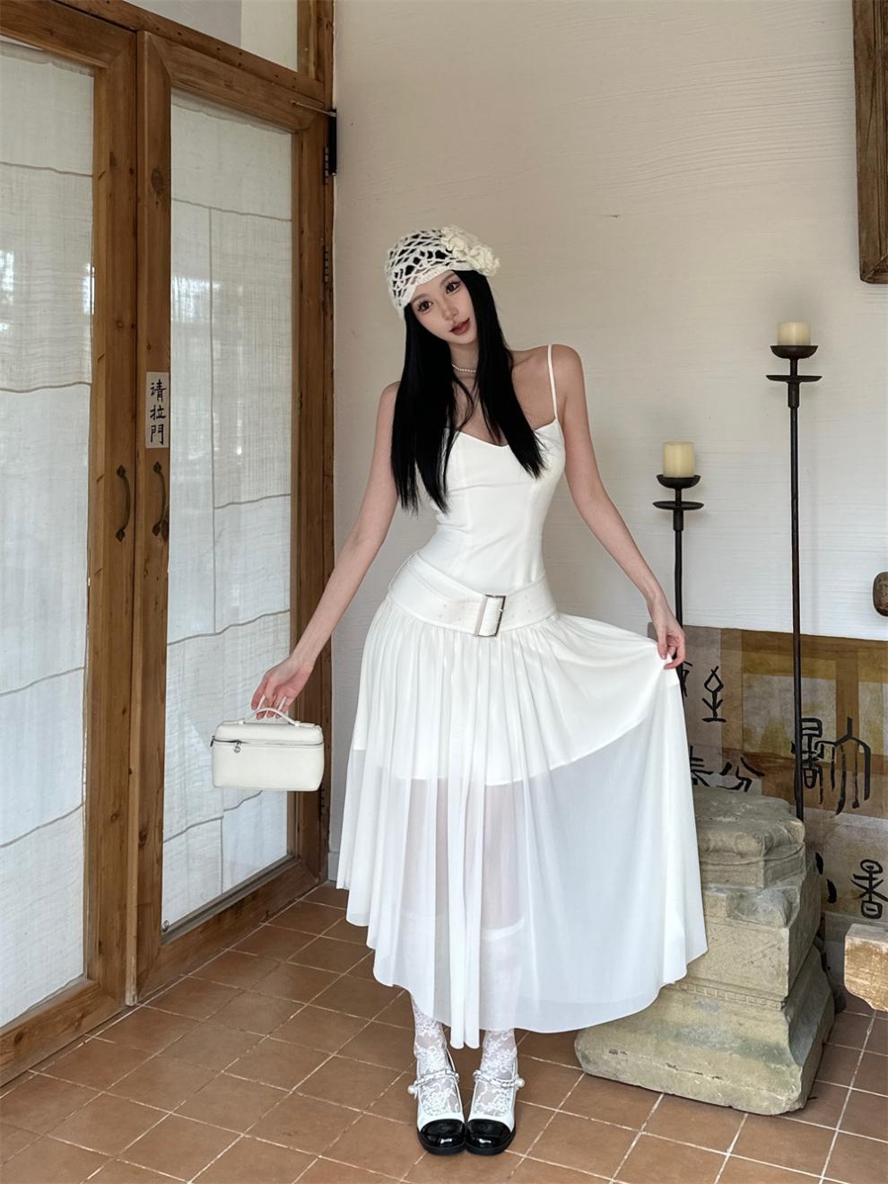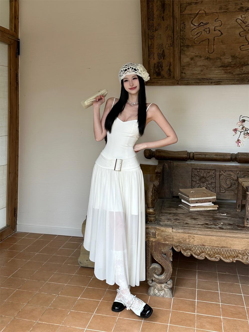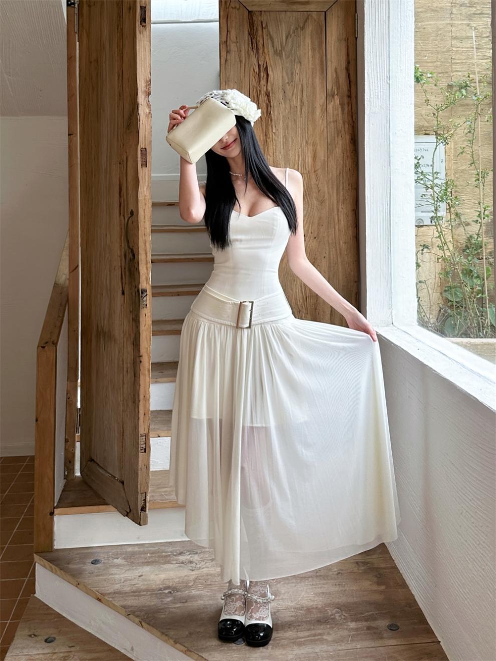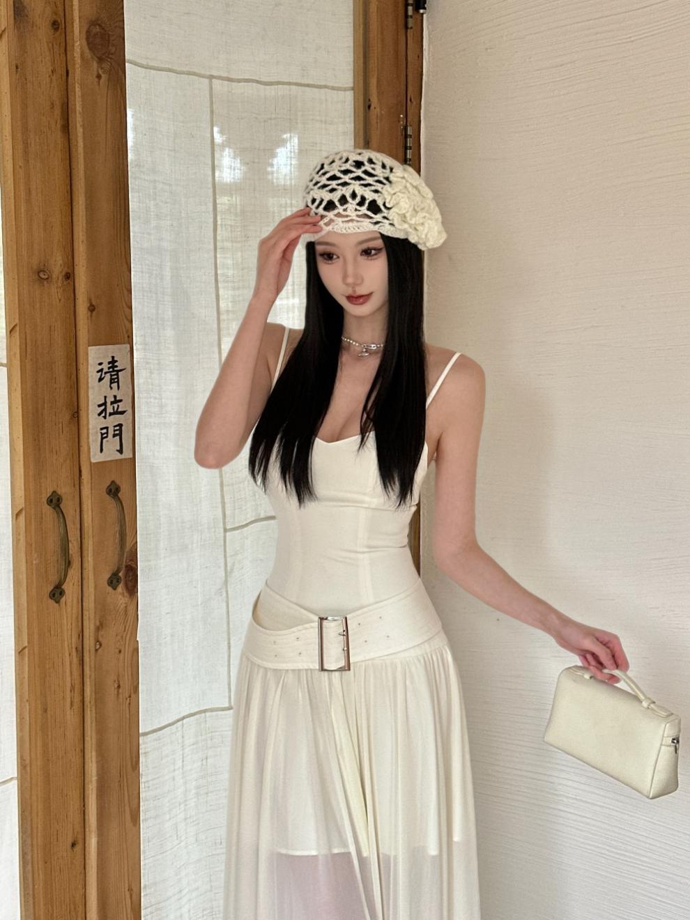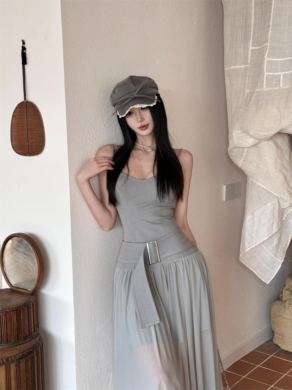 Foto real en stock Vestido sling de lana mezclada con costuras de cinturón Vestido de malla para mujer