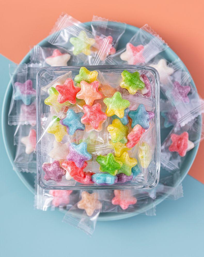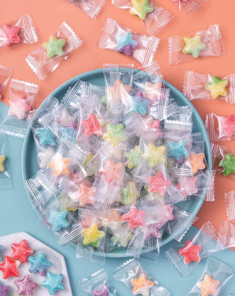 Caramelo de alta calidad con forma de estrella de cinco puntas y corazón, para celebridad de internet, a granel al por mayor, sabor a fruta, caramelo duro, dulces para boda, pequeños snacks para niños