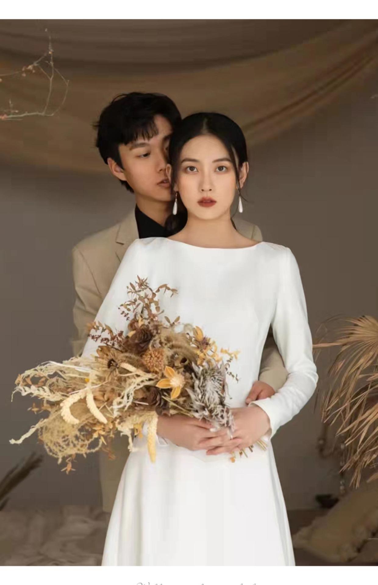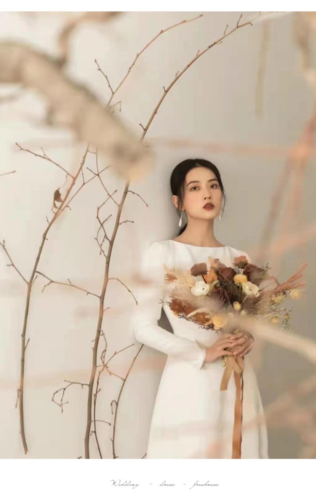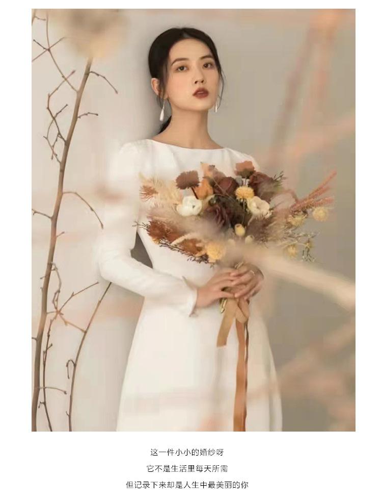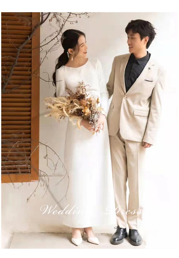 Vestido de Novia Ligero Estilo Francés Estilo Mori Manga Larga Elegante Adelgazante Blanco Satén Bienvenida Vestido Largo de Noche