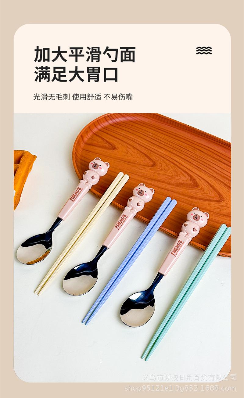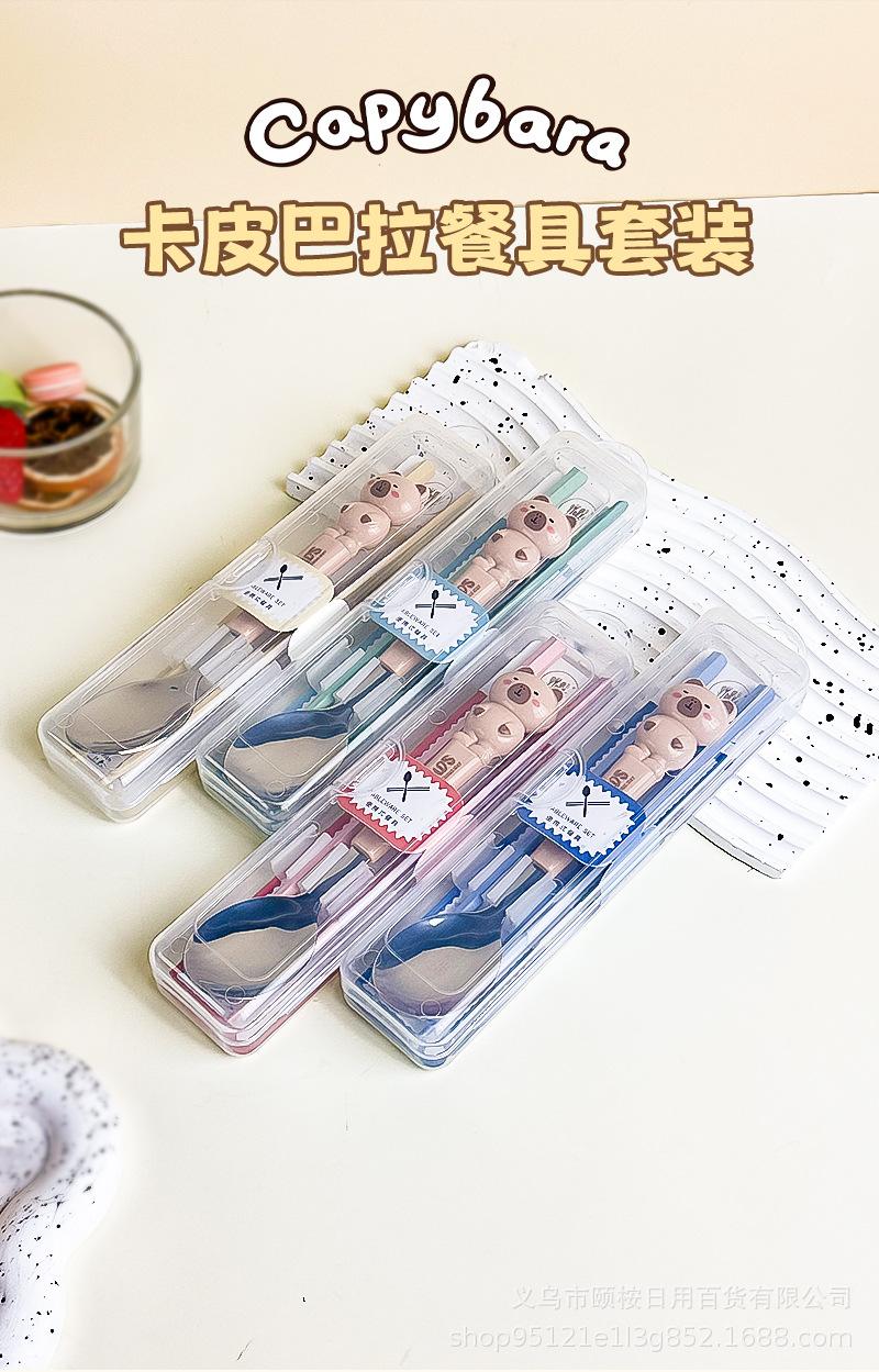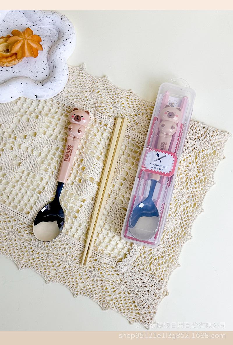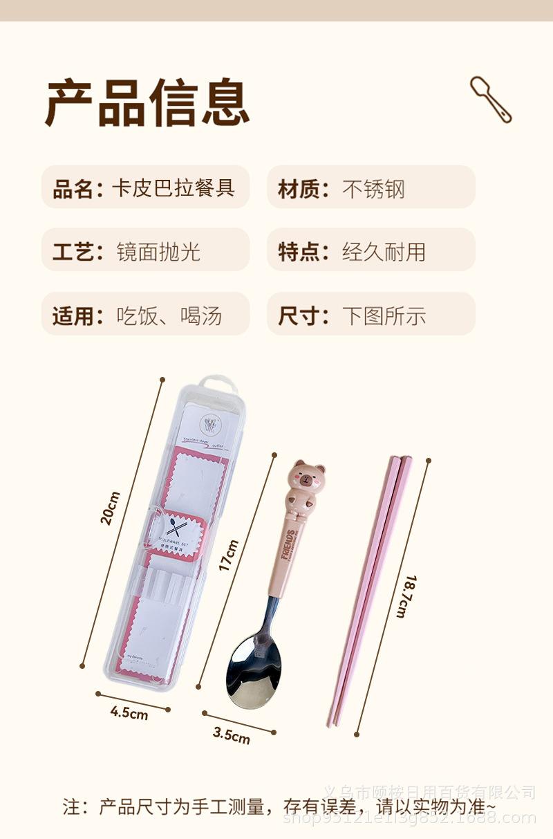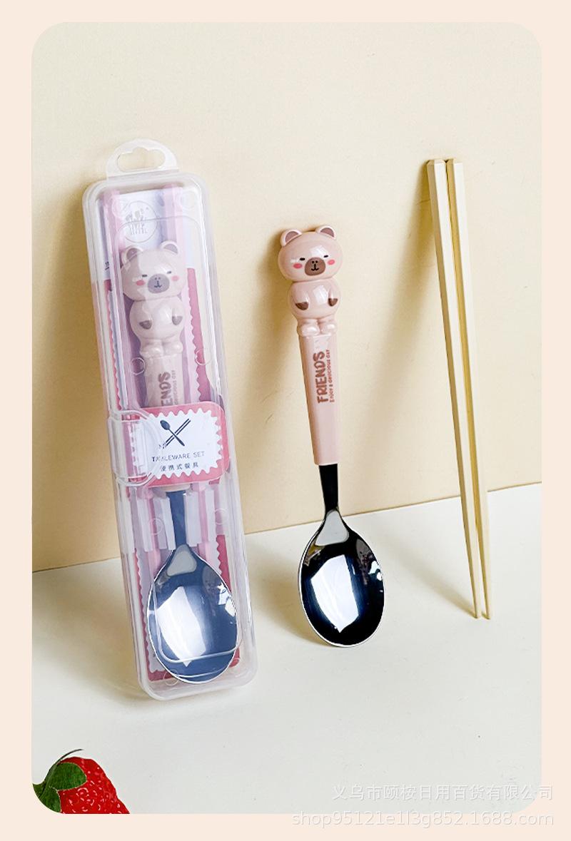 Set de Cubiertos de Acero Inoxidable de Capibara Dibujo Animado Lindo Niños Portátil Cuchara Palillos Set Set de Dos Piezas Set de Cuchara y Palillos