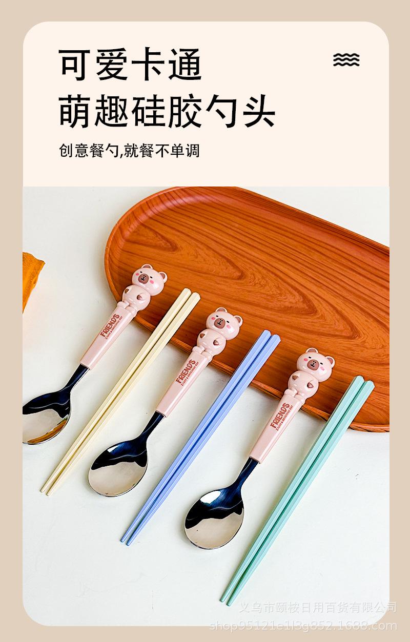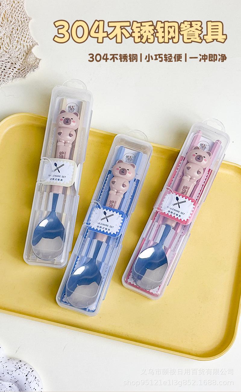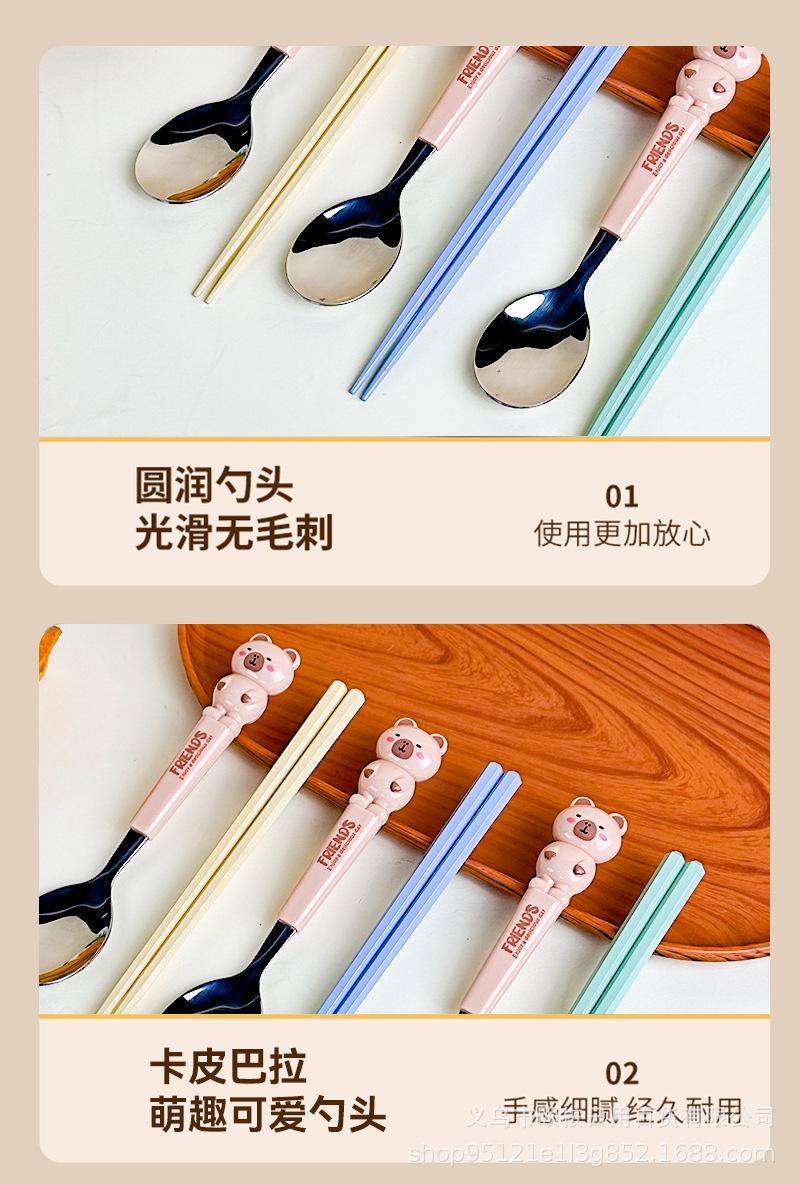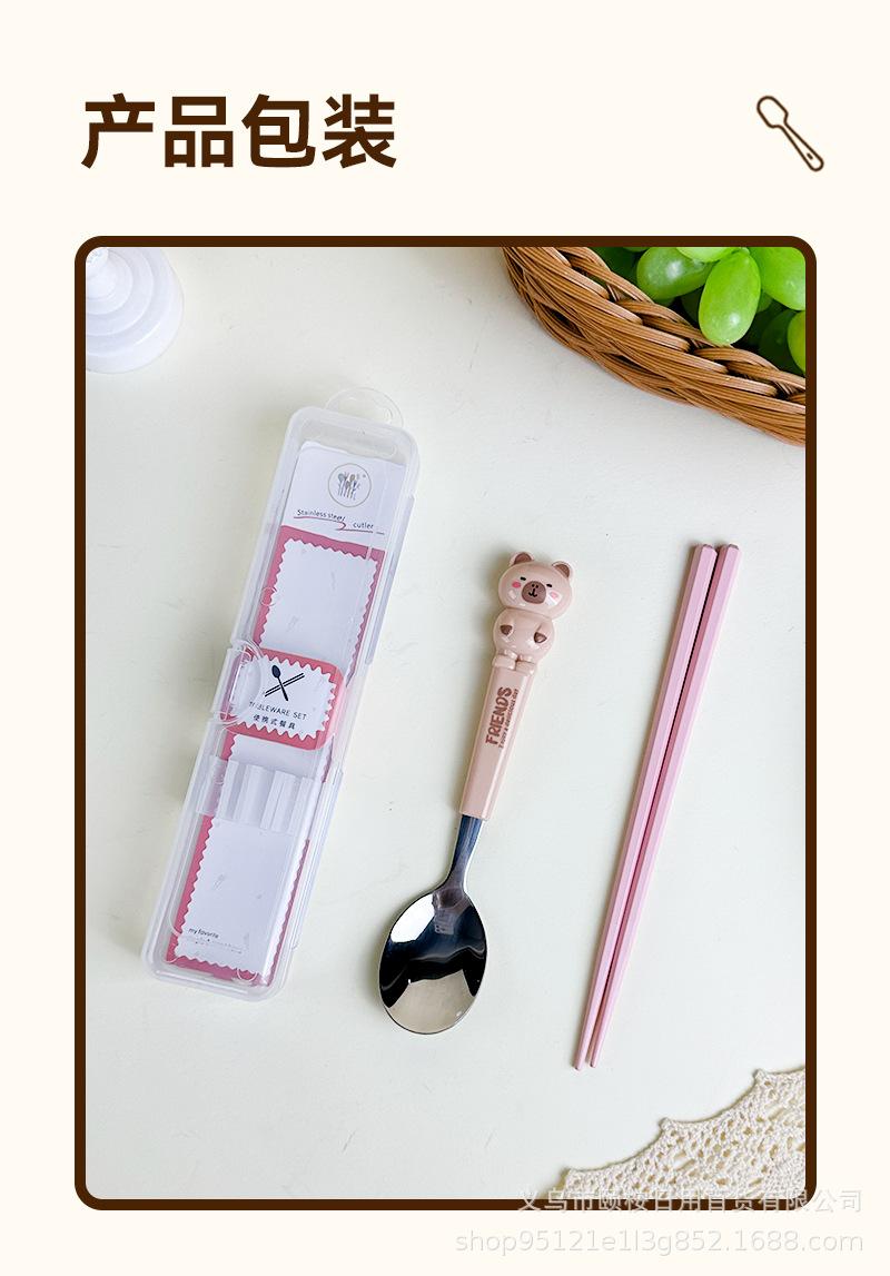 Set de Cubiertos de Acero Inoxidable de Capibara Dibujo Animado Lindo Niños Portátil Cuchara Palillos Set Set de Dos Piezas Set de Cuchara y Palillos