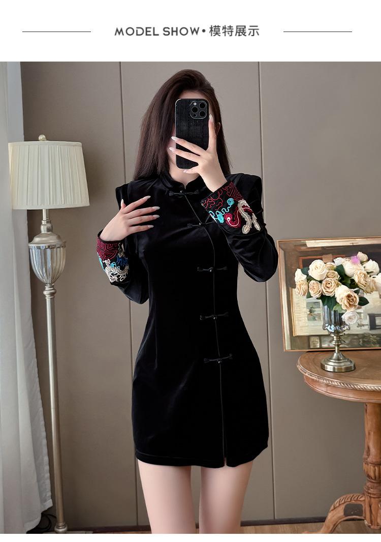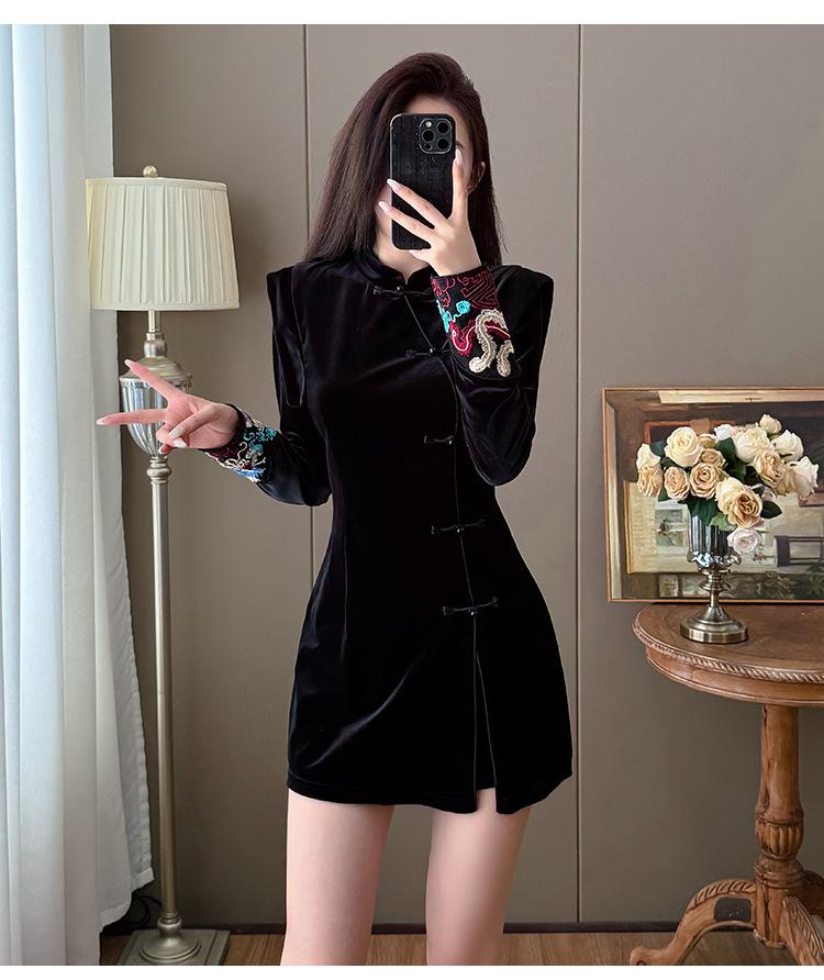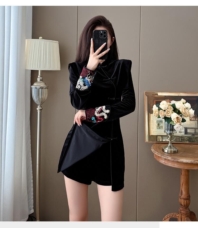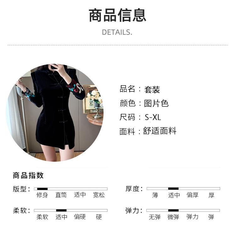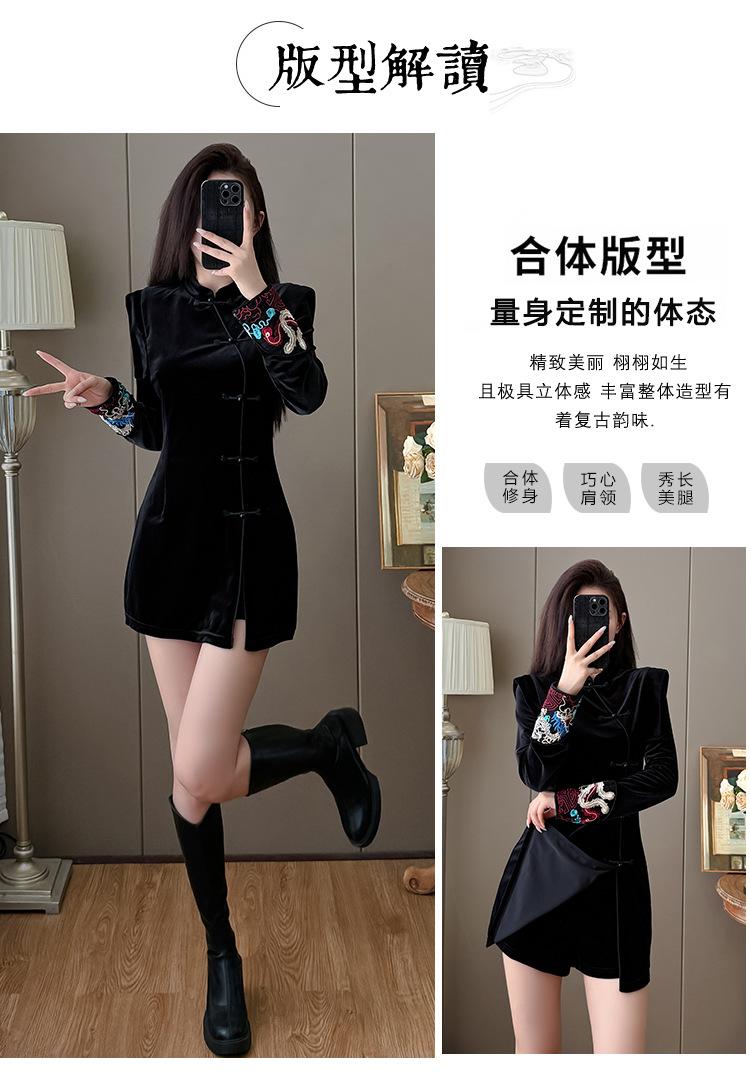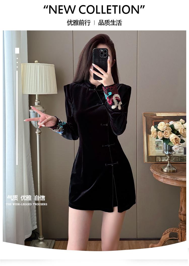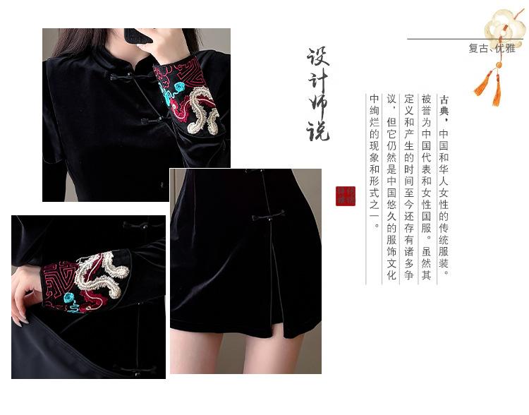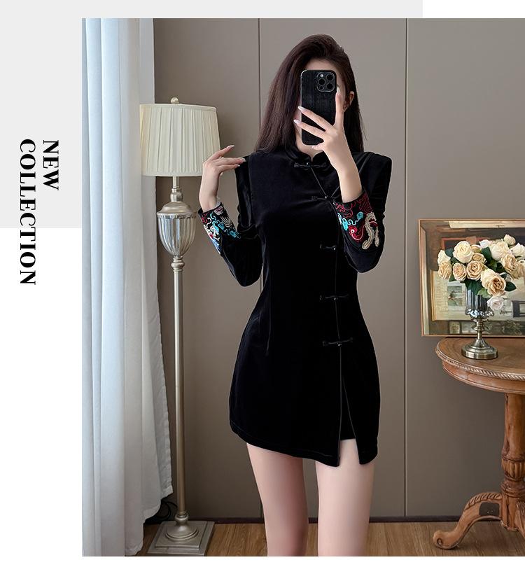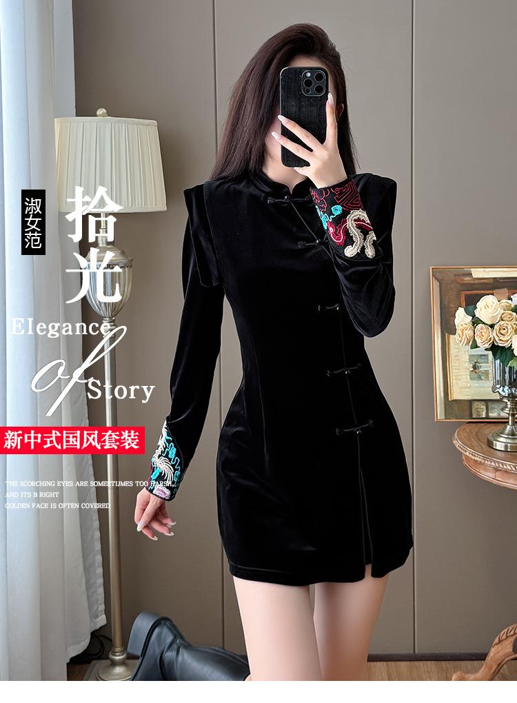 Foto real nuevo vestido de terciopelo bordado estilo chino 2025 otoño vestido estilo cheongsam retro + leggings conjunto de dos piezas