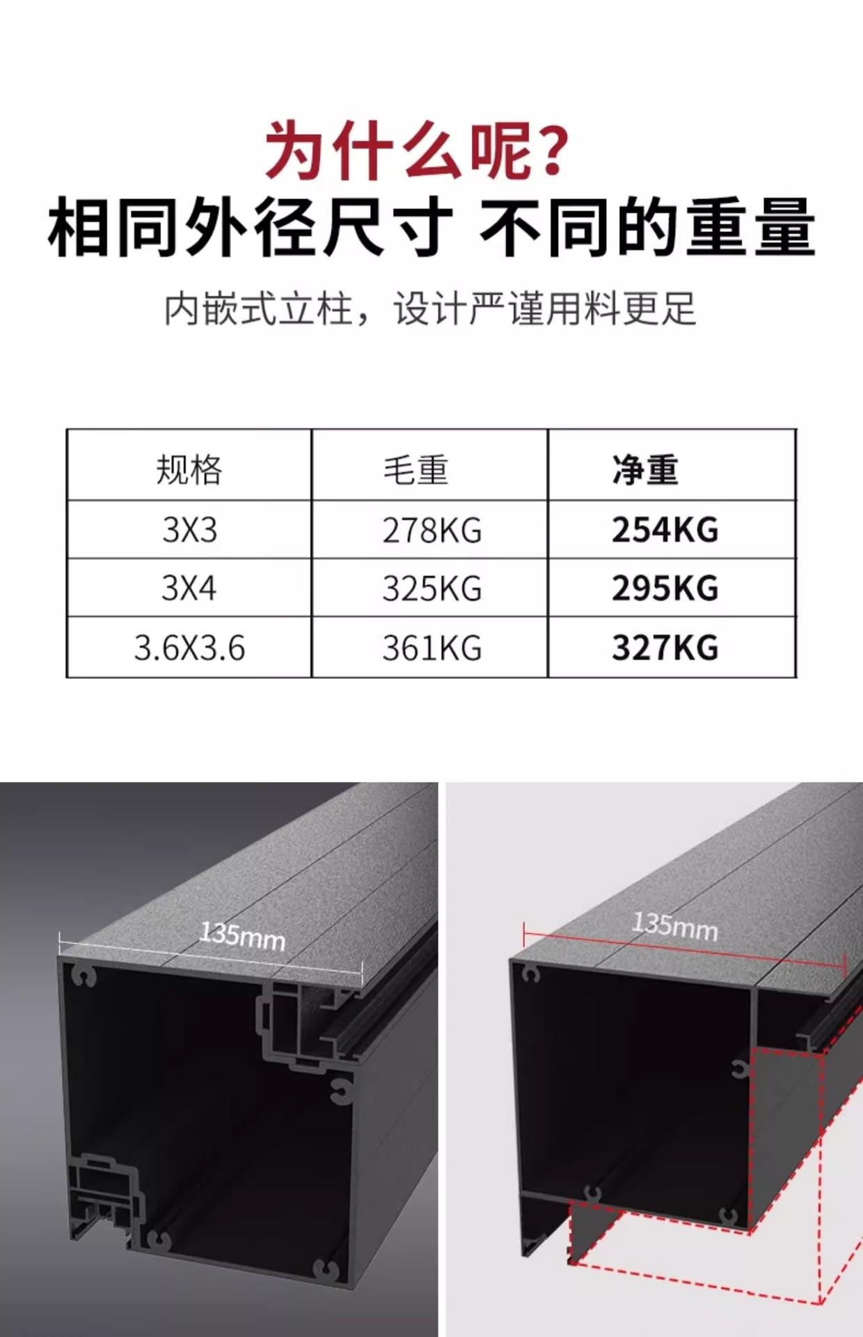 3.6*3.5* 2.3m (column wall thickness 1.5mm, no lights and no roller blinds)