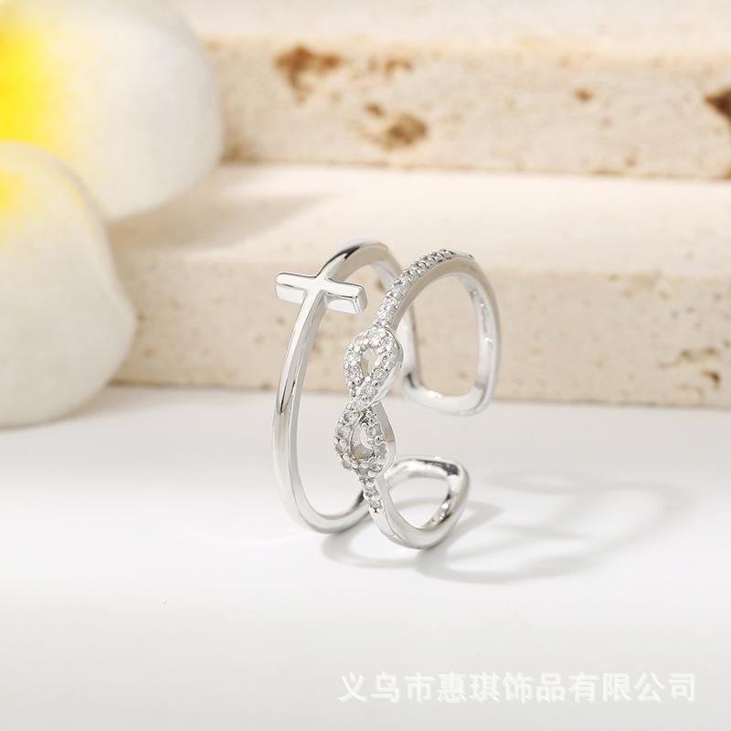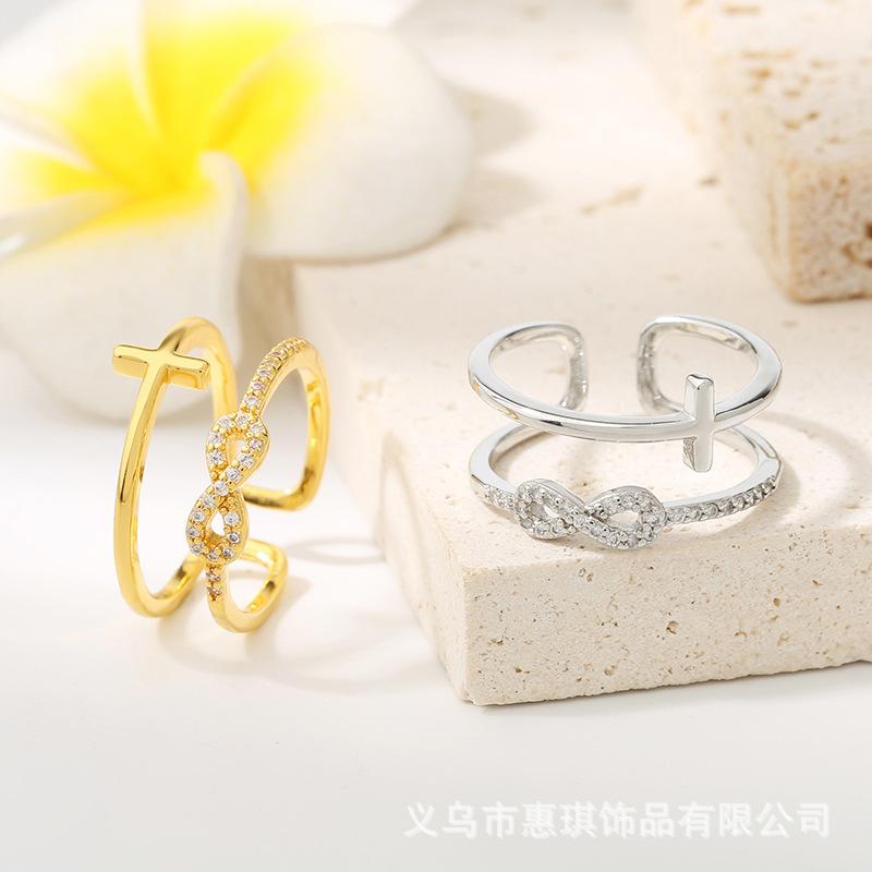 Anillo Abierto Simple Versátil de Doble Capa con Forma de Ocho de Amor Estilo Coreano Cruz Creativo para Mujer con Diamantes Incrustados Color Conservado por Electrodeposición