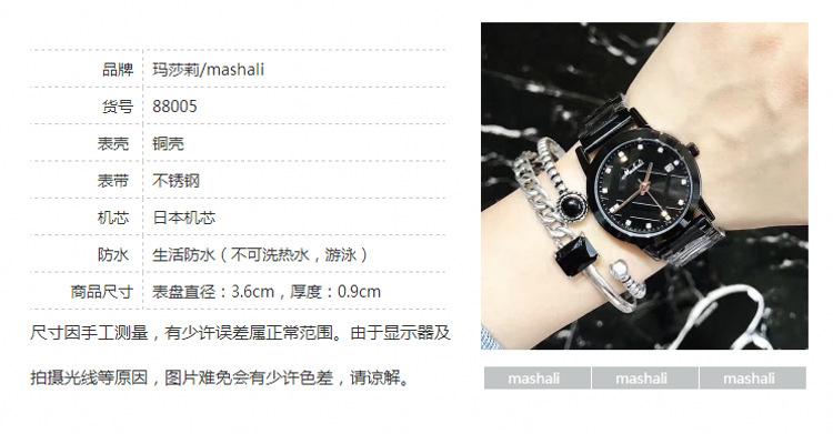 Marca: Mashali 玛莎莉 Introducción: Hot Marsali, esfera única de rayas horizontales, quince diamantes brillan, esfera con visualización de fecha, brazalete de acero inoxidable, chapado IPG al vacío, movimiento japonés importado, 15 diamantes genuinos AAA brillan en la esfera, añadiendo un ambiente noble al reloj. Modelo: 88005 Material: Caja de cobre, correa de acero inoxidable Diámetro: 3.6CM, Grosor: 0.9CM{{{{{{{{{{
