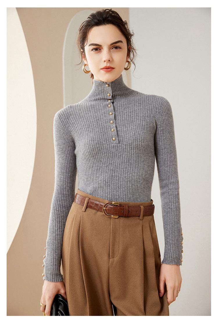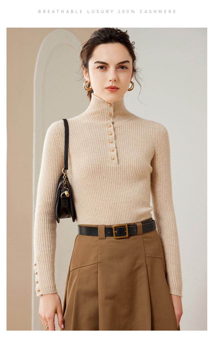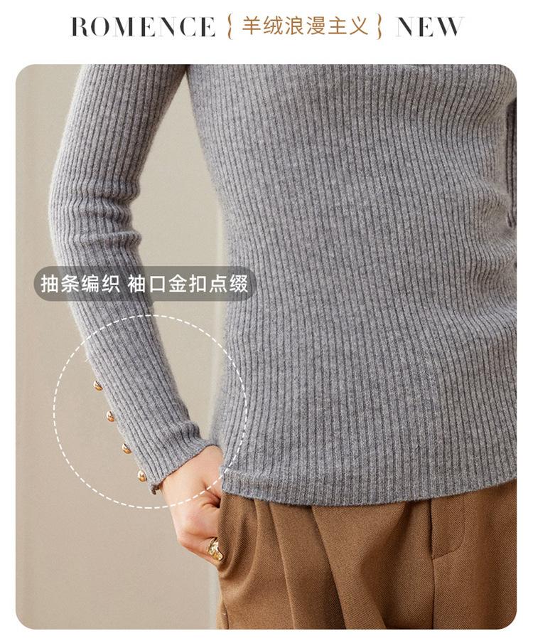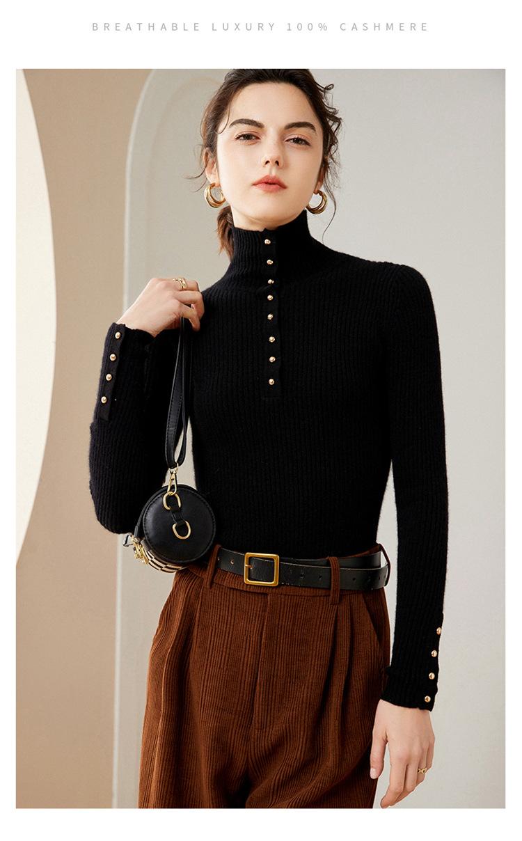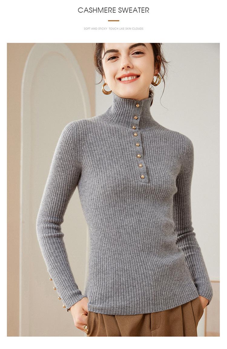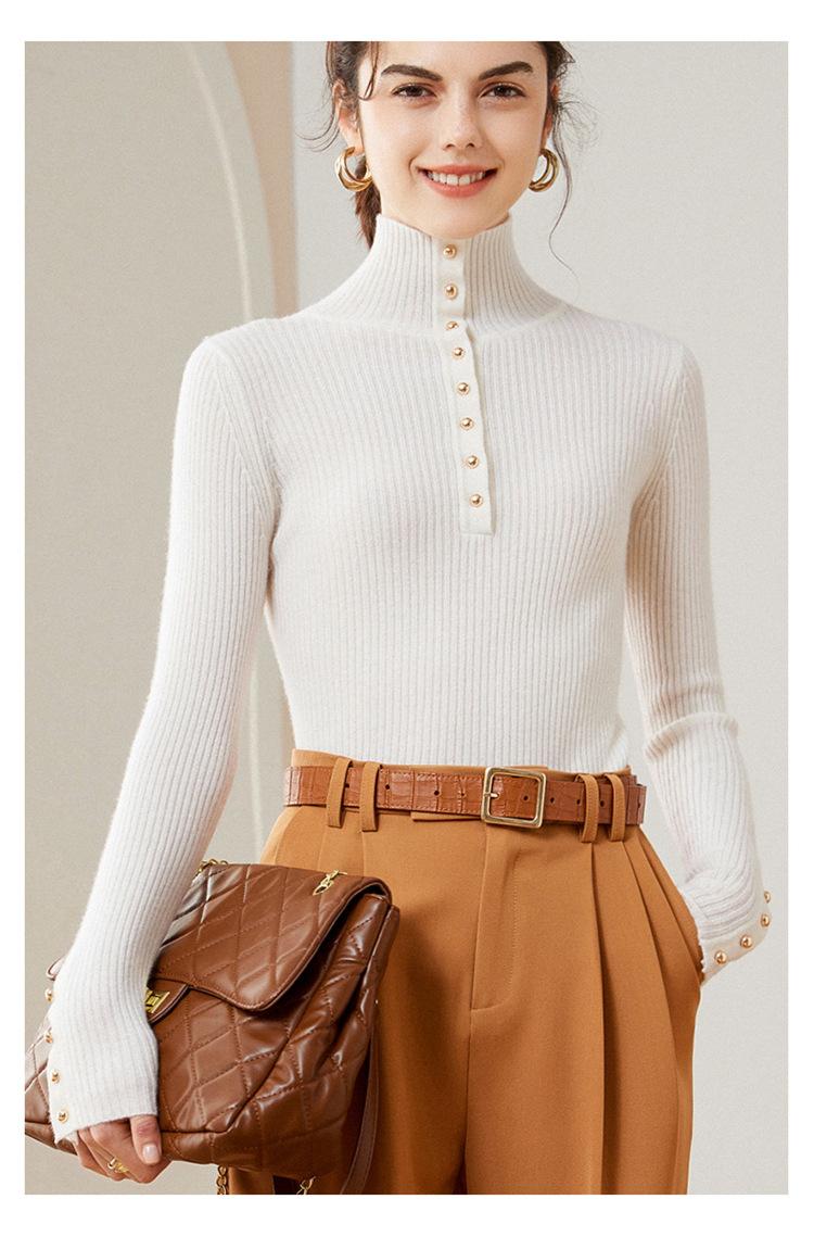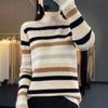 Suéter de cuello alto medio a rayas para mujer a la moda, con hebilla dorada, de punto fino, entallado, adelgazante, para ir al trabajo, todo de cachemira, nuevo básico de punto