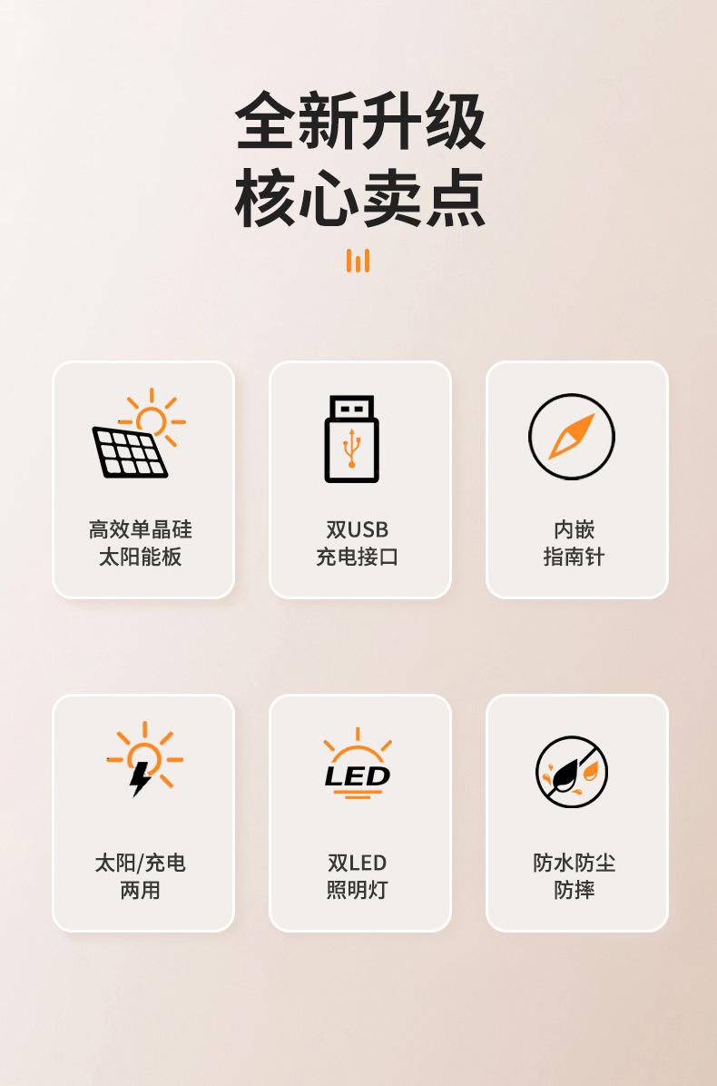 [Características del producto]: Brújula, súper impermeable, energía solar, luz LED potente, material ignífugo