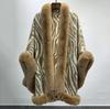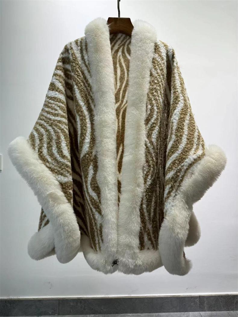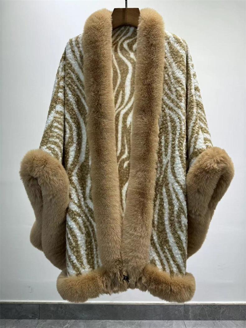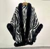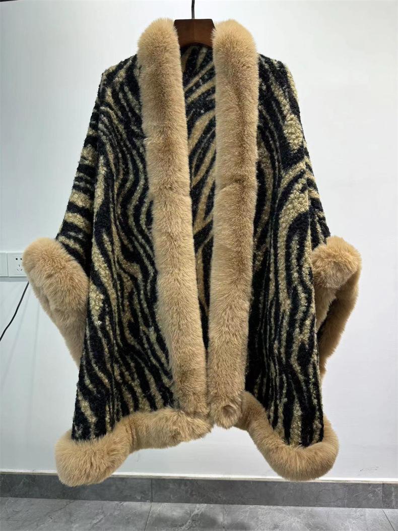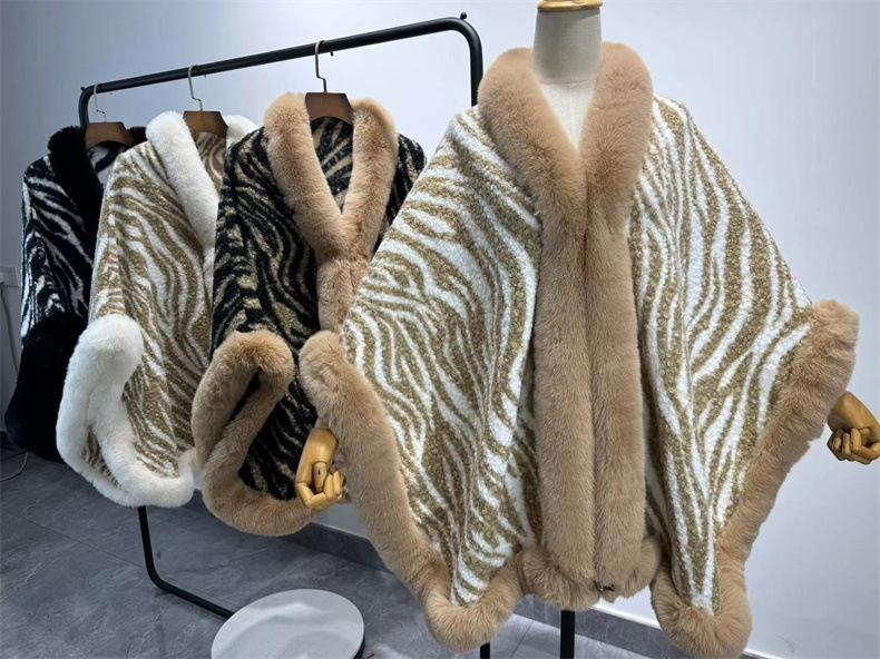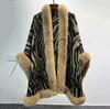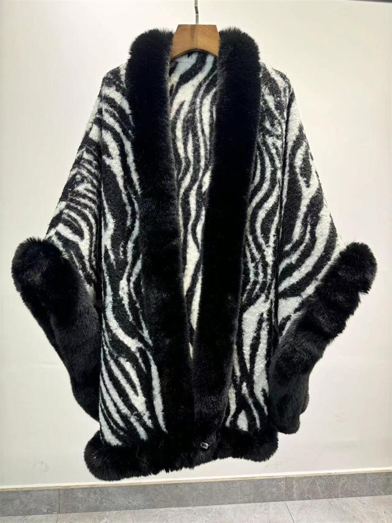 Venta al por mayor transfronteriza Otoño e Invierno Engrosado Patrón de Cebra Chal Abrigo Europeo y Americano Talla Grande Manga Murciélago Estampado Cuello de Piel Capa