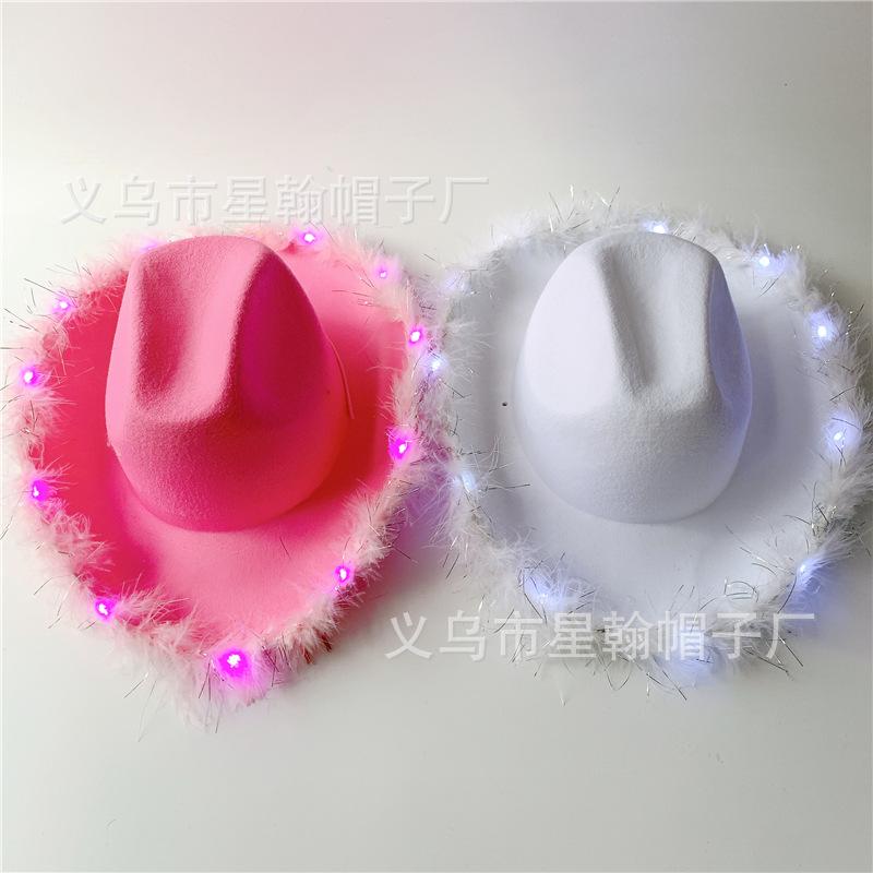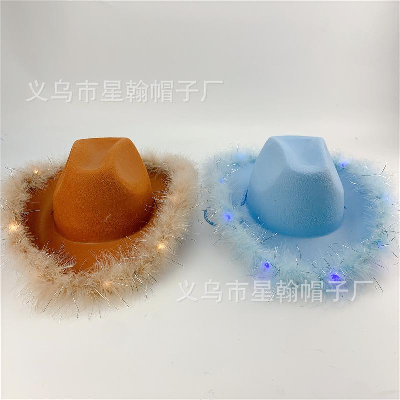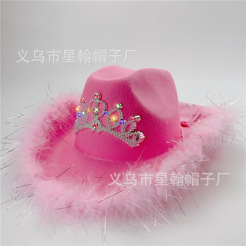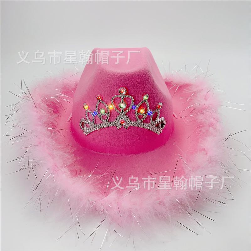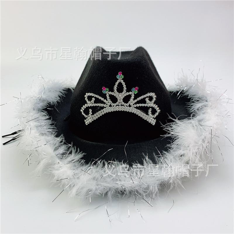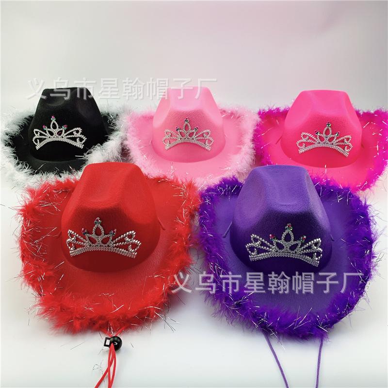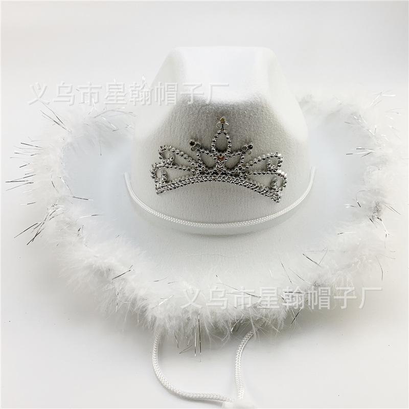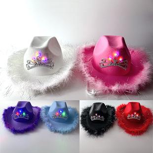 Corona Blanca con Luz LED de Colores Fiesta de Carnaval de Halloween Pluma Conjunto de Diamantes de Colores Sombrero de Vaquero Occidental