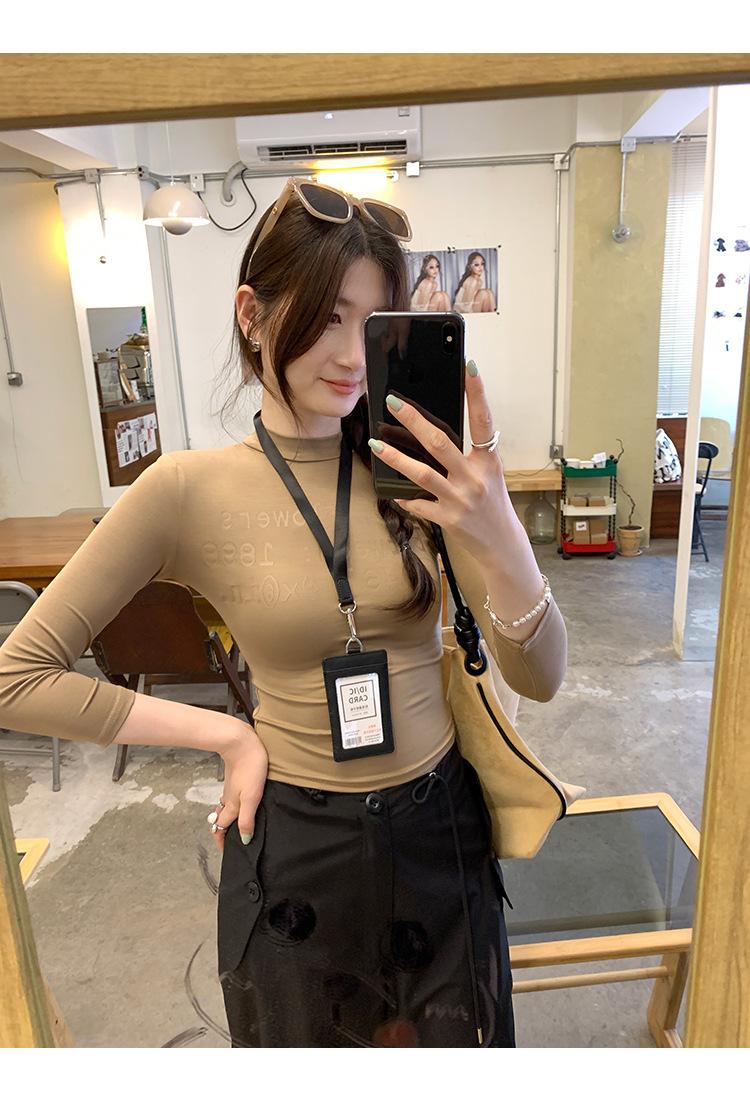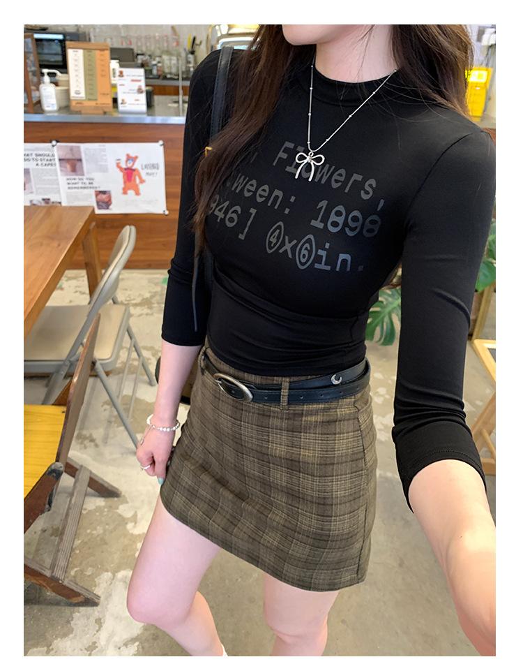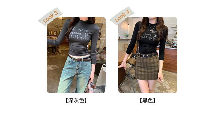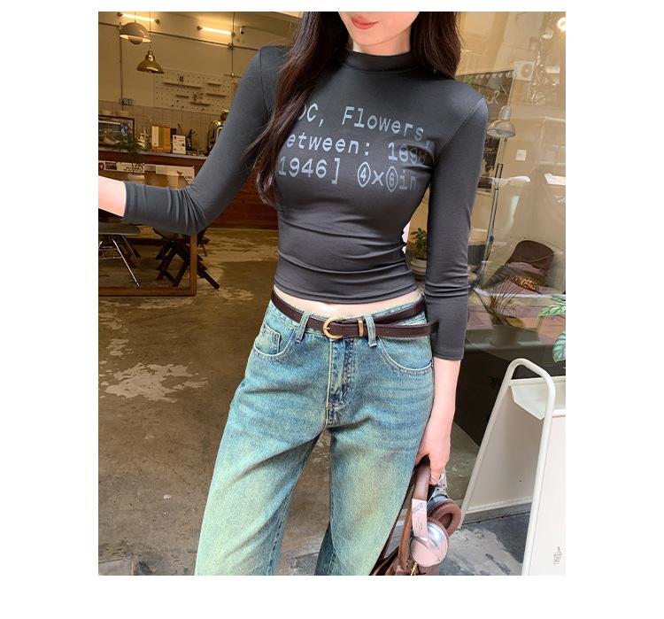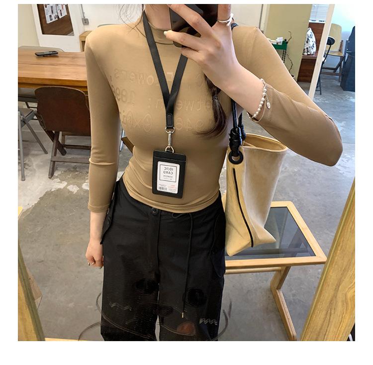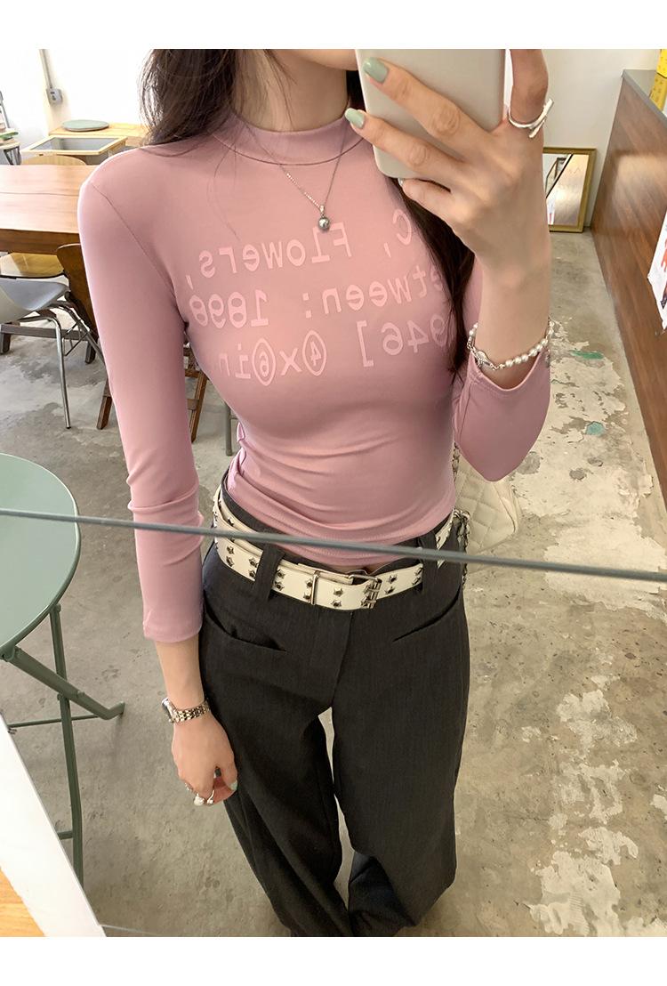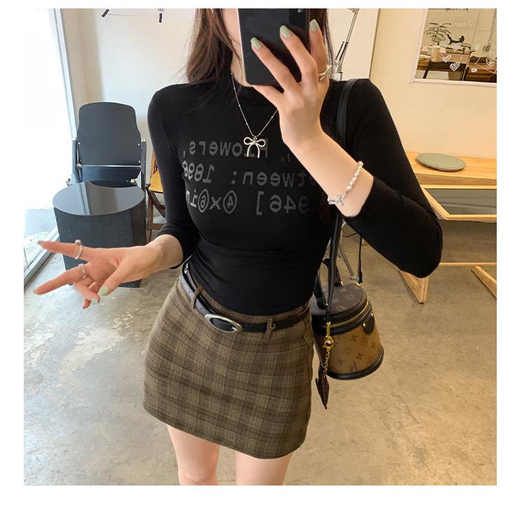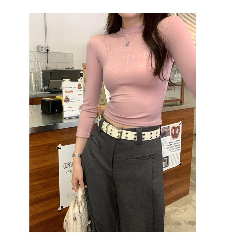 Camiseta de nicho con estampado de letras de cuello semi alto y manga larga para mujer, estilo coreano 2025, nuevo de principios de otoño, prenda interior, top de siete mangas