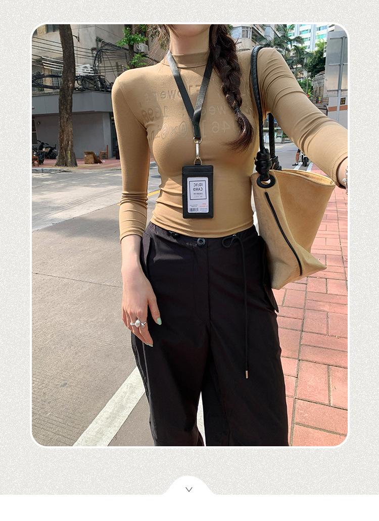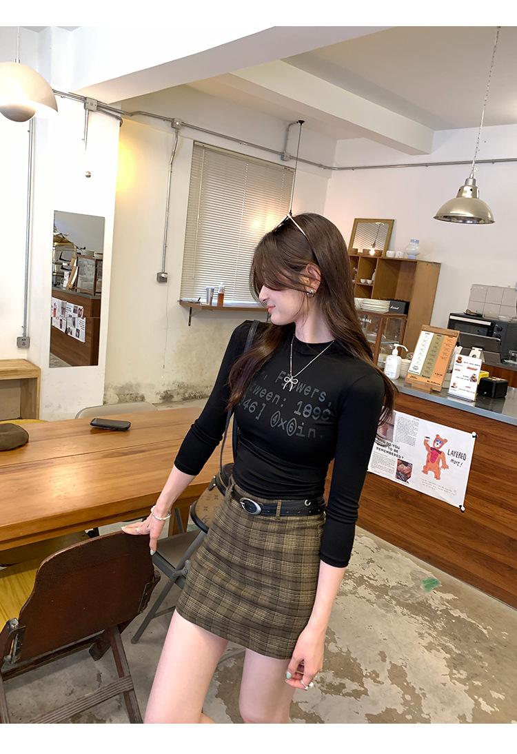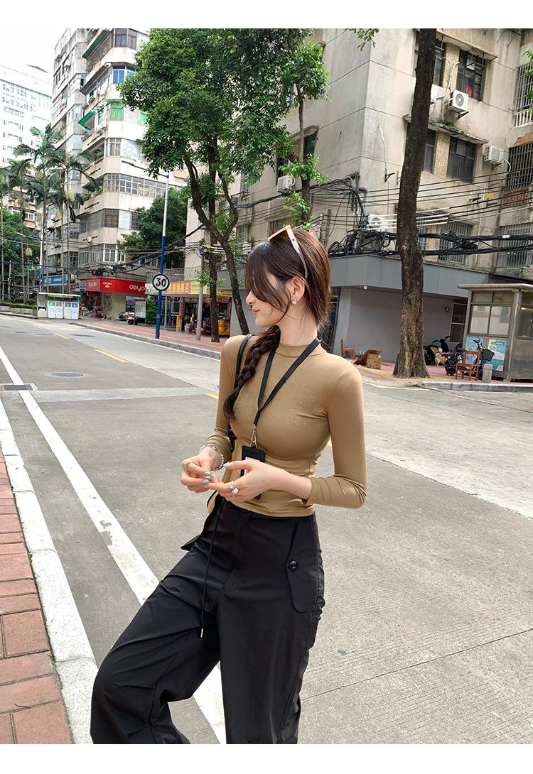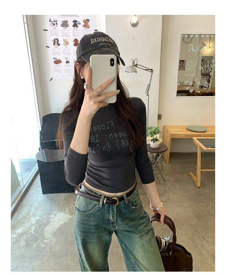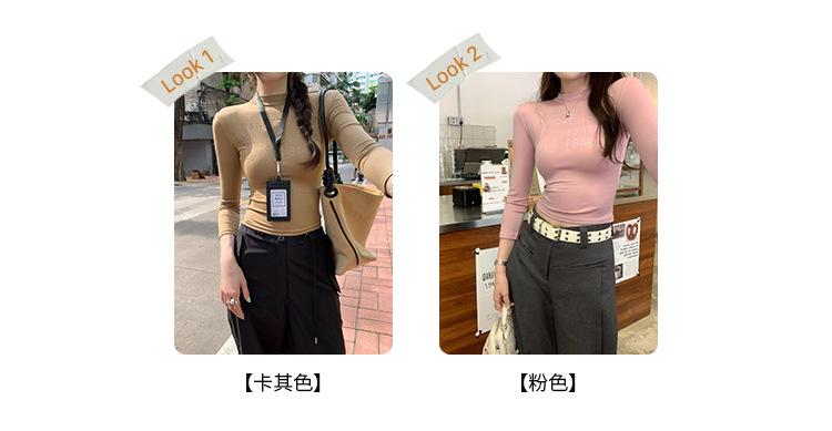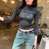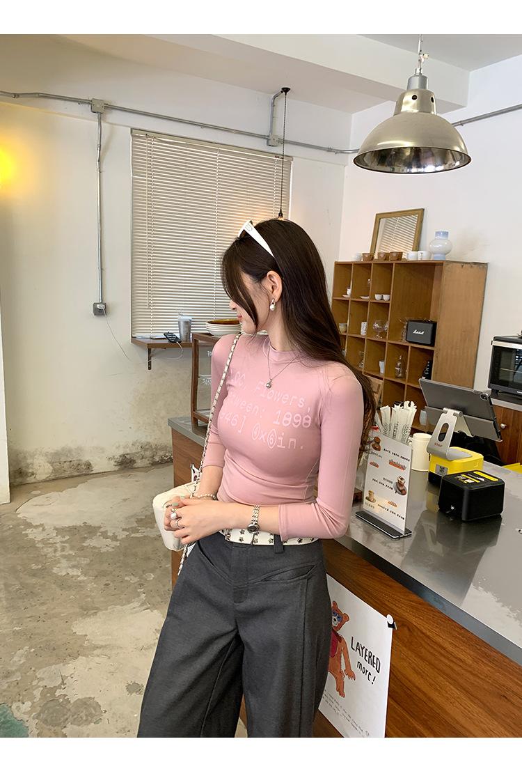 Camiseta de nicho con estampado de letras de cuello semi alto y manga larga para mujer, estilo coreano 2025, nuevo de principios de otoño, prenda interior, top de siete mangas