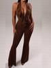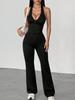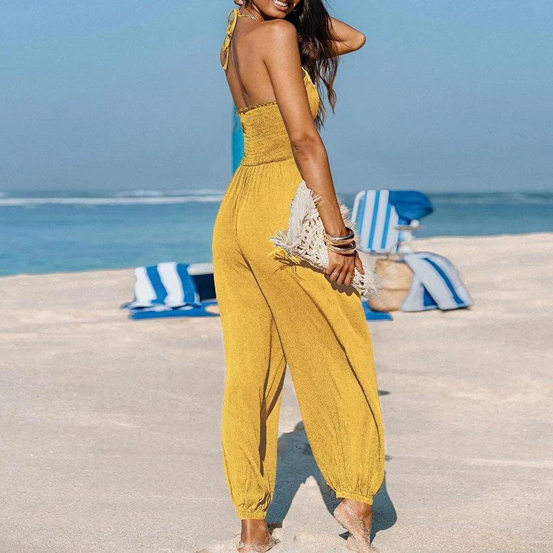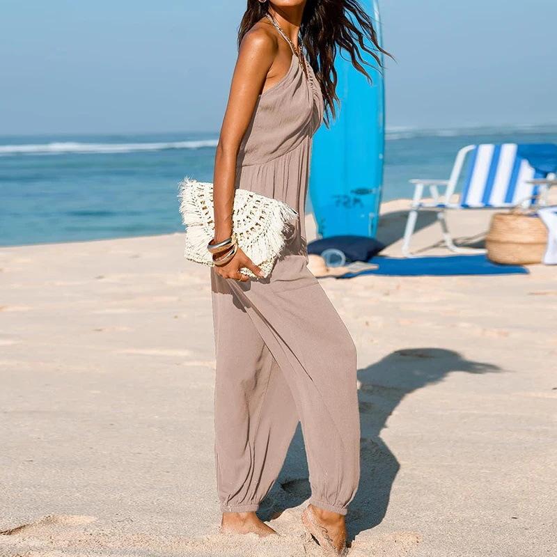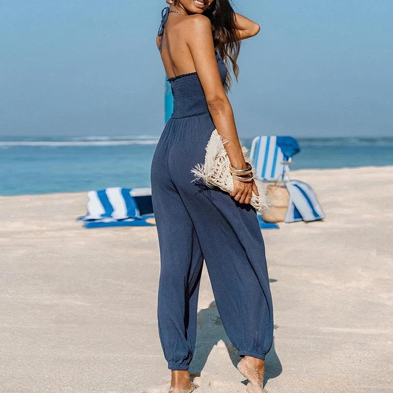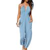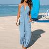 Mono sexy plisado con cuello en V profundo para mujer, Moda de verano 2025, Color sólido, Bolsillo, Espalda hueca sin espalda